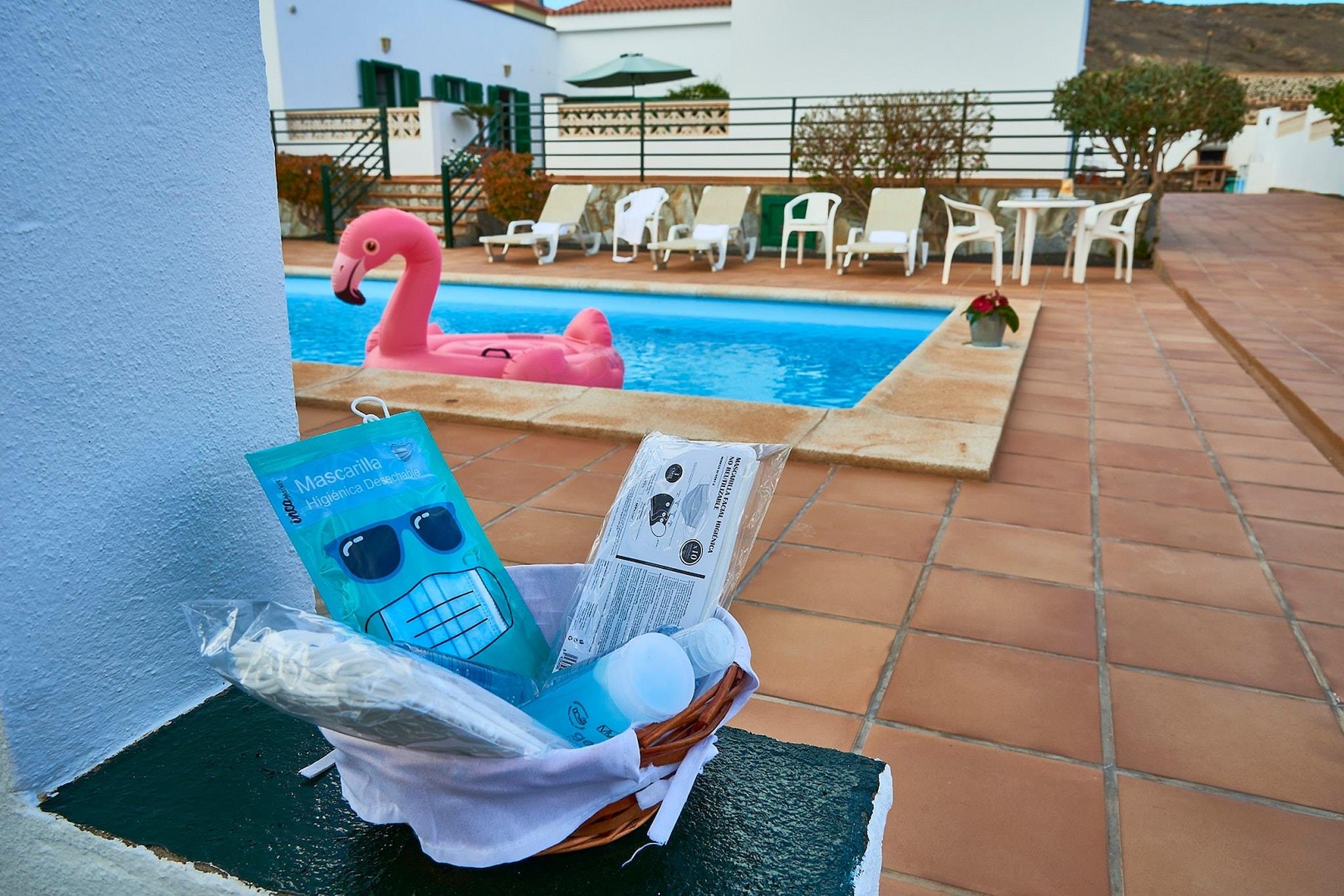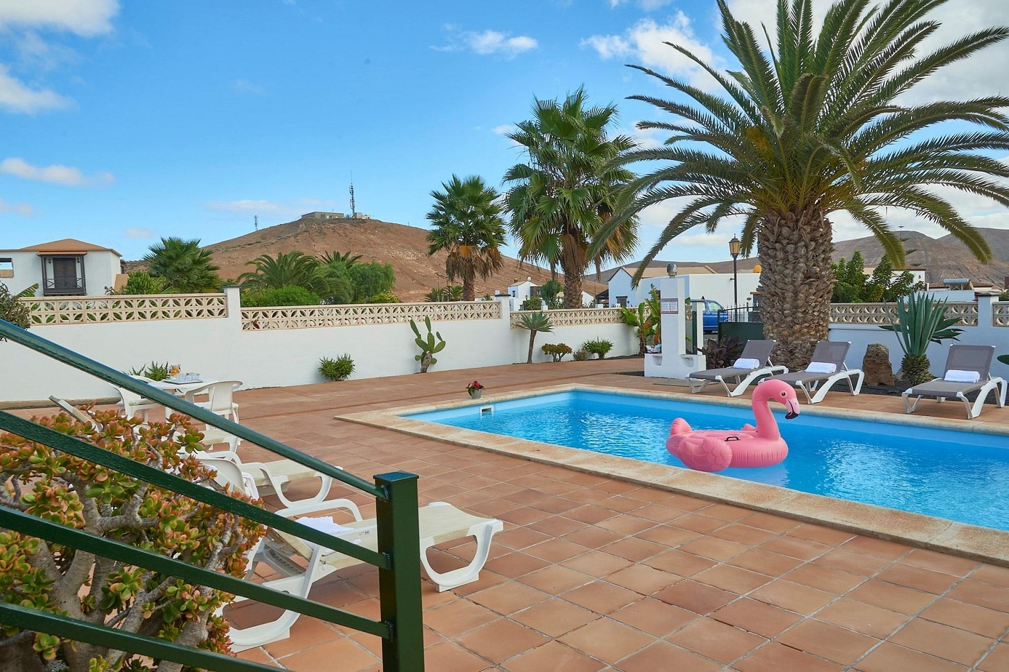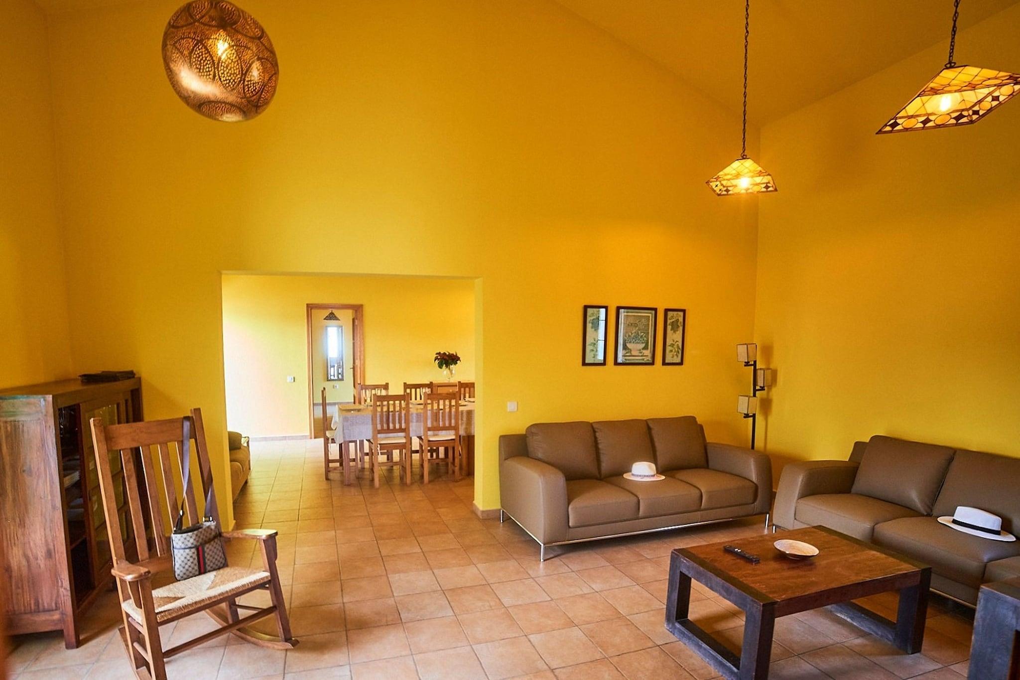 Dette rummelige hus inviterer dig til at nyde en dejlig ferie i Fuerteventura. Det gode vejr hele året og den rolige beliggenhed væk fra travlhed med turistattraktioner er blot nogle af fordelene ved dette vidunderlige sted. Huset er bygget i en U-form med to terrasser i midten; ideel til morgenmad eller middag med udsigt over vulkanen. Den storslåede saltvandspool har et termisk system, der gør den halvopvarmet, så du kan nyde det hele året rundt. La Oliva ligger 1 km væk, det er en lille by nord for Fuerteventura. Når du besøger området, kan du nyde den smukke udsigt over det ekstraordinære vulkanske landskab. Den nærmeste strand er mod øst i Barranco de Tinojay (13,5 km). For en smuk solnedgang skal du uden tvivl gå vestpå; stærkt anbefalet El Cotillo (16 km) med en smuk robust kystlinje med skjulte strande, hvor du kan se solen gemme sig i havet. I byen er der flere restauranter, der afslutter dagen med en lækker tallerken med frisk fisk. For mere underholdning, besøg den berømte kystby Corralejo, 15 km væk. Turist, ja, men øens paradis for surfere. For mere erfarne surfere er der i nord mange andre steder at erobre bølgerne.
