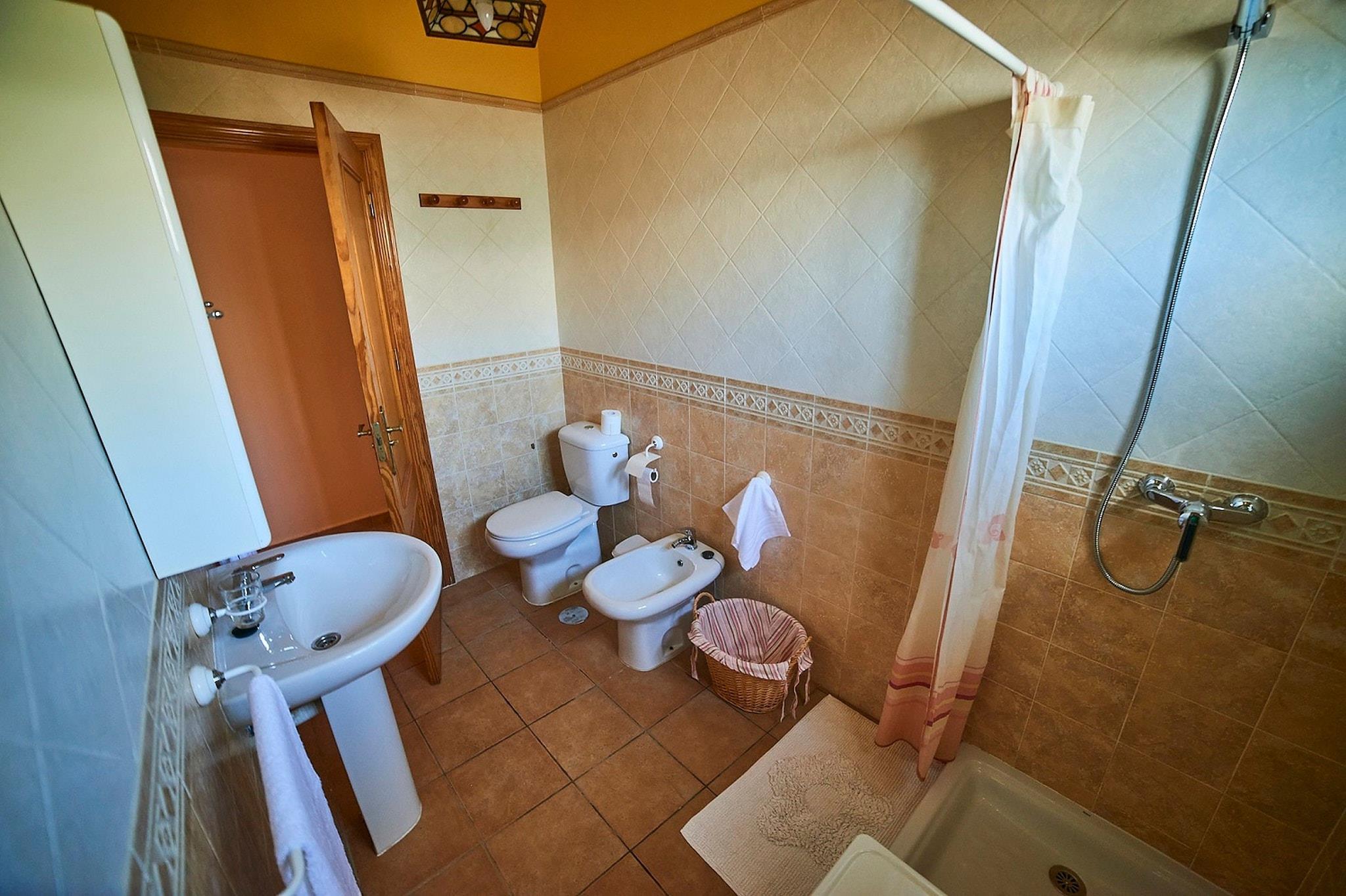 Stueetage: (Indgang , Stue(sofahjørne, køle-fryseskab), spisestue(spisebord(10 personer)), Køkken(spisebord, brødrister, komfur(Komfur med fire kogeplader, induktion), ovn, mikrobølgeovn, opvaskemaskine , køle-fryseskab), soveværelse(enkeltseng(90 x 190 cm), enkeltseng(90 x 190 cm)), soveværelse(2x enkeltseng(90 x 190 cm)), soveværelse(2x enkeltseng(90 x 190 cm)), Soveværelse med badeværelse(dobbeltseng(135 x 190 cm), badekar med bruser, håndvask, toilet, bidet), Soveværelse med badeværelse(dobbeltseng(135 x 190 cm), badekar med bruser, håndvask, toilet, bidet), badeværelse(badekar med bruser, håndvask, toilet, bidet), badeværelse(badekar med bruser, håndvask, toilet, bidet), klimaanlæg) solarium, terrasse, terrasse, havemøbler, solstole, grill(trækul), Parasol, swimmingpool(privat, naturlig svømmedam, 8 x 5 m., opened from Jan upto and including Dec), barneseng, barnestol