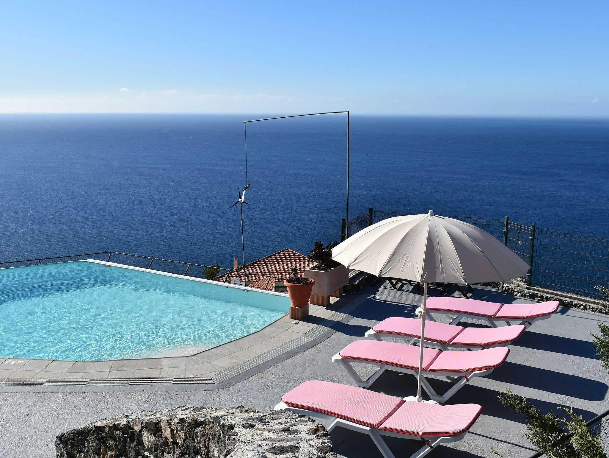 Über eine Rampe erreichen die Gäste von hier aus die tolle Poolebene. Neben einem schönen Swimmingpool mit Mosaikfliesen und einzigartigem Ausblick finden sich hier weitere Liegen, ein Sonnenschirm und ein Grill.