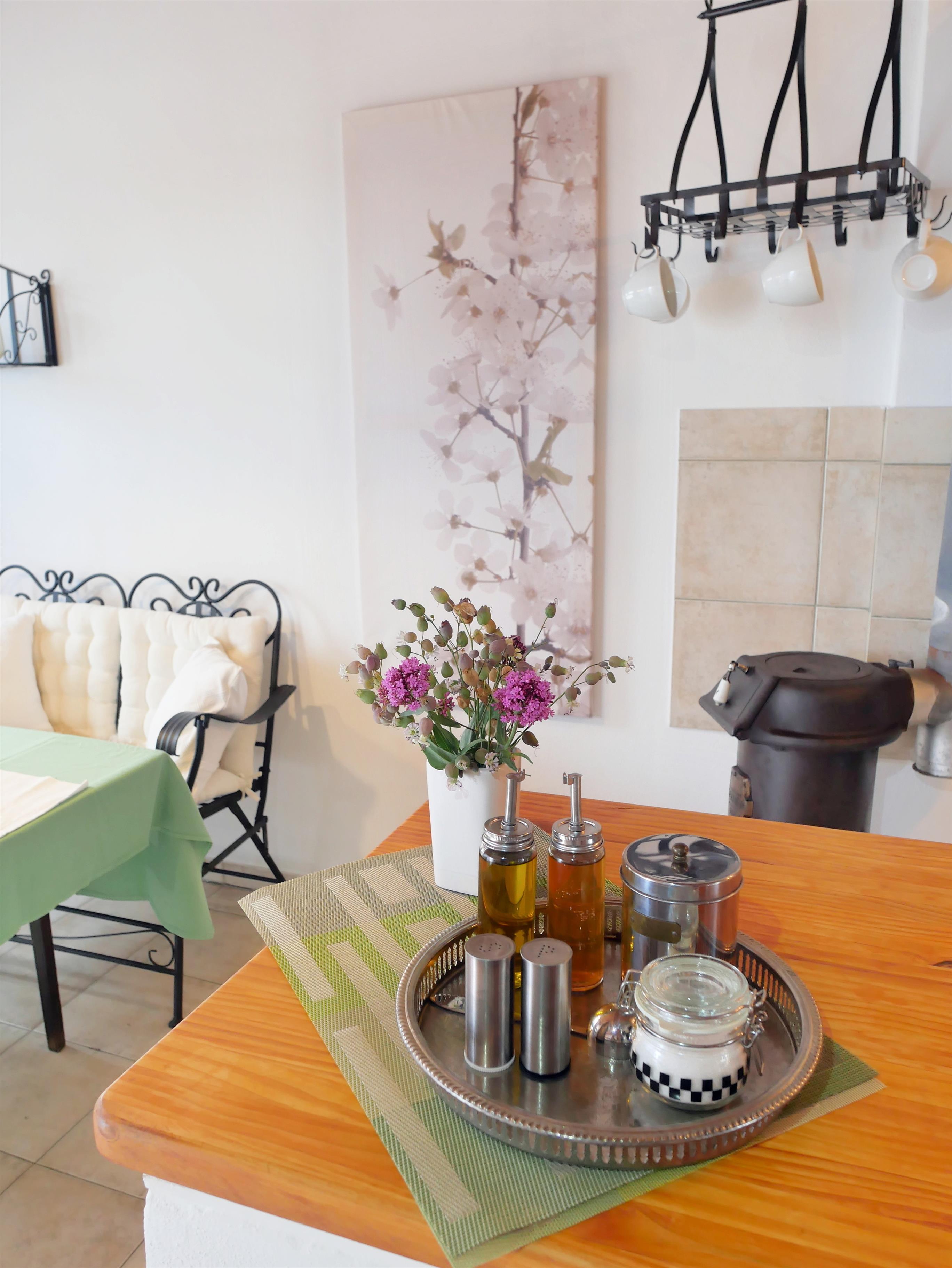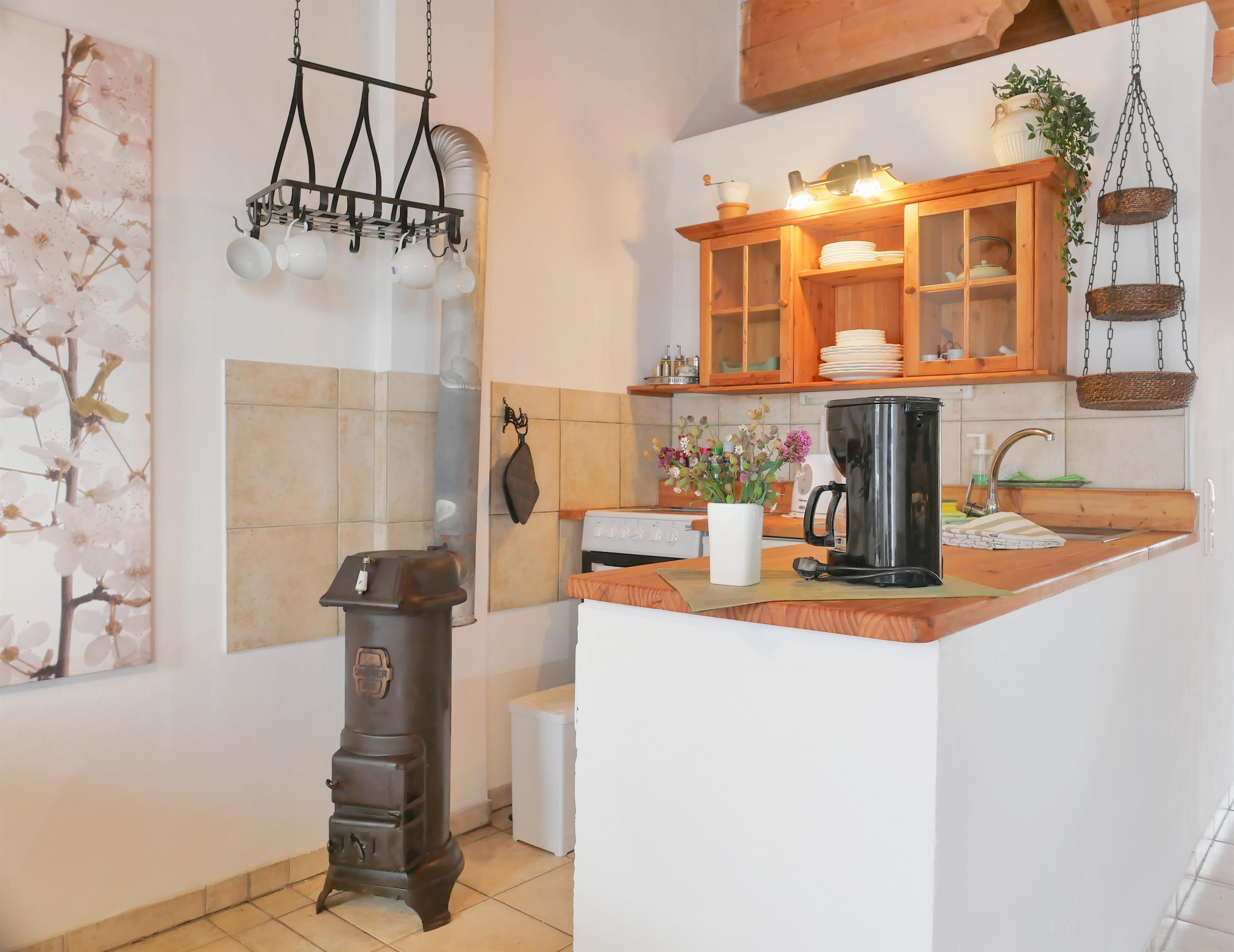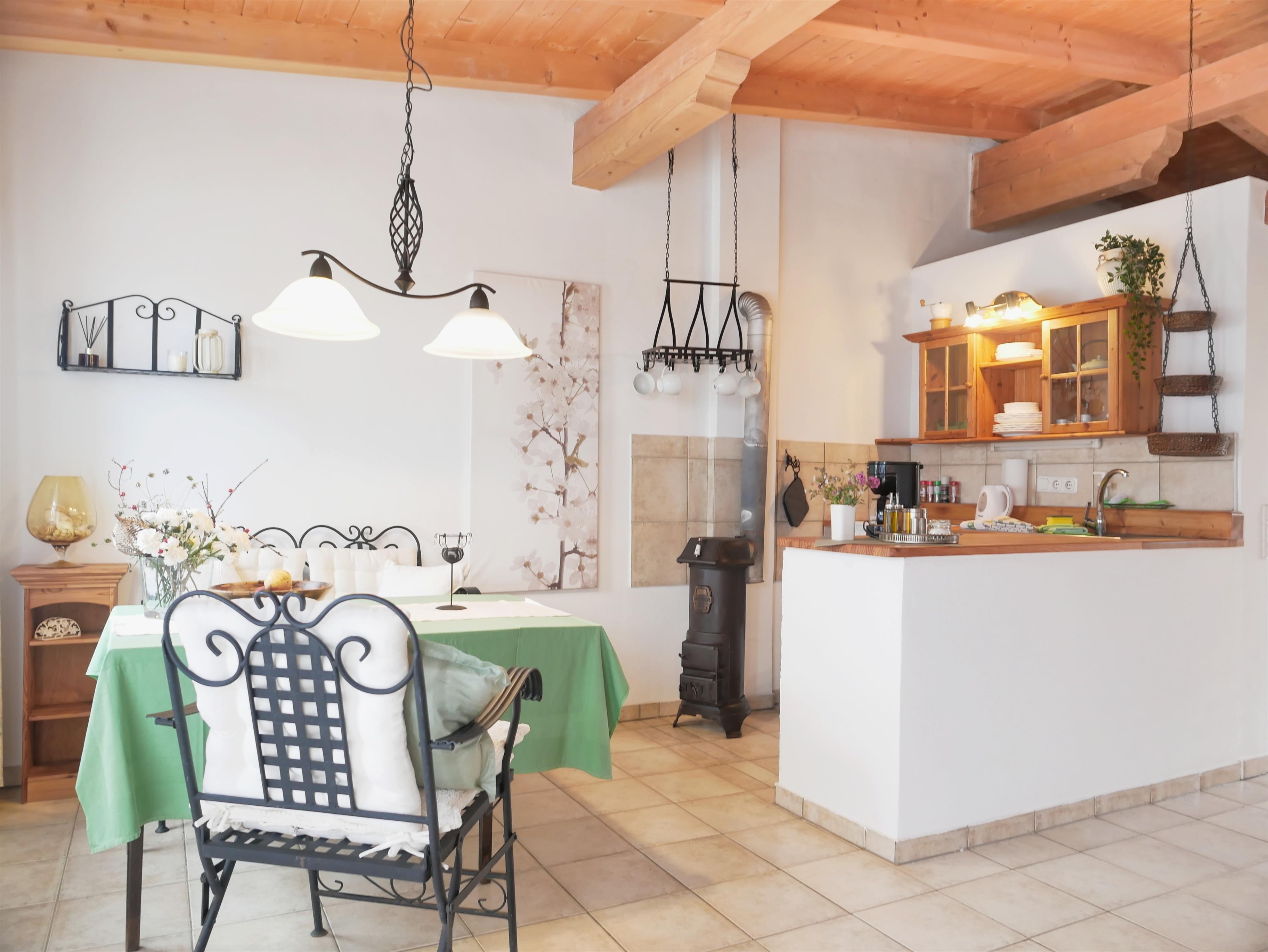 Es erwartet Sie eine voll ausgestattete, gemütliche und gerade neu renovierte Wohnung mit einem großzügigem Wohnbereich, einer halboffenen Küche sowie einer Essecke. Die Einrichtung ist im modernem Landhausstil gehalten mit zarten Erdtönen, die Böden sind durchgängig gefliest. Ein Ecksofa mit ausziehbarer Funktion für den dritten Gast, ein TV Bereich mit seitlichen Vitrinen und ein großer Esstisch mit Bank und Sessel am Fenster machen das Ambiente komplett. Für gemütliche Abende gibt es Bücher, Spiele und eine Stereo-Anlage. Für kältere Abende ist mit Wärme in Form eines rollbaren Gasofens oder eines alten gusseisernen Holzofen gesorgt.