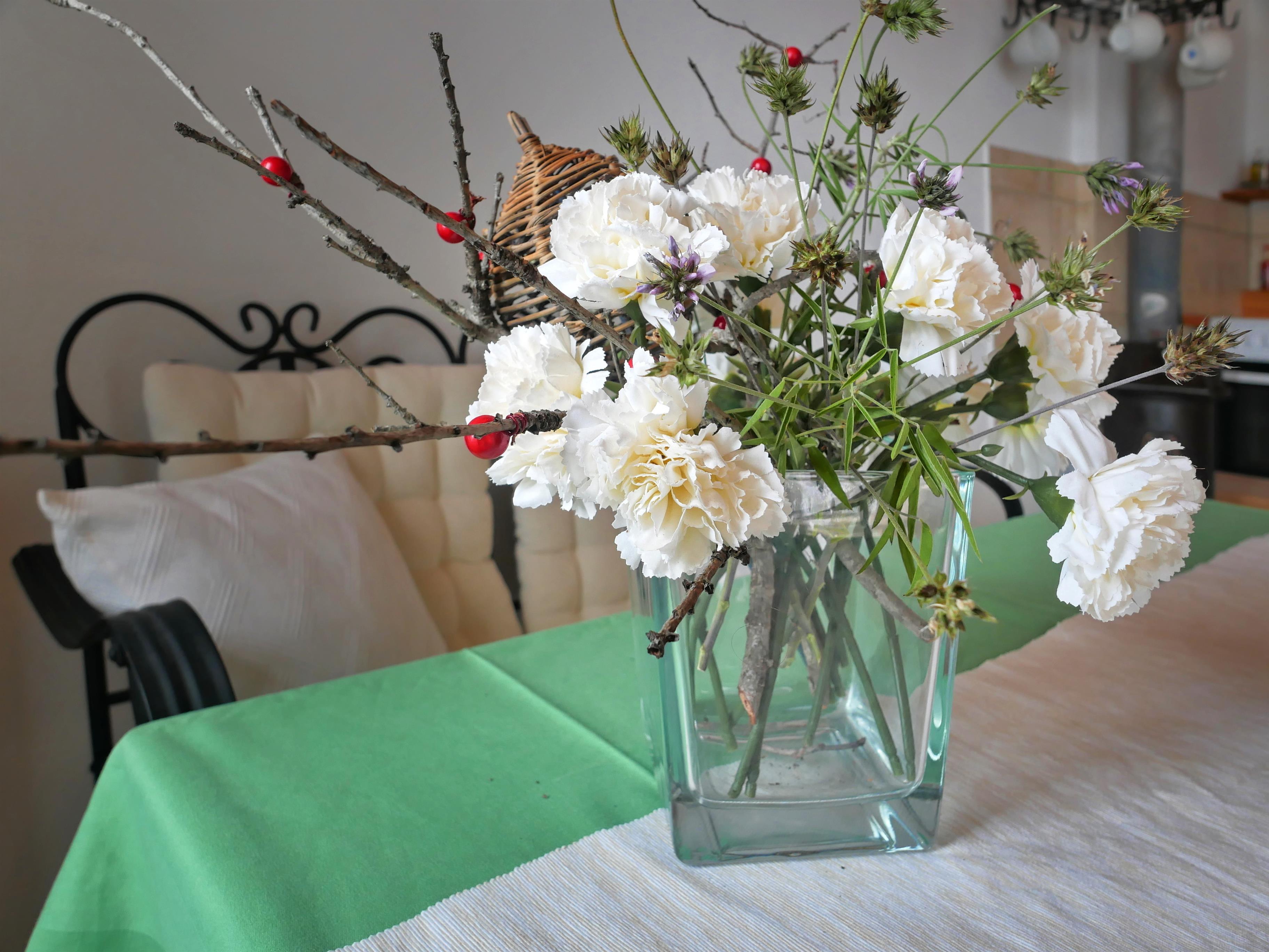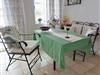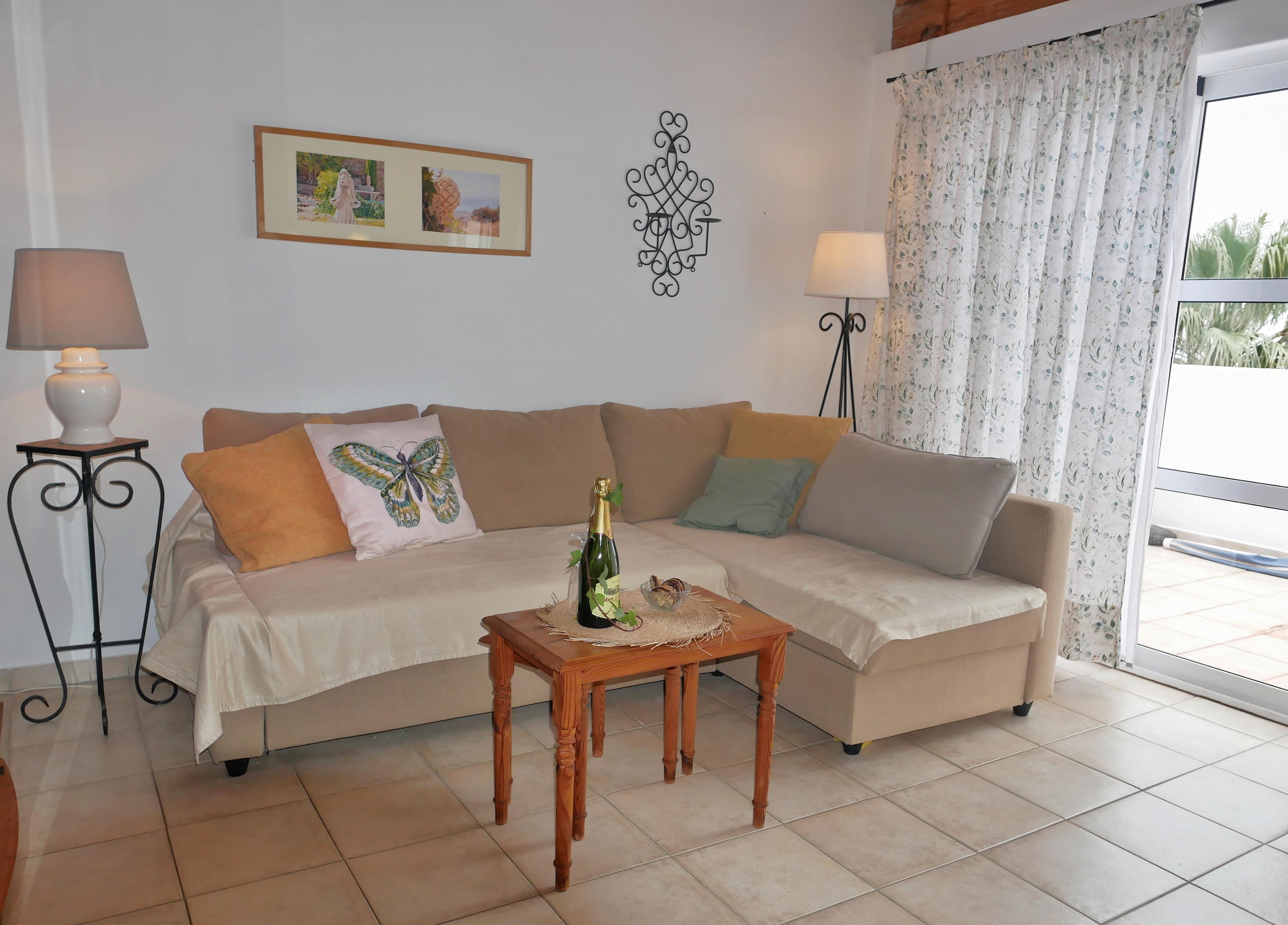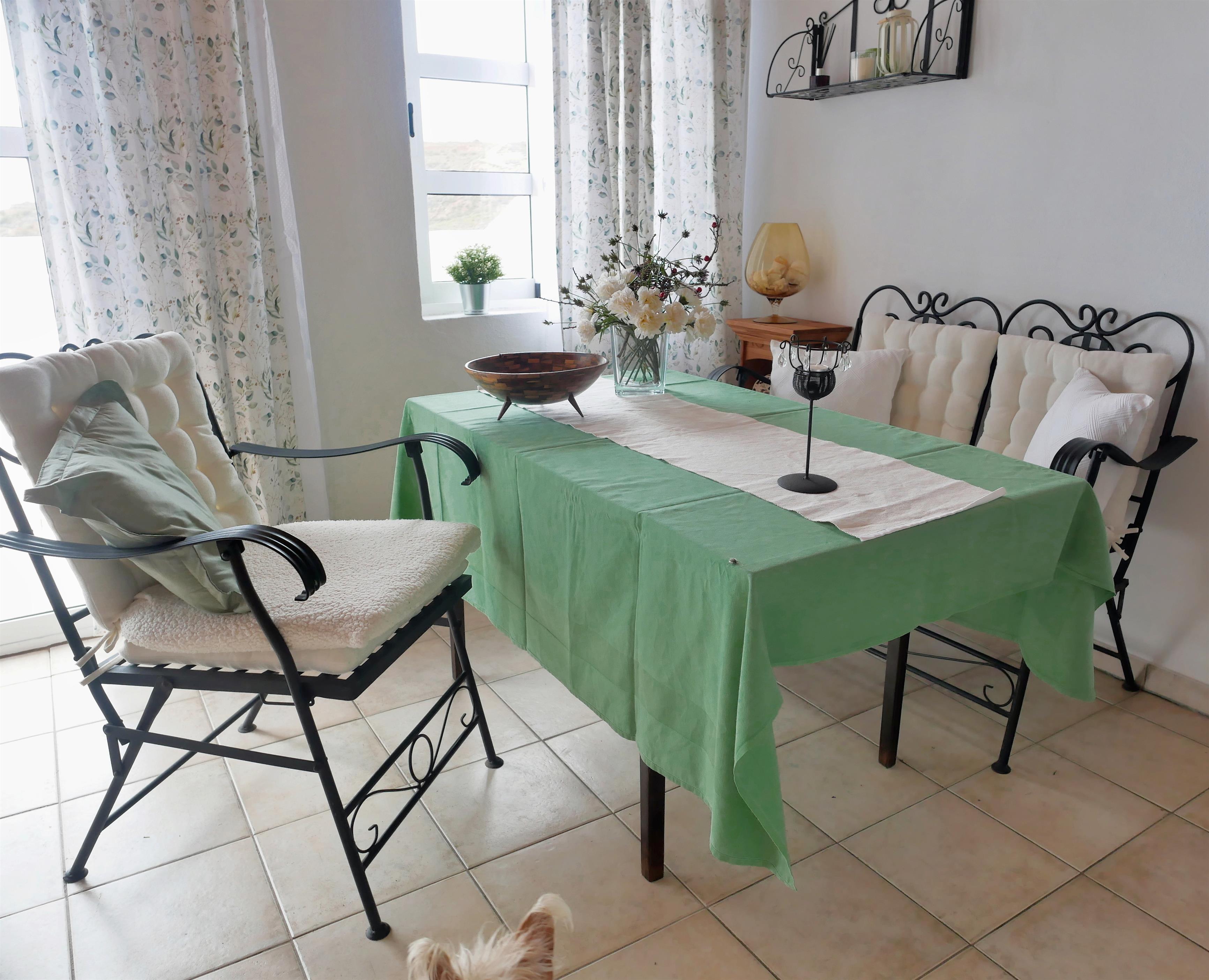 Es erwartet Sie eine voll ausgestattete, gemütliche und gerade neu renovierte Wohnung mit einem großzügigem Wohnbereich, einer halboffenen Küche sowie einer Essecke. Die Einrichtung ist im modernem Landhausstil gehalten mit zarten Erdtönen, die Böden sind durchgängig gefliest. Ein Ecksofa mit ausziehbarer Funktion für den dritten Gast, ein TV Bereich mit seitlichen Vitrinen und ein großer Esstisch mit Bank und Sessel am Fenster machen das Ambiente komplett. Für gemütliche Abende gibt es Bücher, Spiele und eine Stereo-Anlage. Für kältere Abende ist mit Wärme in Form eines rollbaren Gasofens oder eines alten gusseisernen Holzofen gesorgt.