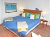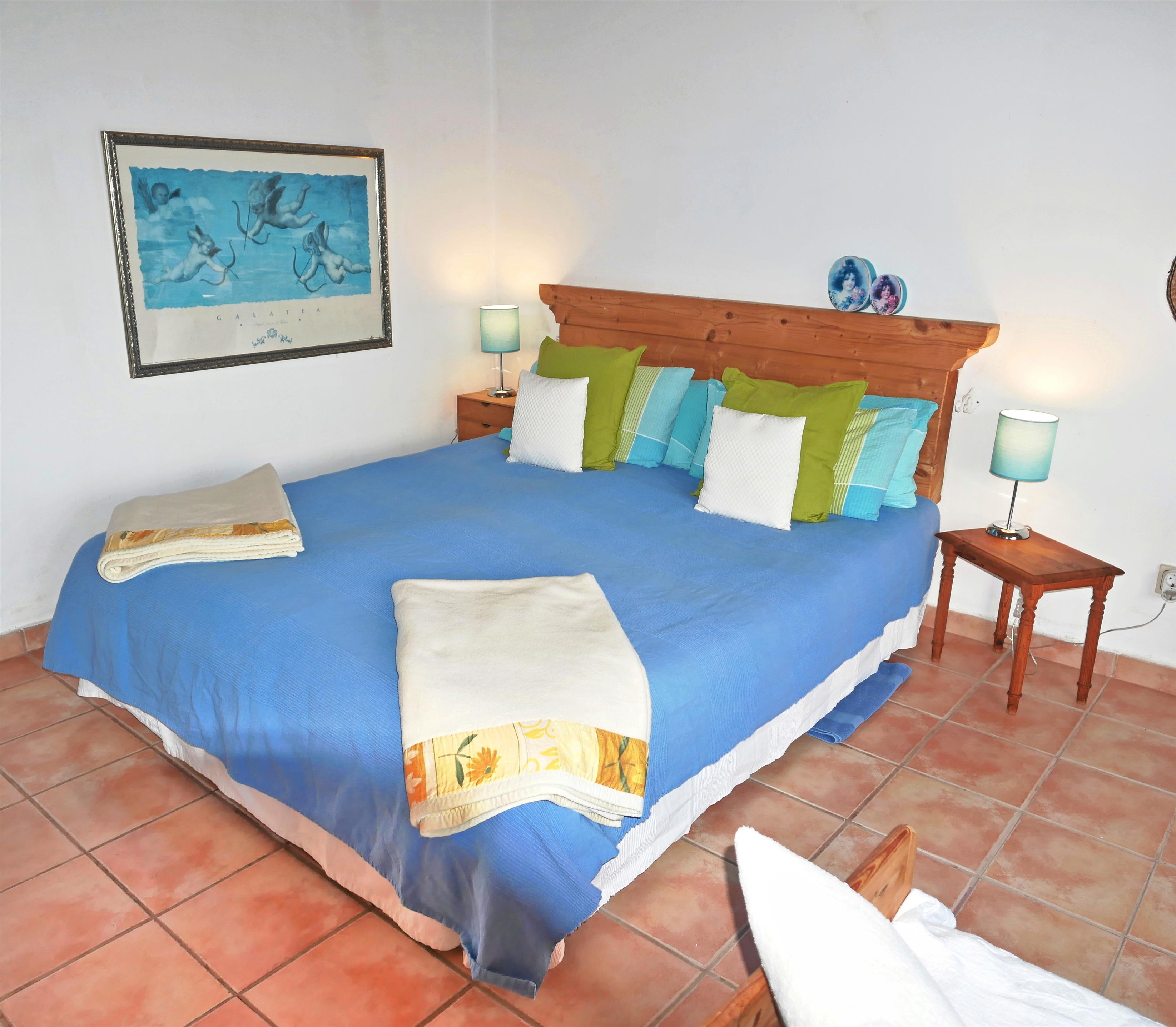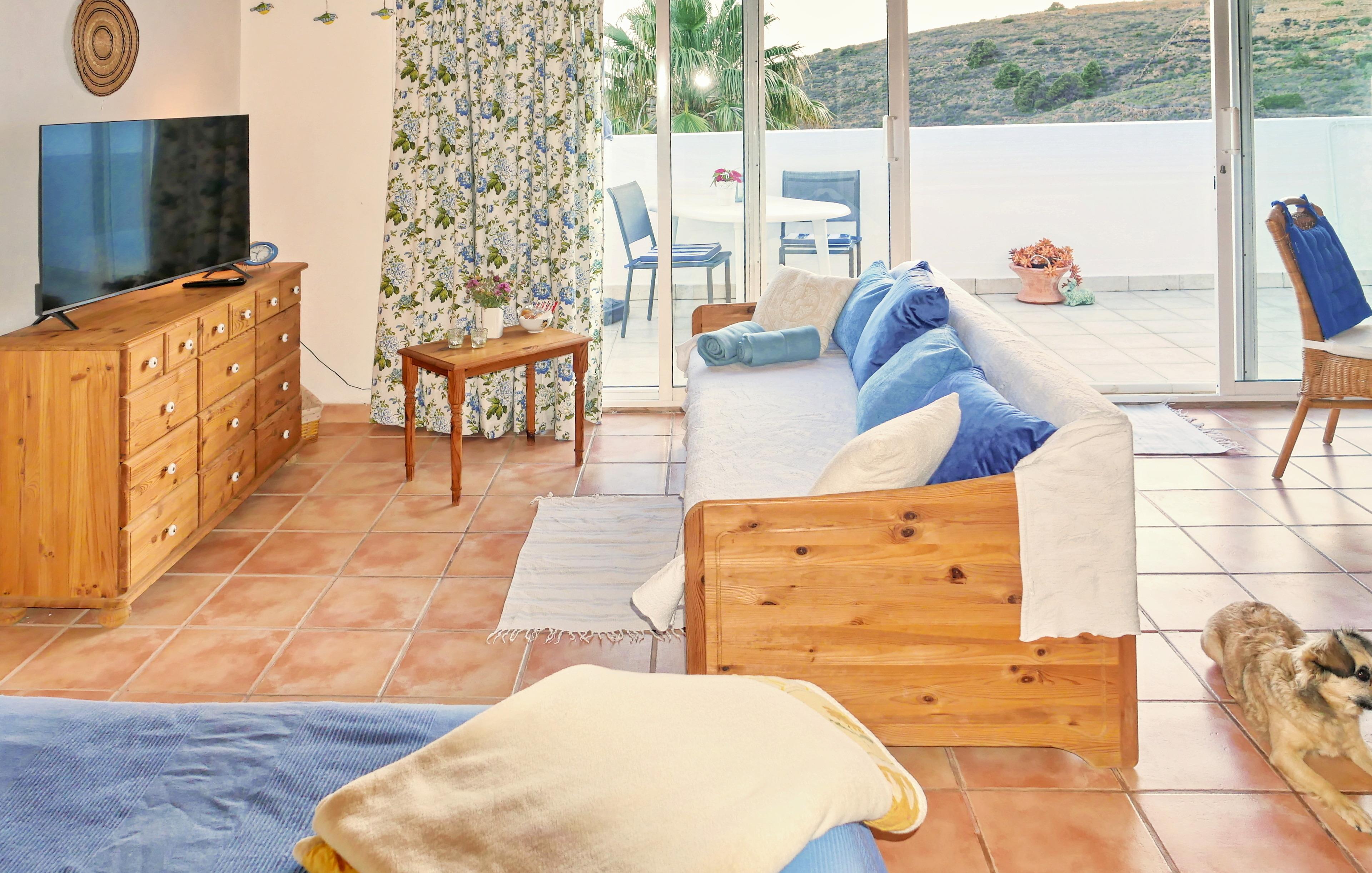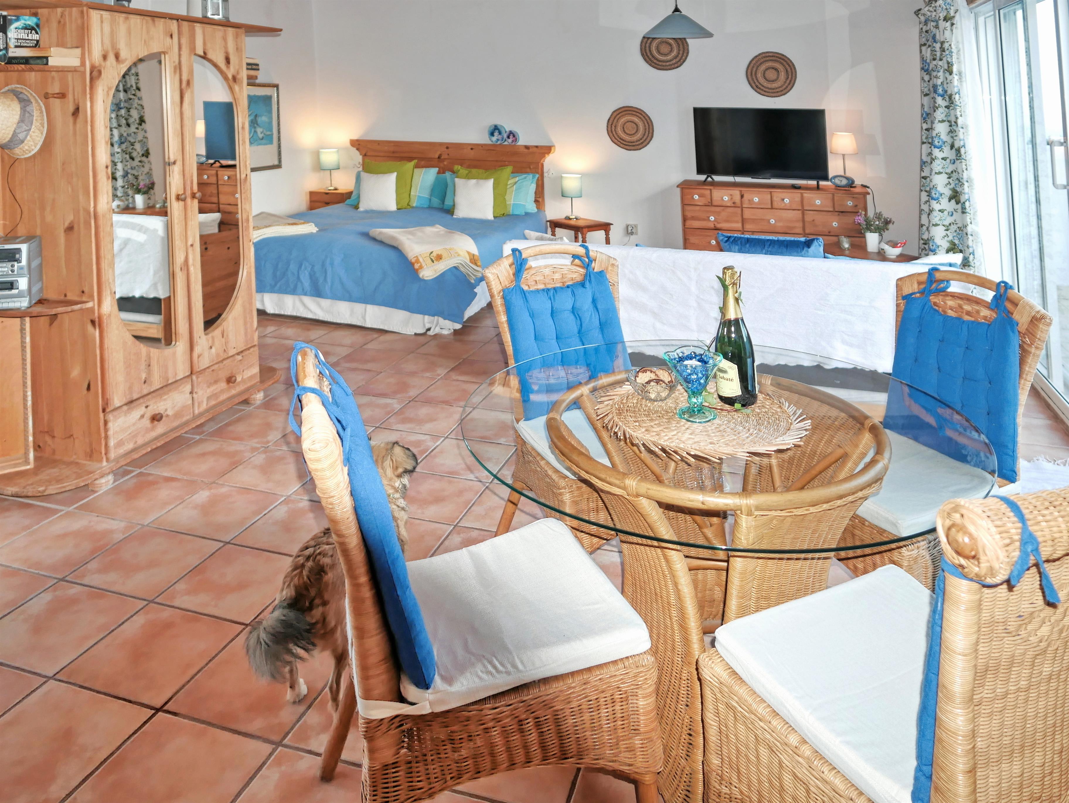 Die Casa Azul ist die linksseitig gelegene Wohneinheit der Finca Pino Gordo, ist 42 m² groß und ein großzügig aufgeteiltes und ebenfalls lichtdurchflutetes Einraum-Apartment. Die Möbel sind aus hellem naturbelassenem Vollholz und die Landhausgardinen in Blau-beige mit zartem Grün.