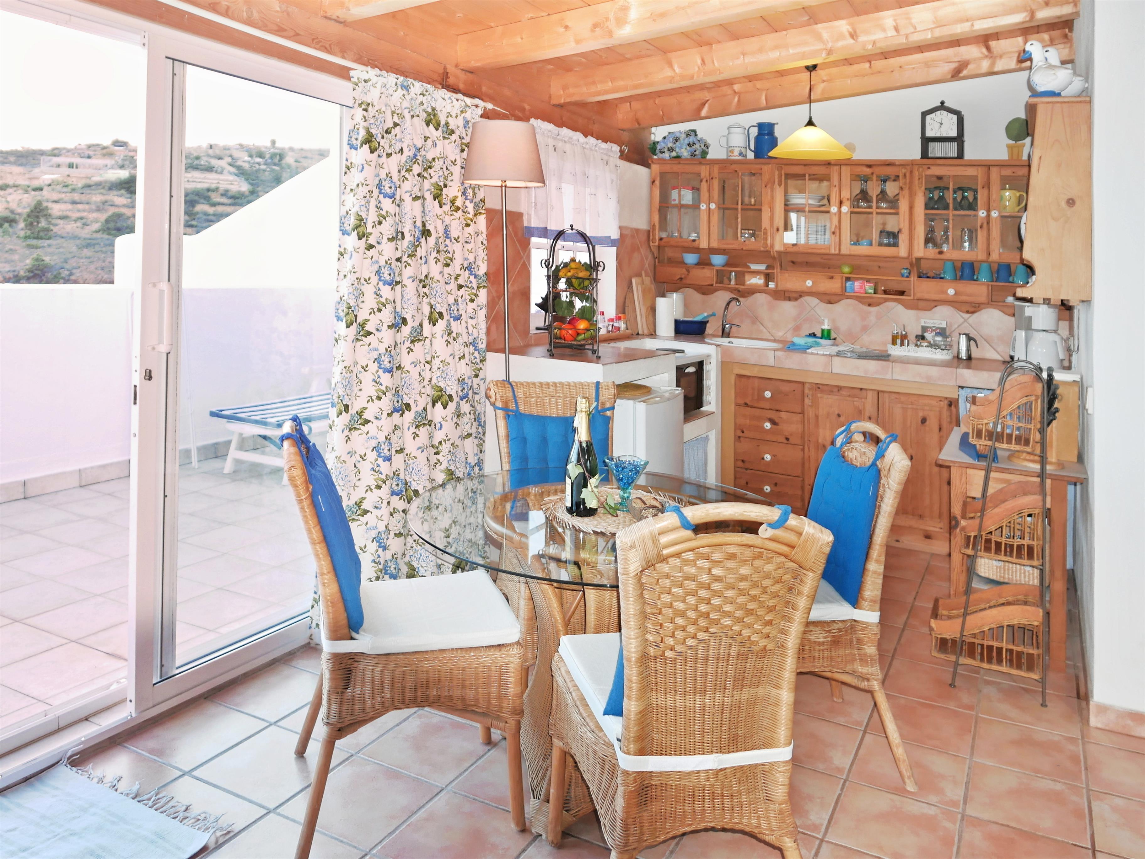 Die offene Holzküche wird erweitert durch einen großen, runden Glastisch mit vier Stühlen. In dieser Küche gibt es nur eine kleine Kochplatteneinheit mit zwei Elektroplatten, aber es fehlt nichts an Küchenutensilien