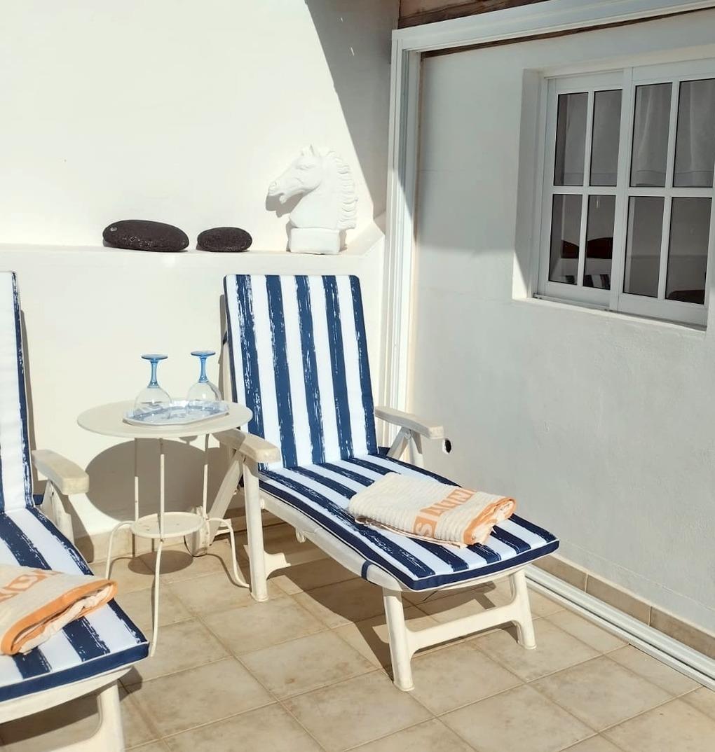 Der Balkon ist mit Sonnenliegen und einem Esstisch mit vier Stühlen ausgestattet. ausgestattet.