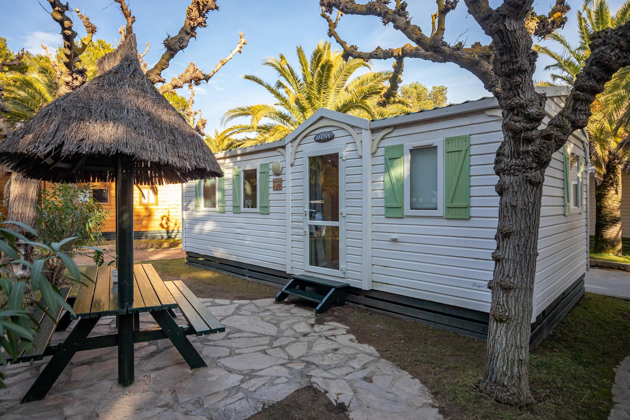 Velkommen til denne exceptionelle campingplads, beliggende langs en fantastisk kystlinje berømt for sit lavvandede turkisblå vand og bløde sandstrande. Nyd afslappende dage under palmerne med familie eller venner, mens du nyder lækre tapas, forfriskende sangria og traditionel paella. Tag dig tid til at udforske den fortryllende region, inklusive charmerende landsbyer, den historiske by Tarragona og den spændende forlystelsespark Port Aventura, kun 15 minutter væk. Torre del Sol tilbyder direkte adgang til en privat strand med fint sand, der strækker sig cirka 1 km langs Middelhavet. Dette idylliske område, med sin indbydende atmosfære og muligheder for afslapning og leg, er omhyggeligt vedligeholdt og overvåget i juli og august for din ro i sindet. Vores hyggelige sommerhus har plads til op til seks gæster og har tre komfortable soveværelser inden for 30 m² boligareal. Du vil nyde bekvemmeligheden ved en privat have og parkering i nærheden, sammen med moderne faciliteter som en mikrobølgeovn for ekstra komfort. Et depositum på EURO50 opkræves ved ankomst. Oplev den perfekte blanding af afslapning og eventyr på dette smukke oase ved havet!