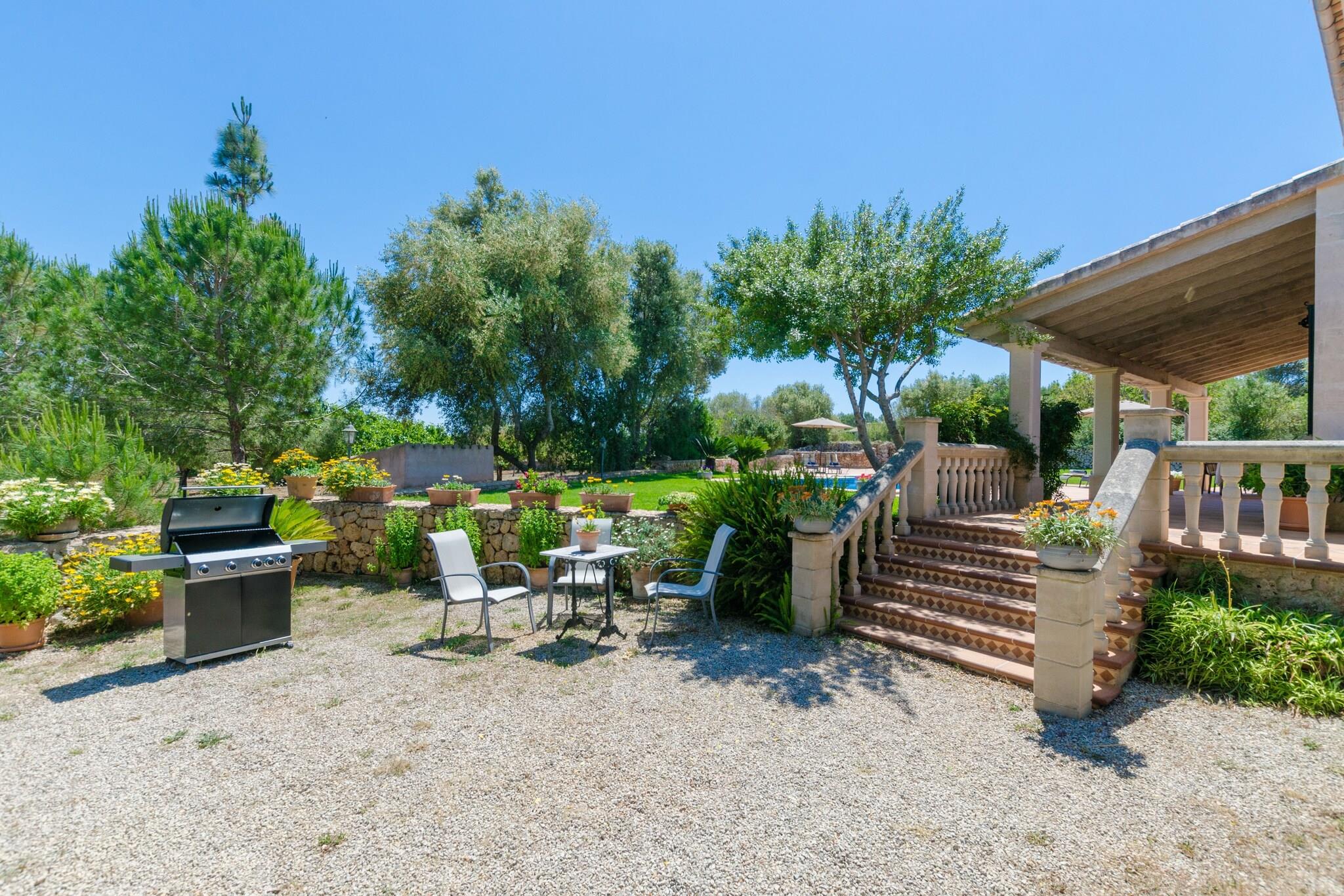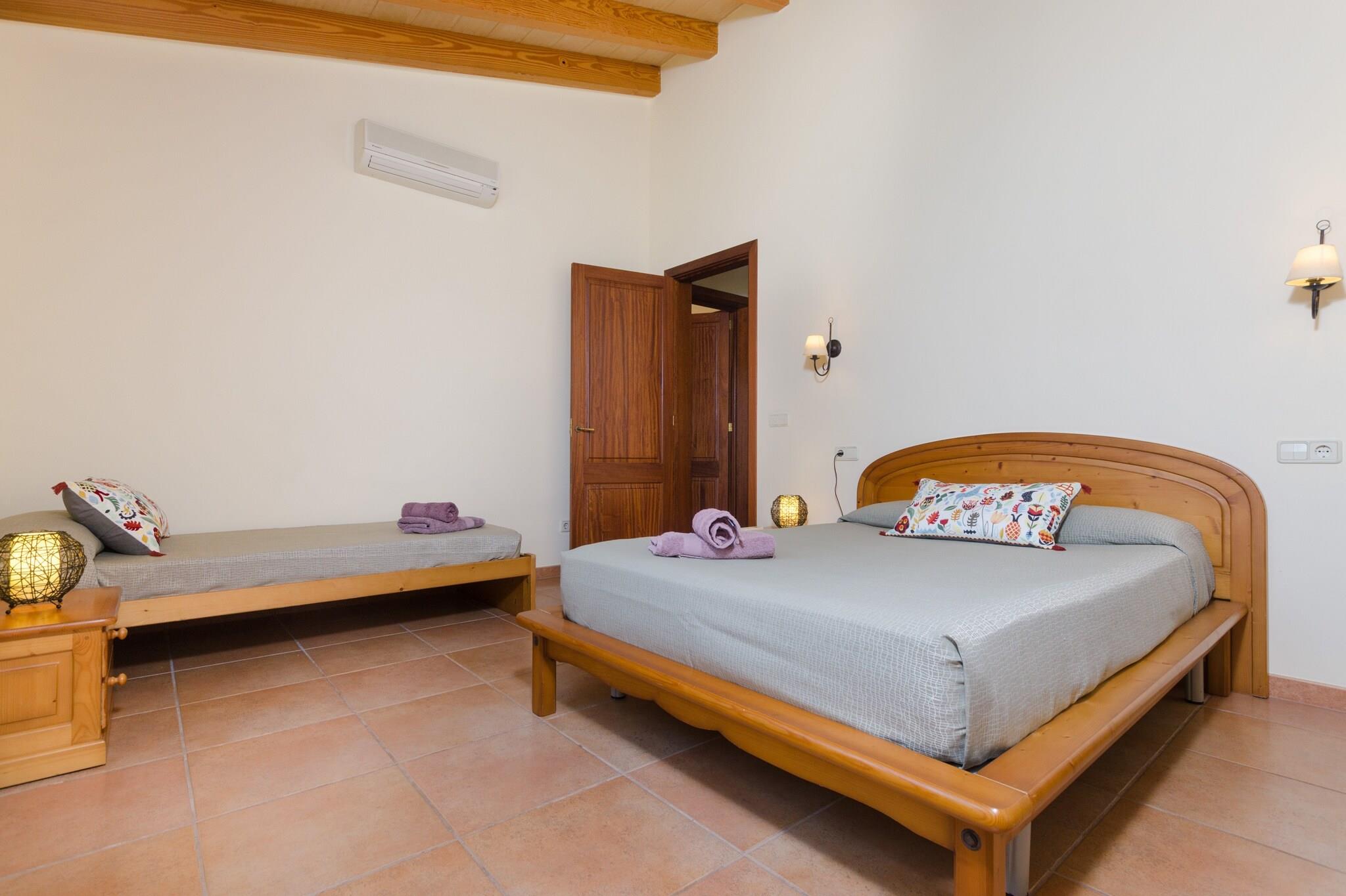 Slap af i rolige landskabelige omgivelser, hvor den private 9x5m pool er i centrum, omgivet af en grøn græsplæne og seks liggestole perfekt til lange eftermiddage i solen. En skyggefuld veranda tilbyder det ideelle sted til grill og udendørs spisning, hvilket gør aftenen lige så afslappende som dagene. Med masser af friluftsrum og udsigt over det rustikke to-etagers hjem føles hvert øjeblik udenfor forfriskende og roligt. Indvendigt blander villaen moderne komfort med varmt design. Det rummelige opholds- og spiseområde, komplet med aircondition, satellit-tv og musikanlæg, skaber et indbydende rum for familier og venner. Et fuldt udstyret køkken med gaskomfur, sammen med vaskefaciliteter, gør længere ophold ubesværet. Tre soveværelser, hver med dobbeltsenge og opbevaring, suppleres af tre badeværelser - to af dem en-suite - for ekstra privatliv. Centralvarme, aircondition, barneseng og høj stol sikrer komfort året rundt for alle gæster. Villaen er beliggende kun 2,4 km fra Lloret de Vistalegre og tilbyder nemme forbindelser på tværs af Mallorca. Den charmerende landsby Sineu, med sit ugentlige marked, ligger få minutter væk, mens Palma og strandene i Can Picafort er inden for en kort køretur. Gæsterne kan nyde autentisk mallorcansk spisning i nærliggende landsbyer eller udforske en række restauranter i Palma, kendt for sin blanding af tapasbarer og moderne køkken. Med golfbaner, kulturelle byer og sandstrande i nærheden gør denne villa det nemt at udforske øen.