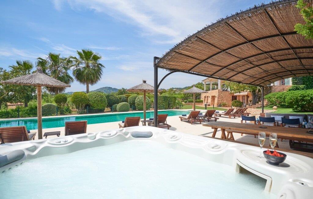 "Luksus Golf d'Or"-villaen er en sand gave til enhver, der ønsker at tilbringe deres ferie i fuldstændig privatliv uden at skulle give afkald på et godt hotel. Disse krav kan nemt kombineres på dette tidspunkt. I de utrolige 500 m² boligareal kan I dele op i små eller store grupper, som I ønsker og stadig føle jer uforstyrret og samtidig bestille værelsesrengøring og morgenmadsservice. Ejendommen på 6.000 m² minder om en paradisisk have med græsplæner, smukke planter, små stier og små mure. Der er indbydende siddepladser rundt om huset i solen eller i skyggen, så I kan gå på opdagelse og dvæle på en række smukke steder, som I ønsker det. Havens højdepunkt er poolområdet med en meget elegant pool og den tilstødende, delvist overdækkede solterrasse. I kan slappe af af hjertens lyst på de højkvalitets liggestole og nyde en forfriskende svømmetur i hele den 18 m lange pool. En forfriskende udendørs bruser og et moderne spabad runder dette wellness-område luksuriøst af. Hvor er det en fornøjelse at ligge i den friske luft i spabadet når som helst på dagen eller natten! En lille sti fører fra poolen til huset, som har en trendy udendørs lounge på siden, der inviterer jer til at slappe af og nyde den fantastiske udsigt fra de komfortable sofaer. Den gulmalede facade, den grønne efeu og forteltet fremtryller vidunderligt lys og en meget behagelig atmosfære. Fra det ene hjørne af huset kan I få adgang til endnu en terrasse med et stort græsareal, som helt sikkert vil blive en legeplads for alle børn, der rejser med jer. Flere himmelvendte trin fører til den store altan, som rummer et alsidigt udvalg af møbler, der passer til en lang række behov. Her finder I et stort spisebord ved siden af endnu en chill-out-zone med forskellige moderne siddepladser, som alle har én ting til fælles: en fantastisk udsigt over havet. Men der er mere. På den indhegnede side af huset er der et tilstødende område med en indbygget grill foran og et kæmpe massivt træbord foran. Hvorfor ikke mødes med vennerne og have en hyggelig grillaften? Når I træder ind i huset, bliver I mødt af en usædvanlig hjemlig atmosfære og indhyllet i en æstetisk tiltalende boligstemning. Elegante individuelle stykker og materialer af høj kvalitet overrasker i en meget harmonisk kombination. En stor stue/spisestue byder på et spisebord til otte personer og et yderst behageligt sofahjørne. Fladskærms-tv'et er også bekvemt placeret i stuen. På køligere aftener kan I endda slappe af ved pejsen og sidde ved varmen fra et bål. Det lyse og venlige køkken er fuldt udstyret med køleskab, ovn, komfur, opvaskemaskine, brødrister, elkedel og kaffemaskine. Der er også mulighed for at få et måltid til fire personer. Yderligere spise- og opholdsrum supplerer den tidligere beskrivelse på mange måder, så selv en stor gruppe rejsende nemt kan finde deres eget private tilbagetog. Soveværelserne (alle fem dobbeltværelser har eget badeværelse, hvoraf tre har hydromassagebadekar) er rummelige, udstyret med møbler af høj kvalitet og har et elegant design. Fraværet af mange distraherende tilbehør giver disse rum et lyst og raffineret udseende, som utvivlsomt opfordrer jer til at søge en behagelig hvile. Det smagfulde design kommer også til sin ret i soveværelserne. Disse præsenterer sig selv i en ultramoderne stil, er meget funktionelle og generøst proportionerede. Portocolom (4,4 km) er en lille kystby. Takket være den lille gamle bydel og havnen er det meget malerisk, og turismen er ikke rigtig taget fart her endnu. Cala D'Or (9 km) byder på et livligt stykke byliv med et udvalg af barer, restauranter, en marina og flere små strande. Andre smukke badebugter kan også nemt nås fra villaen. Vall D'Or golfbanen, som også har en god restaurant, ligger cirka 700 m fra villaen. Villaen “Luxury Golf d'Or” er en eksklusiv og romantisk ejendom med havudsigt, beliggende på østsiden af øen, direkte på en golfbane og kun cirka 10 minutter i bil fra Portocolom. Det er en attraktiv by med en lille gammel by og en havn. De smukke strande på østkysten kan nås hurtigt fra villaen.