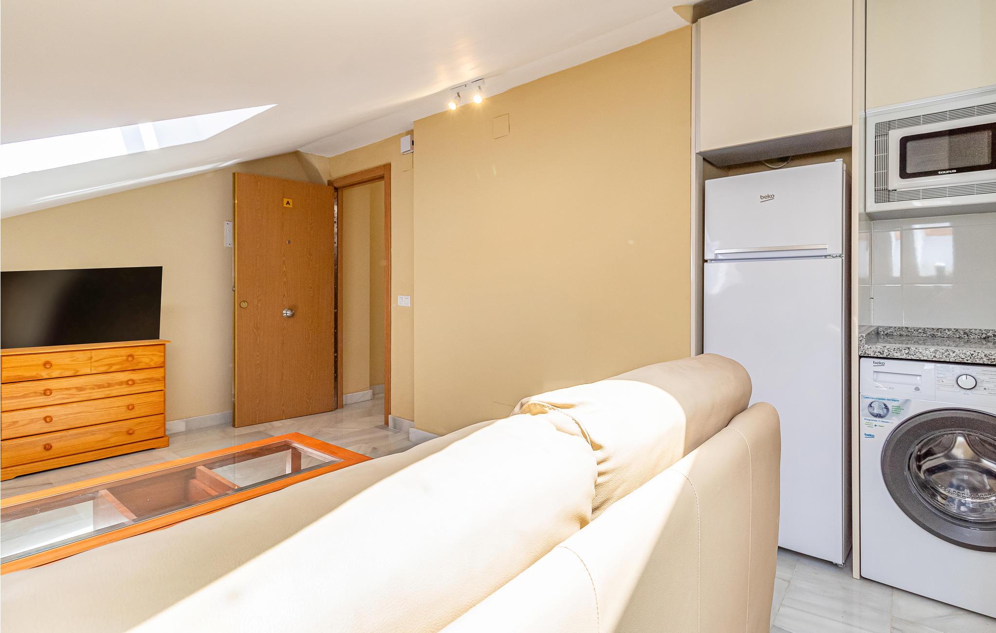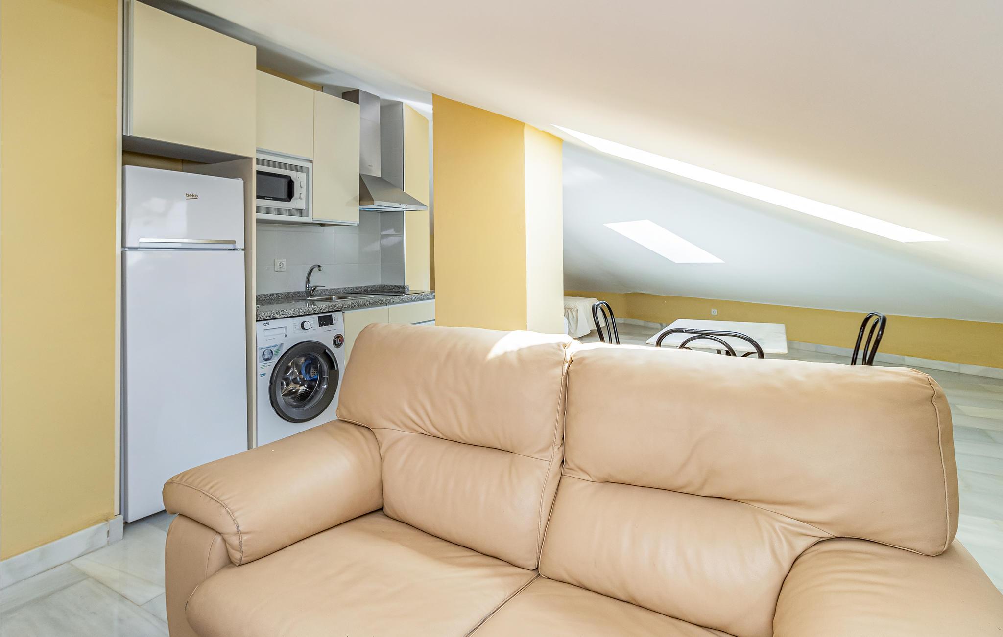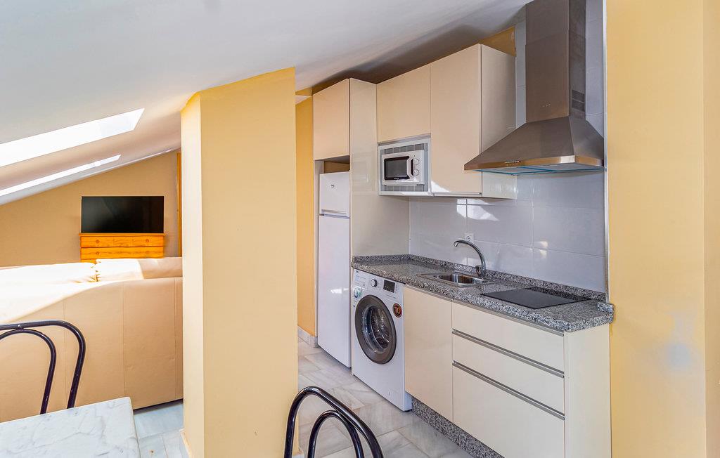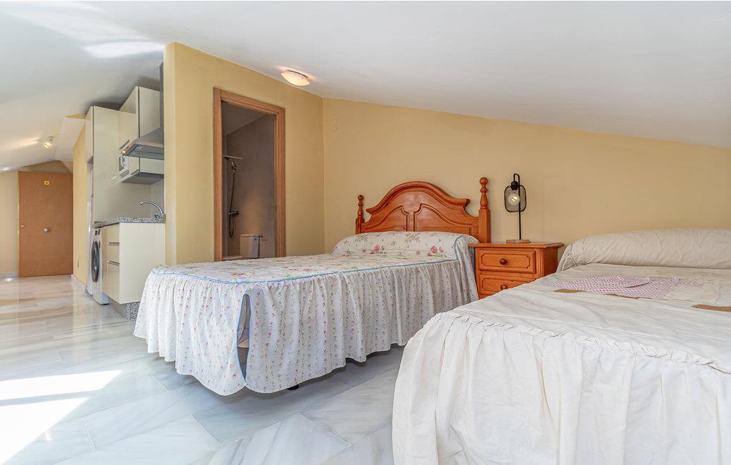 Nyd en ferie i smukke Málaga med base i denne smukke lejlighed til tre personer. Lejligheden er lys og praktisk indrettet, ligger på syvende etage og er opdelt i et soveværelse, et badeværelse, en stue og et tekøkken. I kan samles i stuen i lejligheden til en hyggelig aften og se tv eller planlægge feriens aktiviteter sammen. Den flot renoverede penthouselejlighed har skrå lofter med store vinduer, som skaber et smukt lysindfald i soveværelset og stuen.