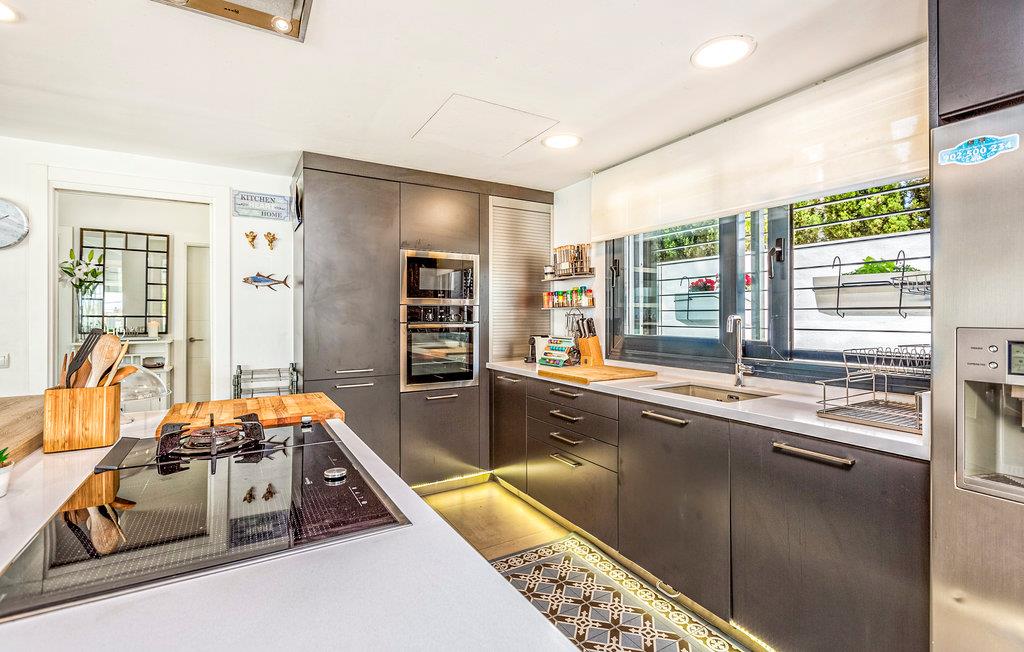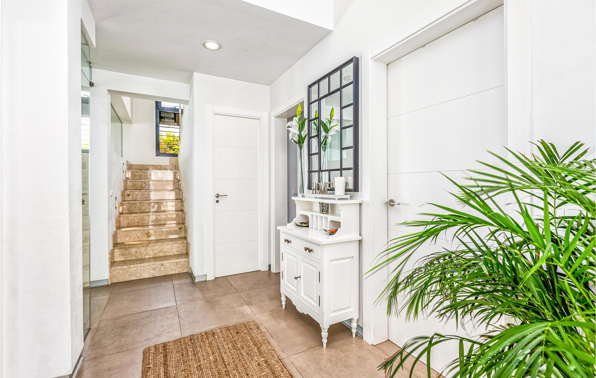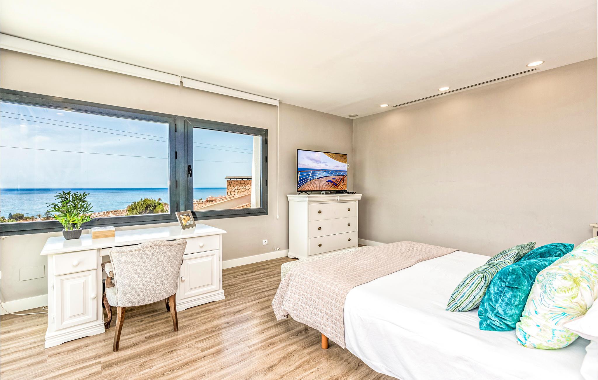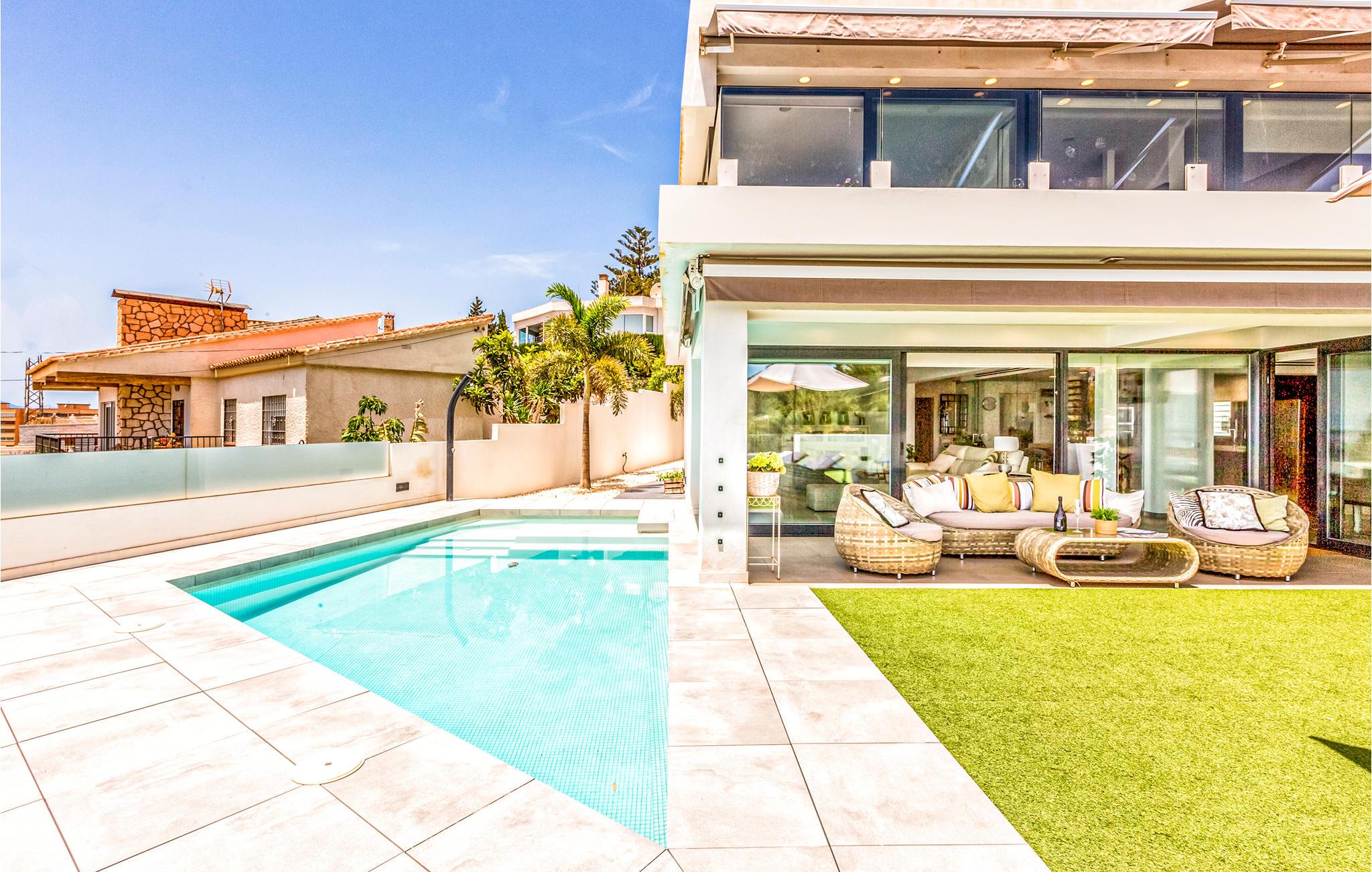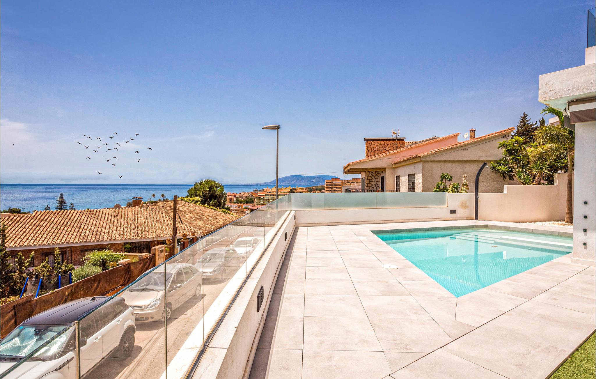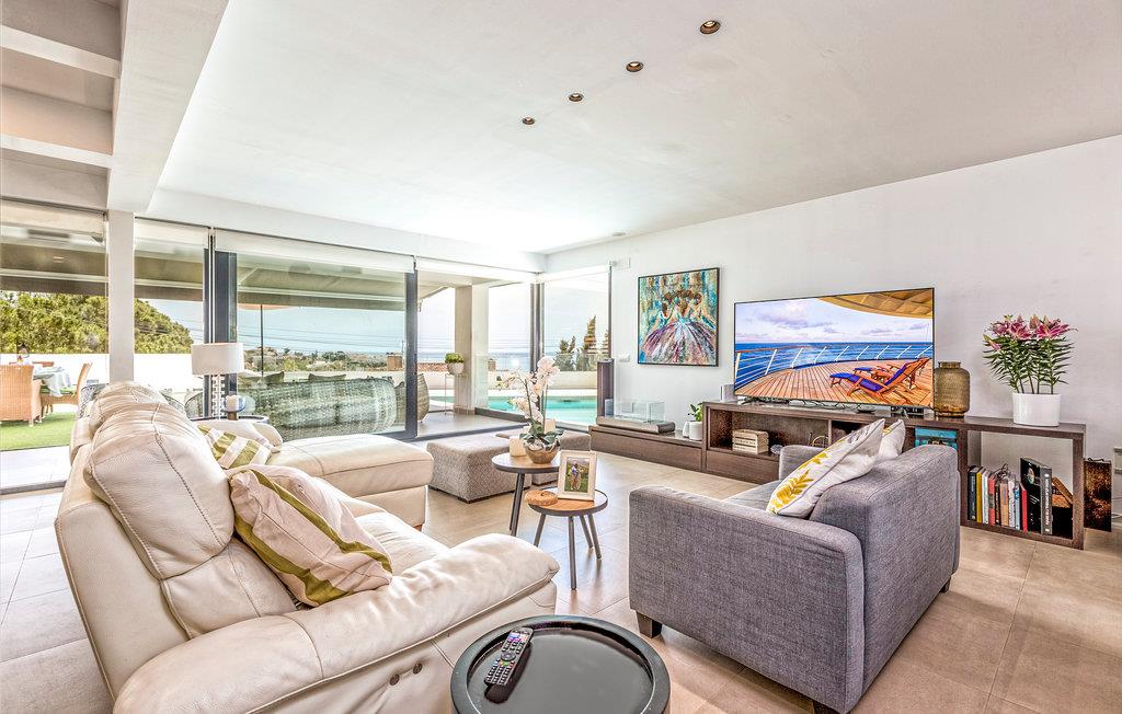 Glæd jer til en fantastisk ferie i dette moderne og luksuriøse feriehus. Huset er rummeligt og meget velegnet til større vennegrupper, flere familier eller en meget stor familie. Interiøret er vidunderligt og har alt hvad I skal bruge - både til børn og voksne. På de rummelige terrasser har I masser af plads til at slappe af, enten i solen eller i skyggen. Der er en afskærmet pool med trapper for nem adgang. Her kan børnene plaske rundt, eller I kan køle ned og have det sjovt sammen. Nyd den vidunderlige udsigt over byen og havet herfra.
