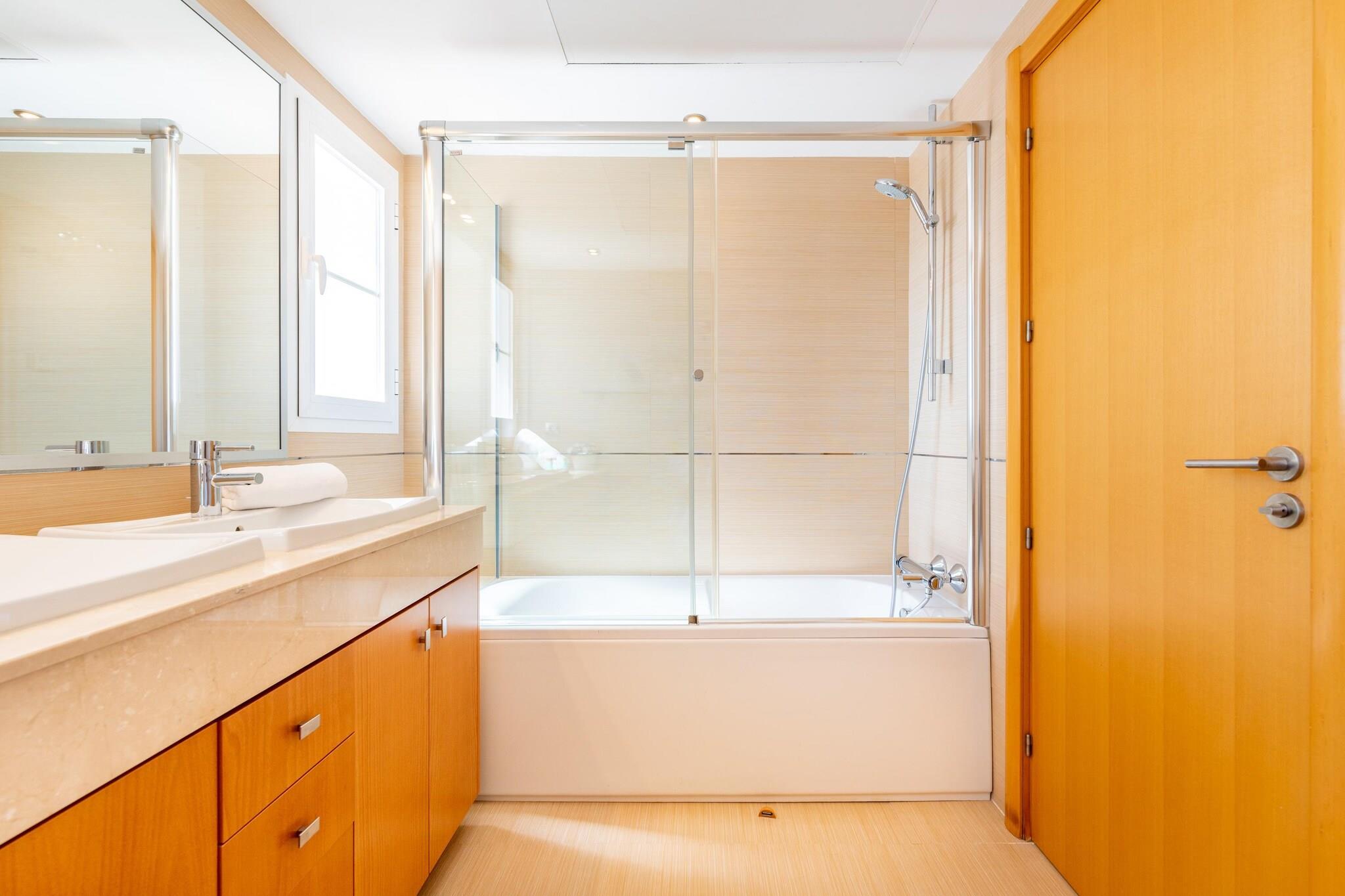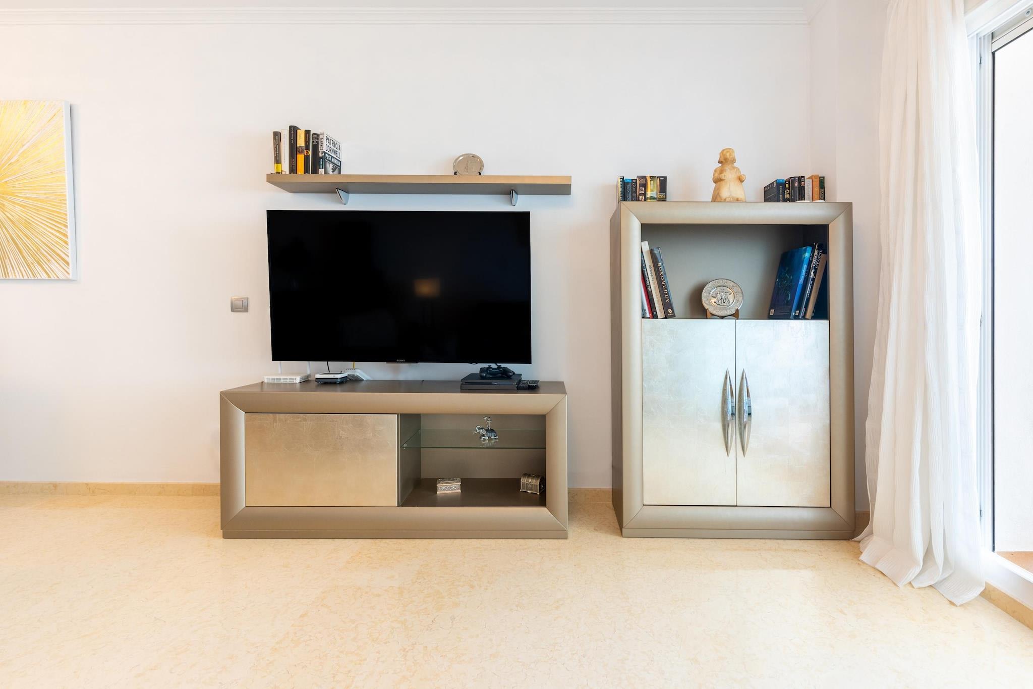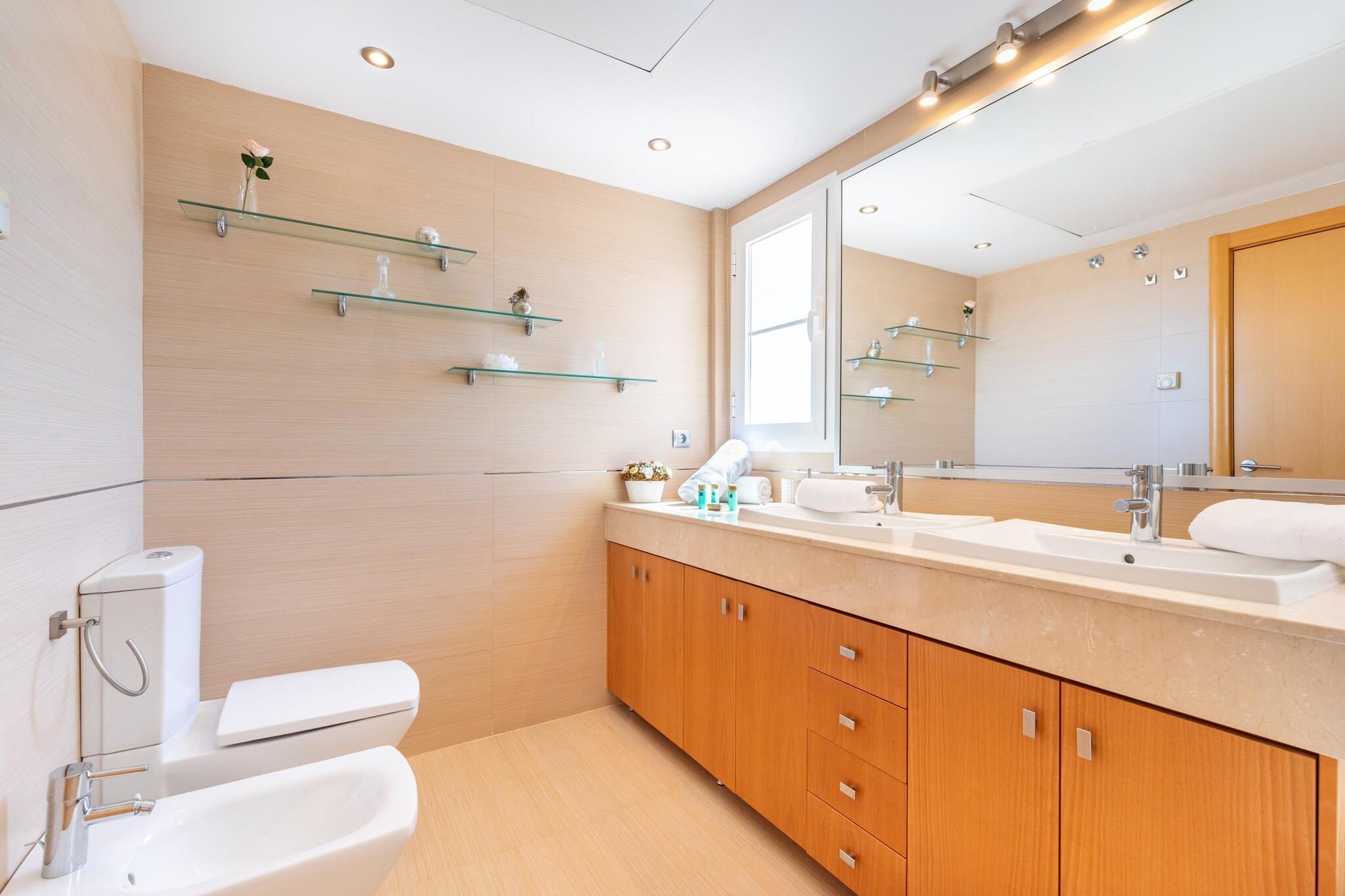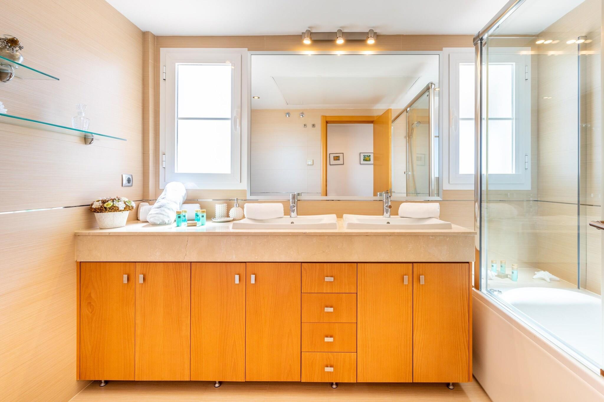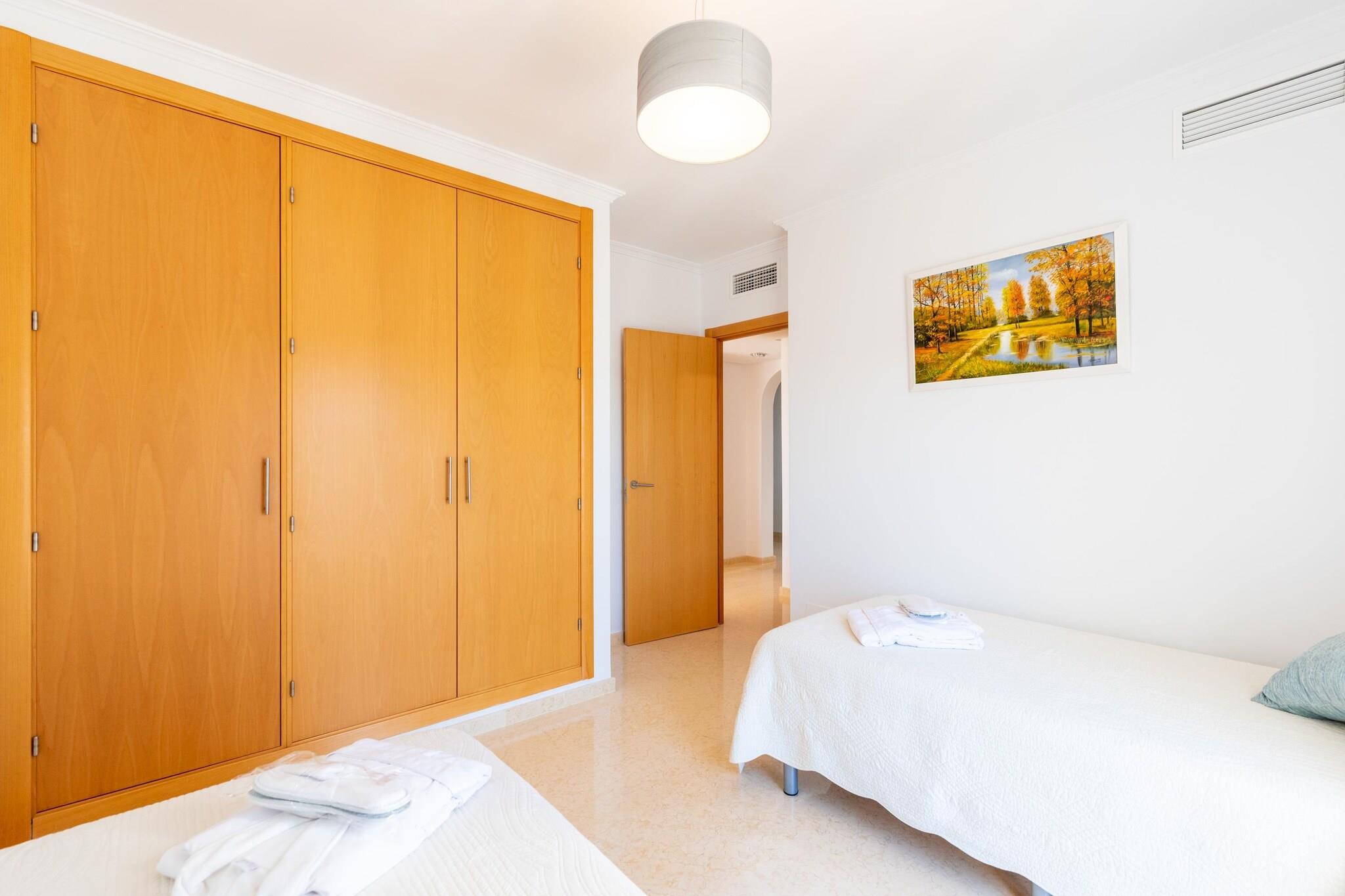 På 1. etage: (Køkken(cooker, brødrister, komfur, ovn, mikrobølgeovn, opvaskemaskine , køle-fryseskab, Saftpresser), stue / spisestue(Fjernsyn, spisebord, sofahjørne, balkon eller terrasse, klimaanlæg), soveværelse(enkeltseng, enkeltseng, klimaanlæg), soveværelse(enkeltseng, enkeltskabsseng, klimaanlæg), Soveværelse med badeværelse(dobbeltseng, Fjernsyn, badekar eller bruser, håndvask, håndvask, toilet, klimaanlæg), badeværelse(bruser, håndvask, toilet)) parkering, swimmingpool(deles med andre gæster), tennisbane(deles med andre gæster)