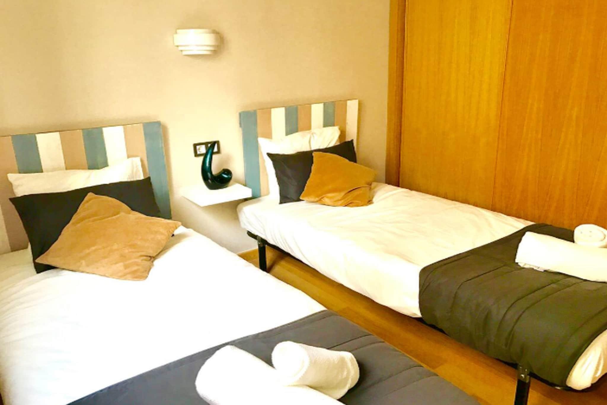 Køkken(elkedel, brødrister, kaffemaskine, ovn, mikrobølgeovn, køle-fryseskab, , ), stue / spisestue(Fjernsyn, spisebord, sofahjørne), soveværelse(dobbeltseng), soveværelse(enkeltseng, enkeltseng), badeværelse(bruser, håndvask, toilet), Internetadgang, swimmingpool(deles med andre gæster), elevator