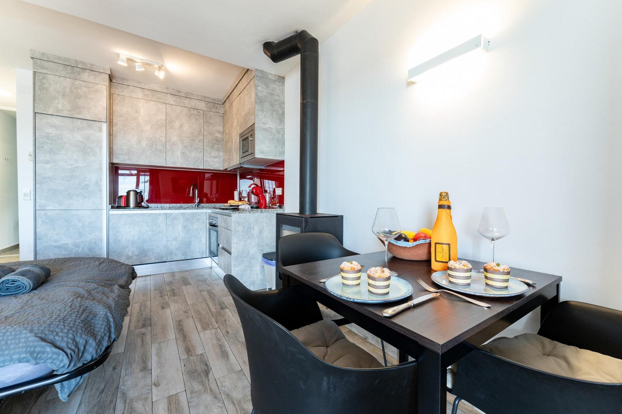 Stue(dobbeltsovesofa, Fjernsyn, spisebord, pejs, sofahjørne), Køkken(kaffemaskine, ovn, køleskab, , ), soveværelse(enkeltseng, enkeltseng), badeværelse(bruser, håndvask, toilet), klimaanlæg, swimmingpool(deles med andre gæster)