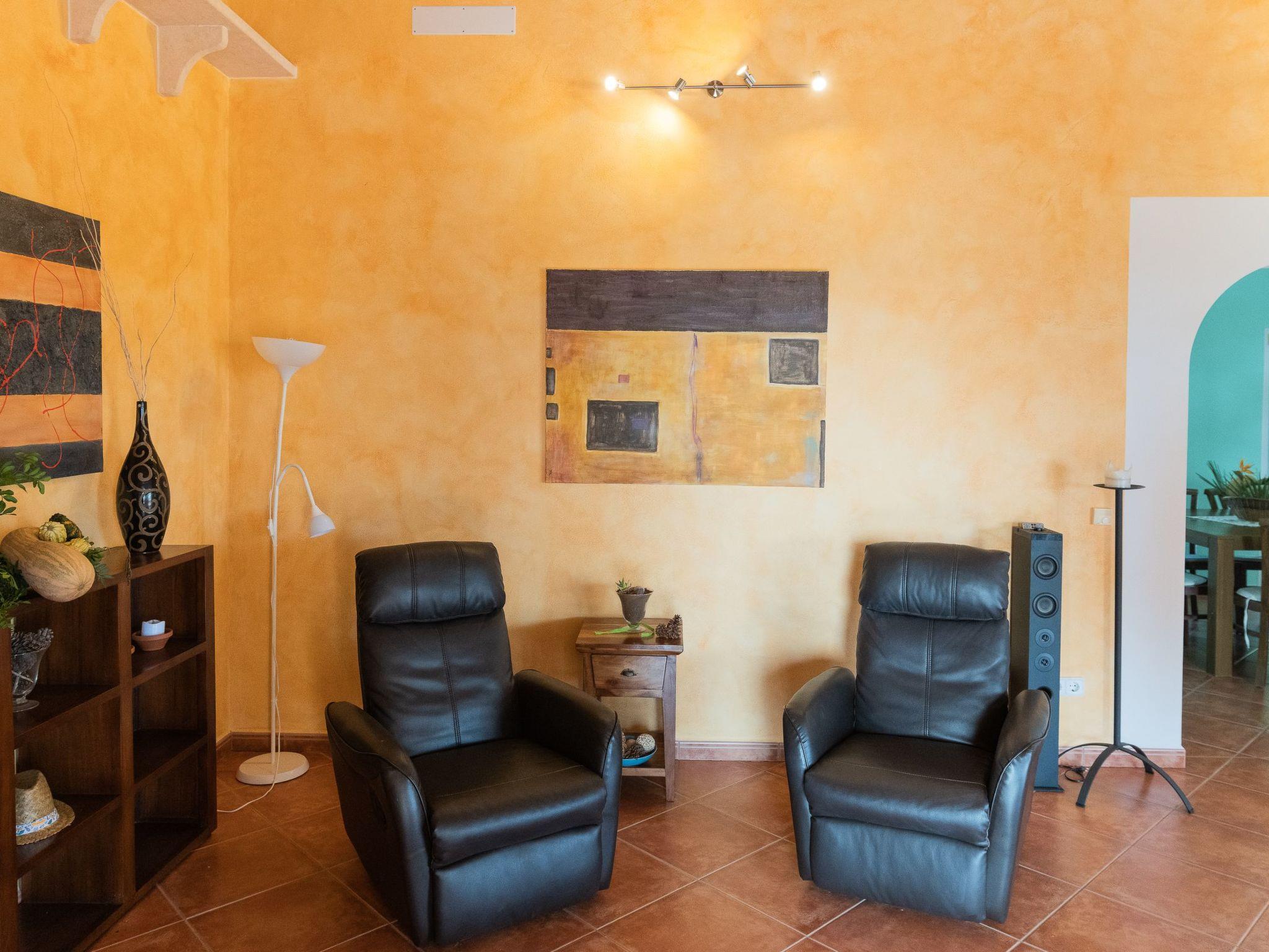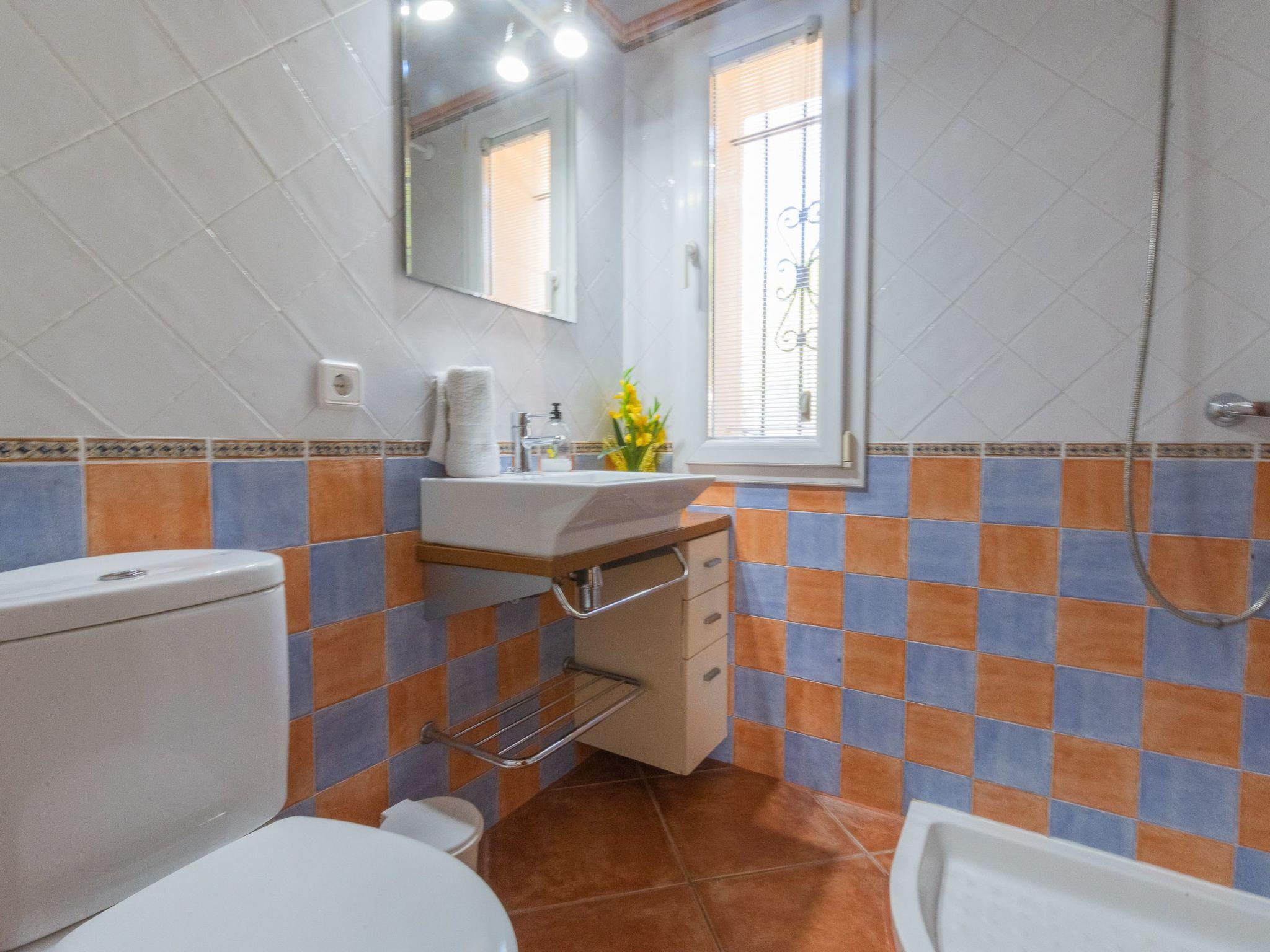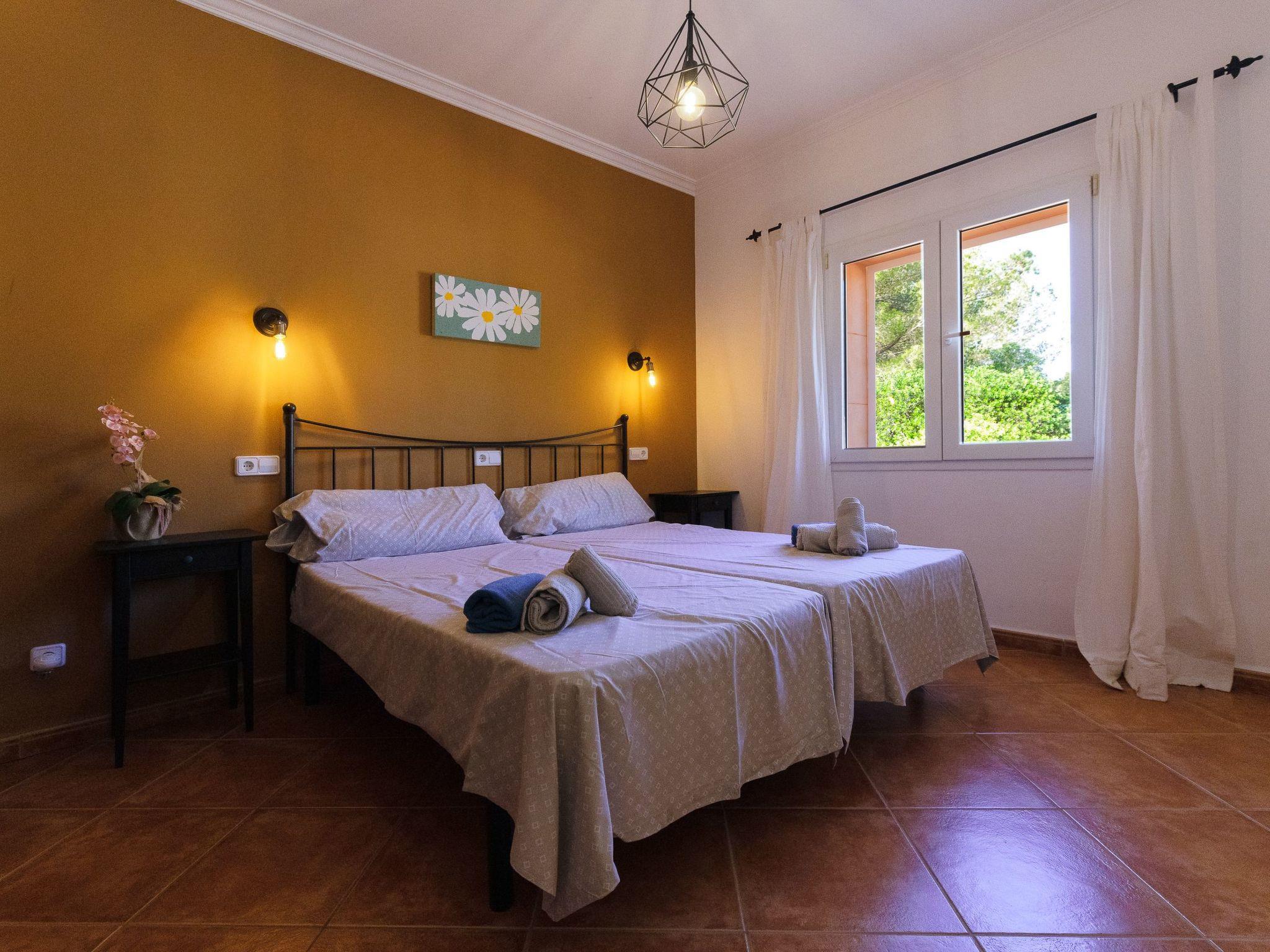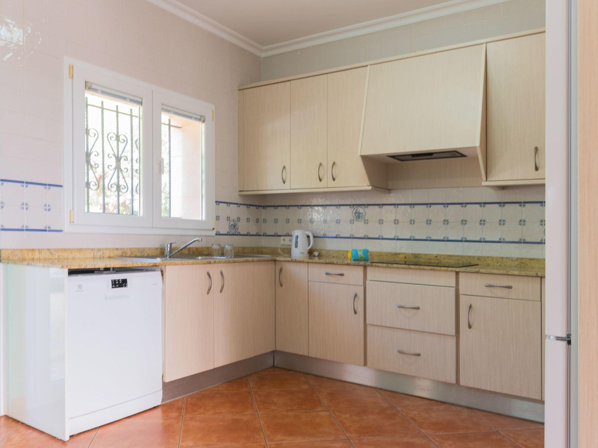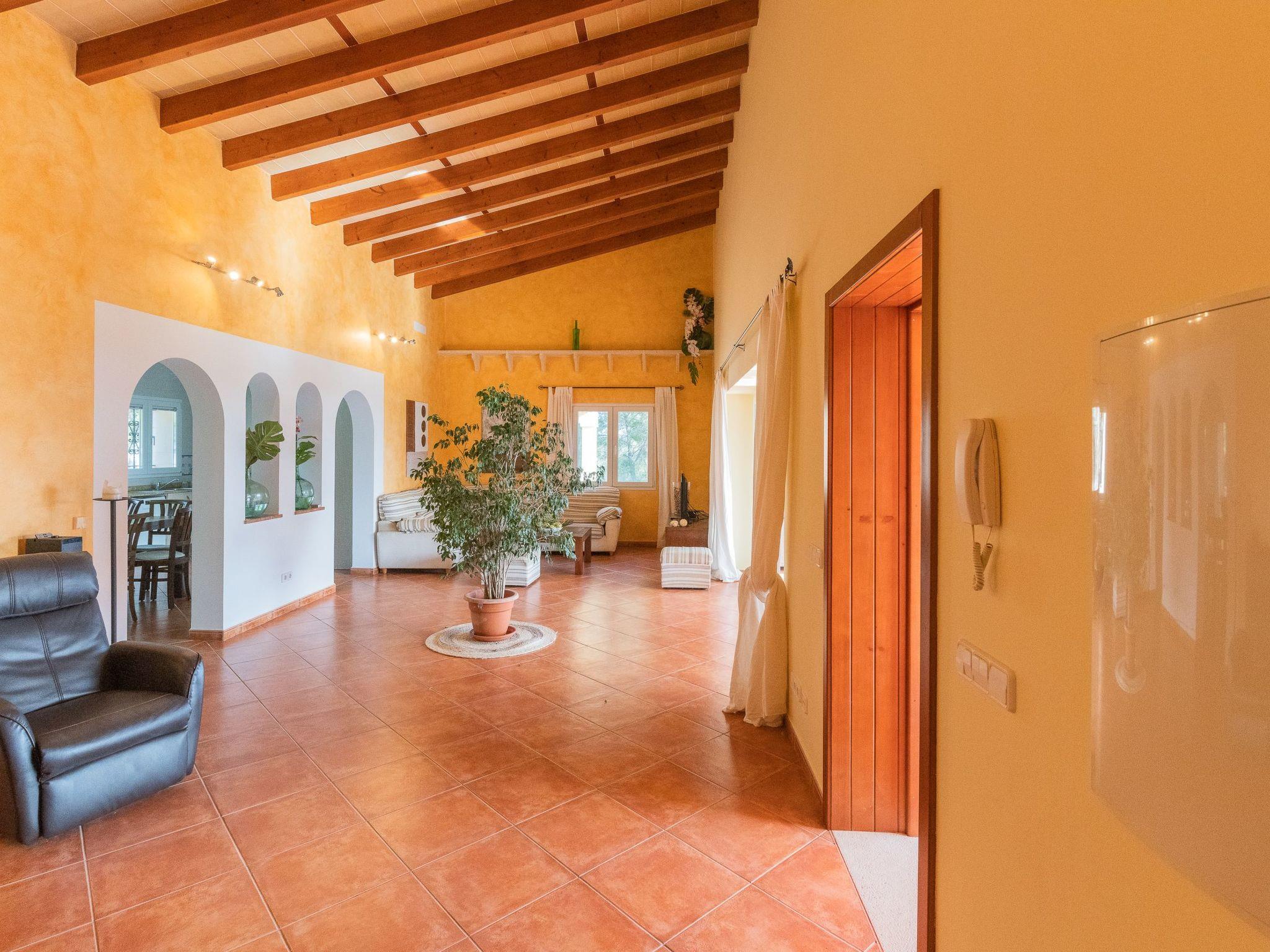 All rooms are on one floor, which offers spacious areas both inside and out. The large open-plan living room is connected to the kitchen and has access to the beautiful terrace via sliding glass doors. The kitchen is well equipped and has a dining area. Next to it is the utility room with washing machine and an additional fridge. There is also a bathroom with shower next to the kitchen. The house has four bedrooms. Two of them have a double bed and two have two single beds each. There are two further bathrooms, one with a shower and the other with a bathtub. Air conditioning in the bedrooms with fixed and limited hours of use from 21:00 to 09:00.