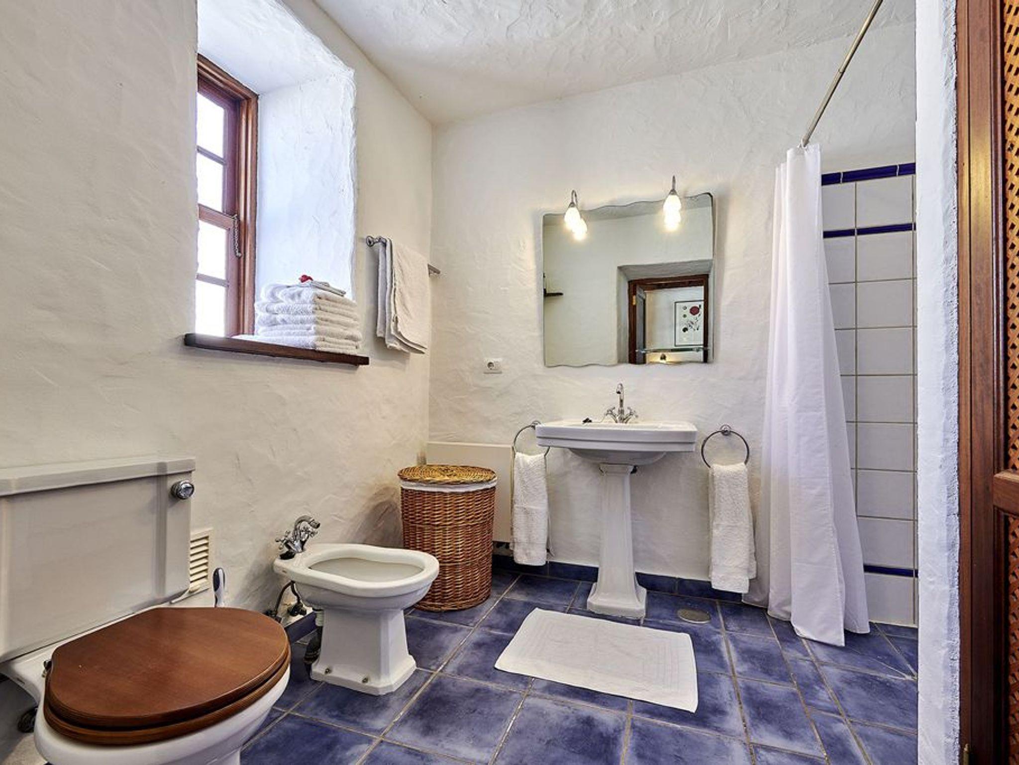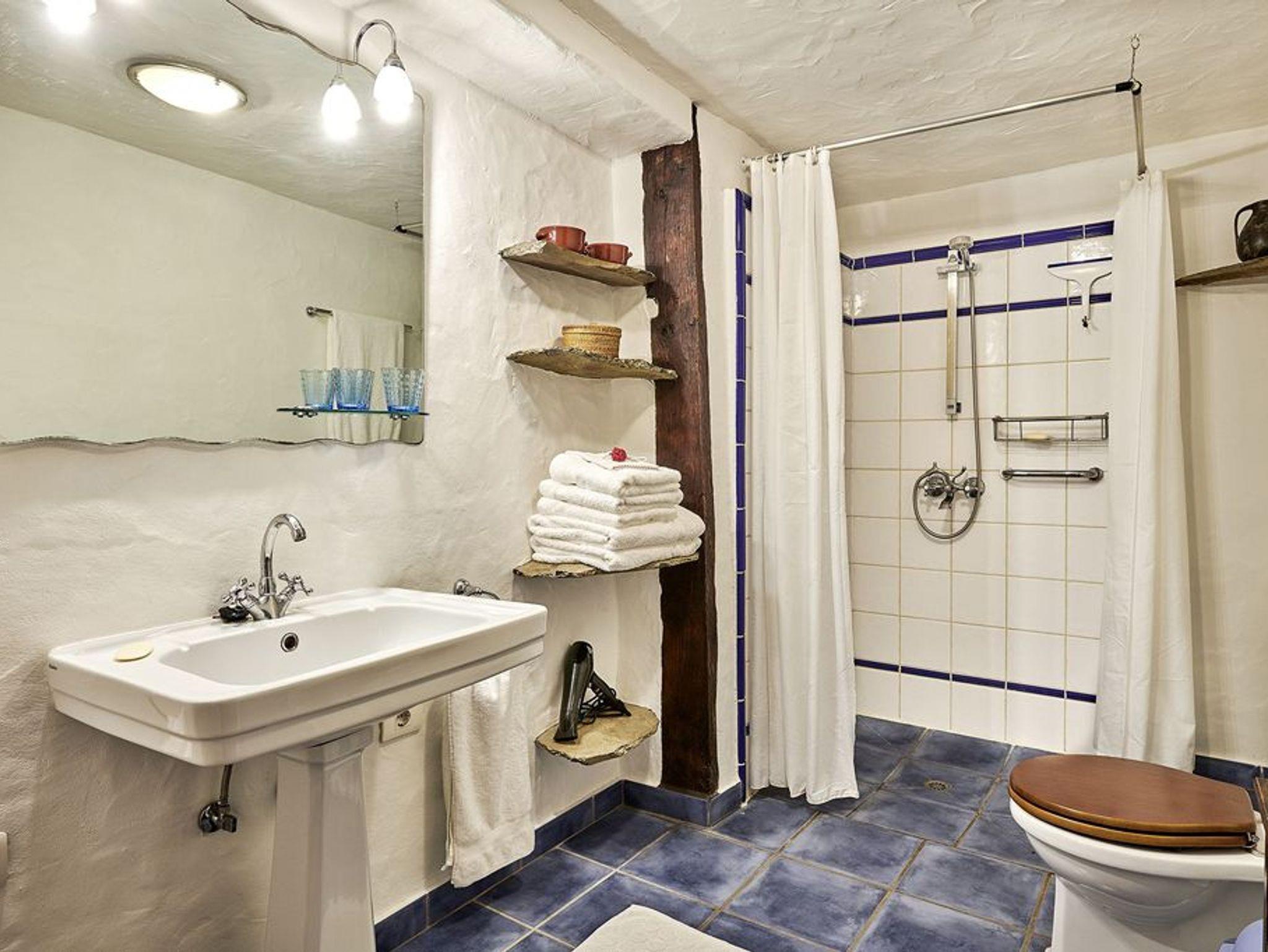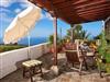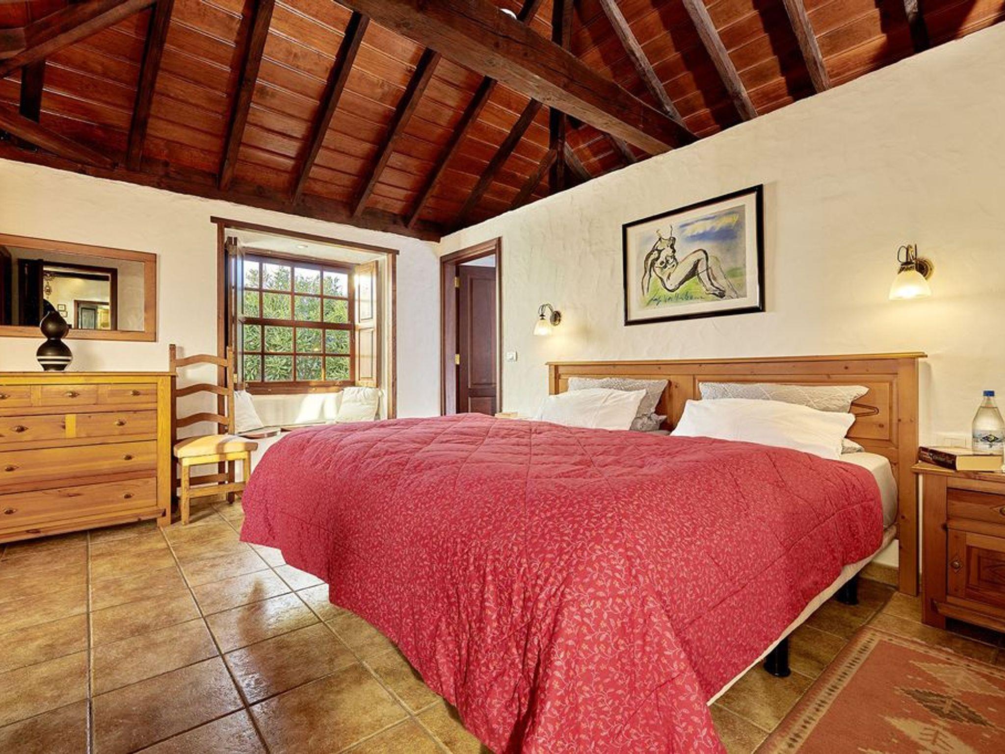 Das großzügige Haupthaus bietet allen Komfort bei einer Belegung bis zu vier Personen. Die insgesamt 150 qm sind aufgeteilt in zwei geräumige Schlafzimmer (mit jeweils einem großen Doppelbett und einem Ensuite-Bad) und einen großen Wohnraum mit Ledersofas, offenem Kamin, sowie großem Esstisch mit sechs Stühlen. Vom Wohnbereich geht es es paar Stufen hinauf in die offene, gut ausgestattete Küche. Das Holz für den Kamin wird gestellt, im Wohnbereich sowie in den beiden Bädern gibt es zusätzlich Zentralheizung. Von allen Räumen aus führen Türen auf die große Terrasse mit Panoramablick (Süden und Westen).