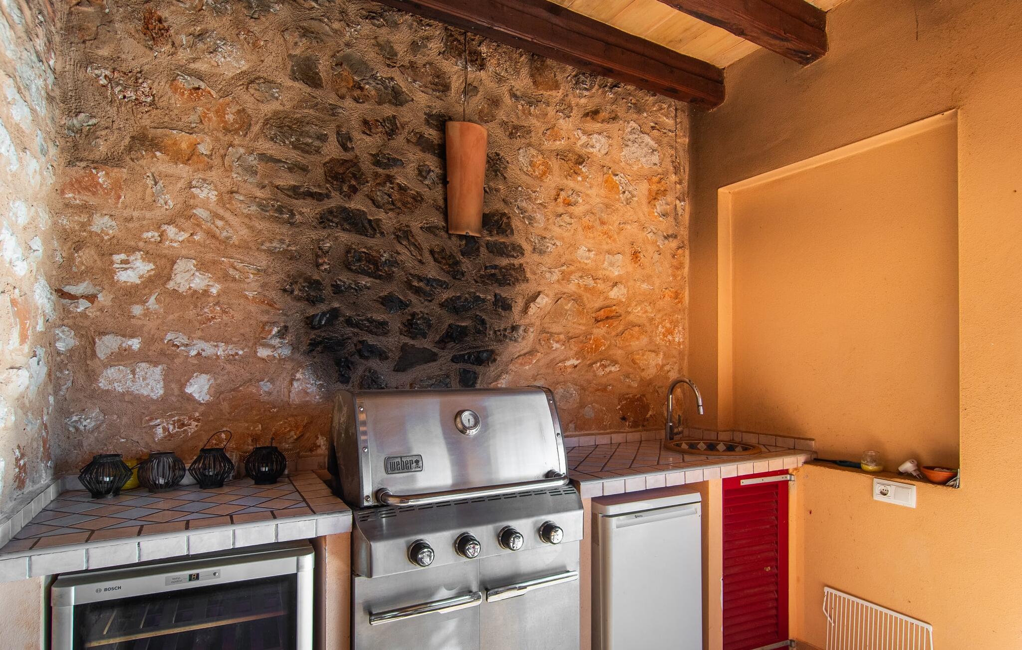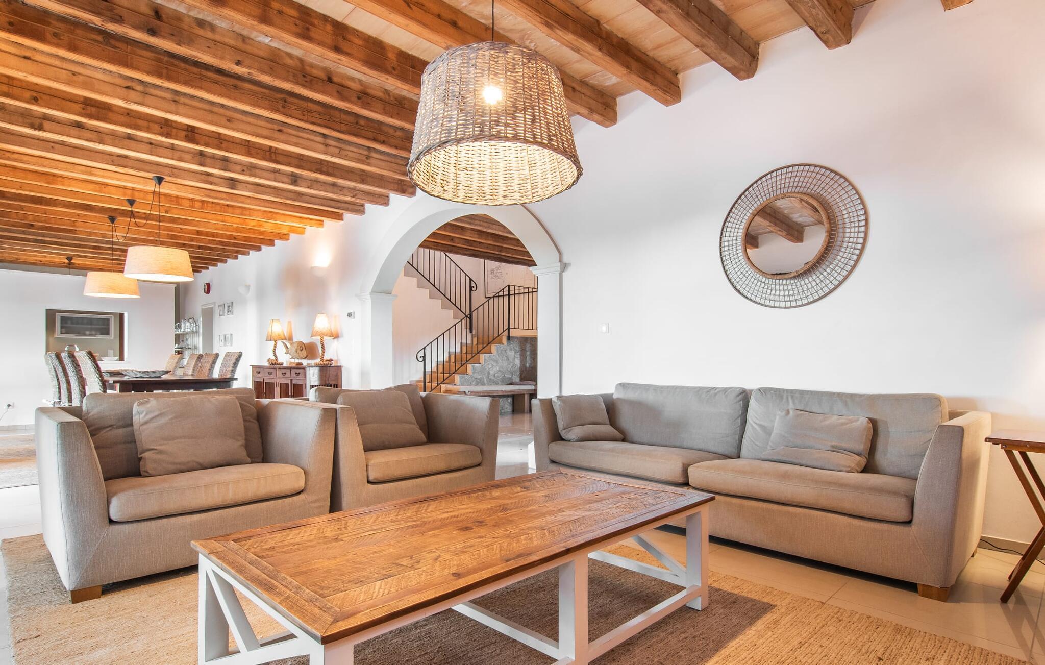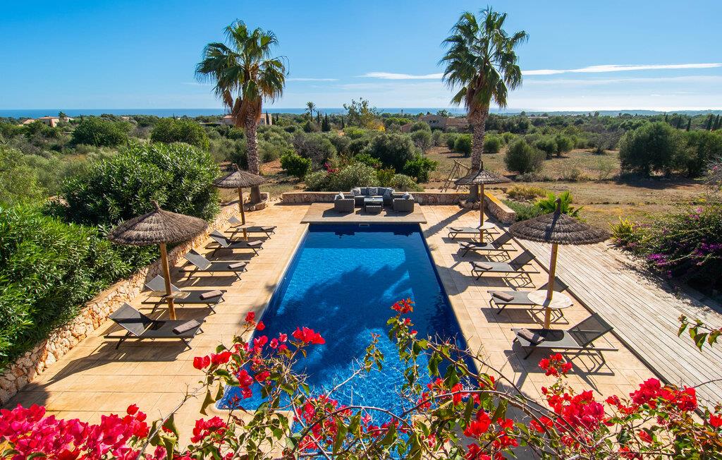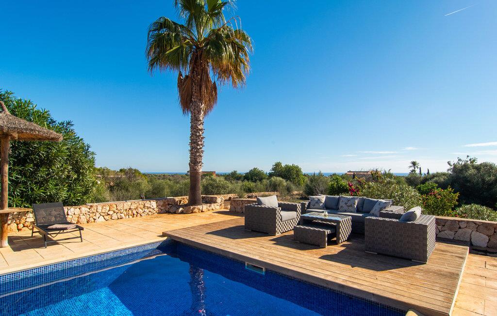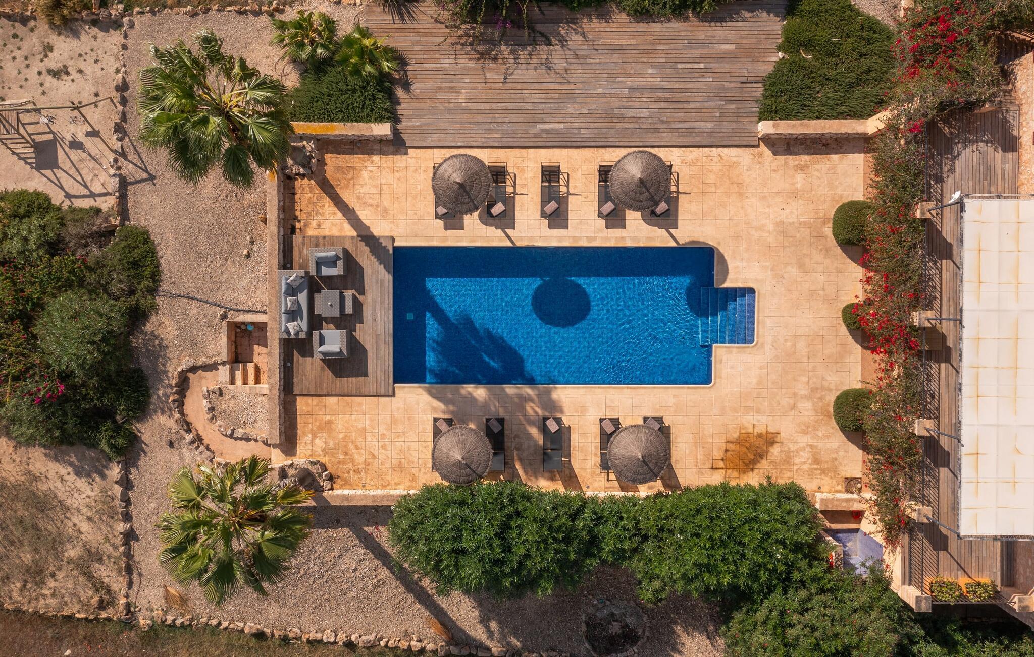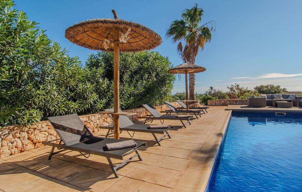 "Mar d'es Teix" er en stilfuld naturstensfinca på Mallorcas østkyst og kan rumme op til 12 gæster. Det er ideelt for to familier eller store grupper og fungerer også som et mødested for familiebegivenheder, herunder bryllupper. En privat indkørsel foret med palmer fører til en halvcirkelformet parkeringsplads. Den sydøstvendte poolterrasse har liggestole, parasoller og en udendørs lounge til afslapning. Nyd jeres måltider på den overdækkede terrasse med sommerkøkken, ideel til morgenmad, grillmad eller middage med levende lys. Det elegant møblerede opholdsrum strækker sig over to etager og er i åbent plan. I stueplan er der en indbydende entré, en hyggelig opholdsstue med pejs, en rummelig spiseplads, et veludstyret køkken, et enkelt soveværelse og et gæstetoilet. En trappe fører til et galleri med skrivebord og sofa, hvorfra man når soveværelserne med hver sit badeværelse, herunder et stort soveværelse til fire personer og to dobbeltværelser. Hvis I når Manacor via Ma-15, er S'Espinagar ikke langt væk, da det ligger mellem de smukke havnebyer Portocolom og Porto Cristo. I absolut fred og tæt på andre prestigefyldte landejendomme ligger den familievenlige villa "Mar d'es Teix" på en stor grund med vidunderlig havudsigt, kun ca. 3 km fra en lille landsby med butikker til daglige behov strand. Kystvejen inviterer til spontane ture til nye badebugter og promenader som i Cala d'Or.