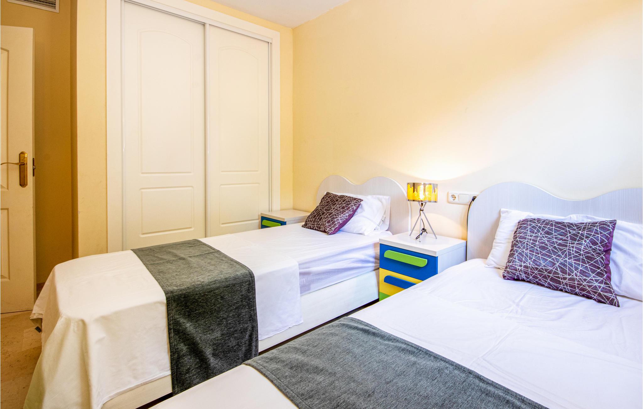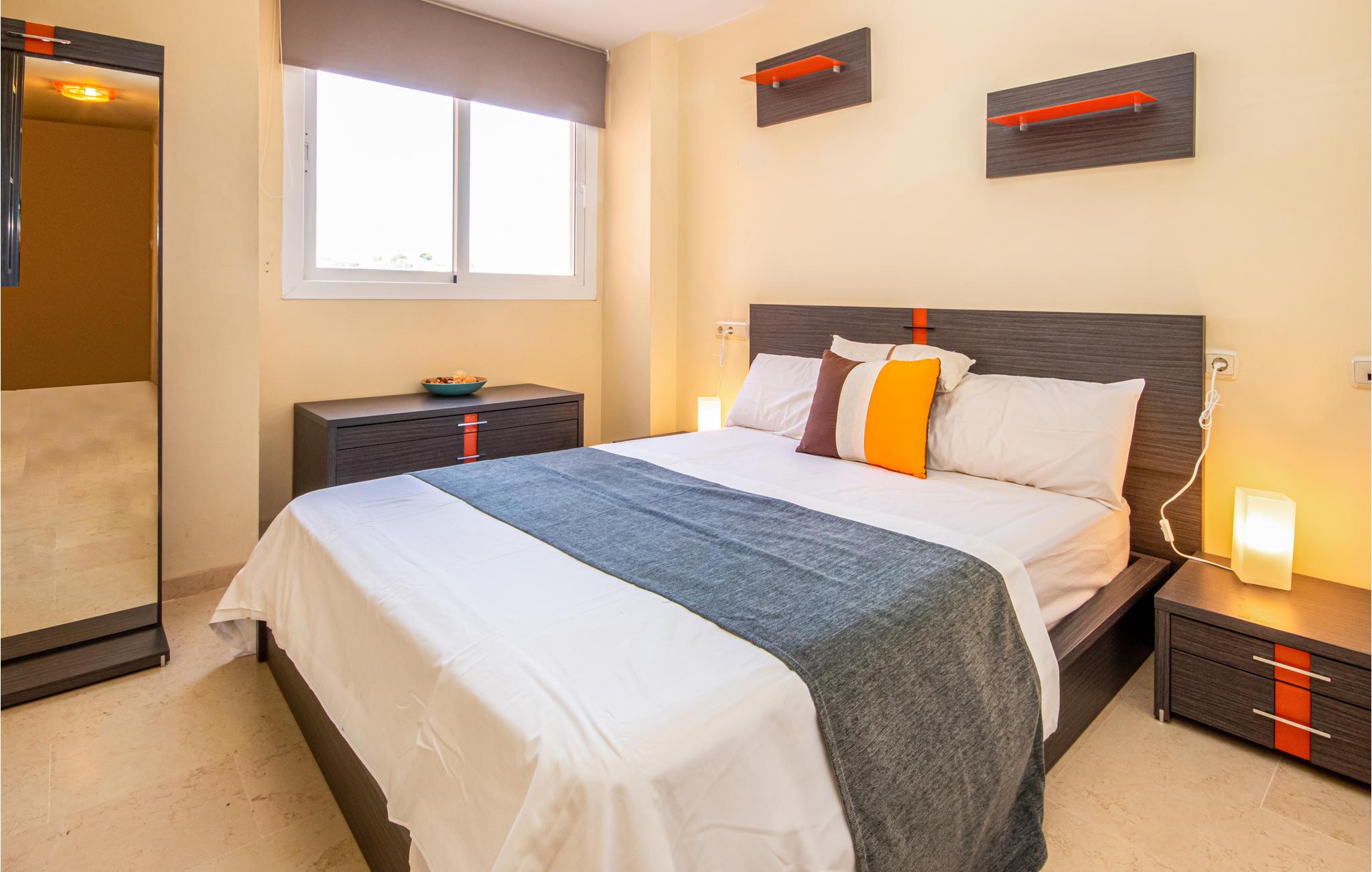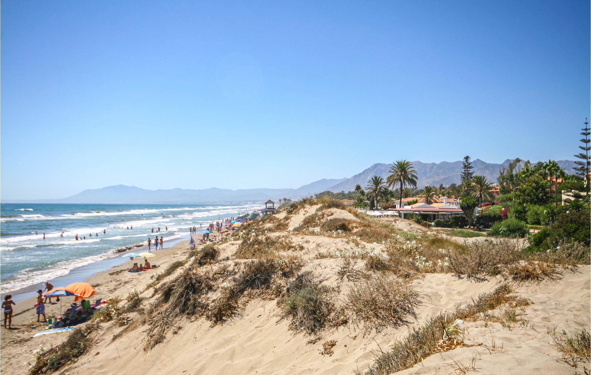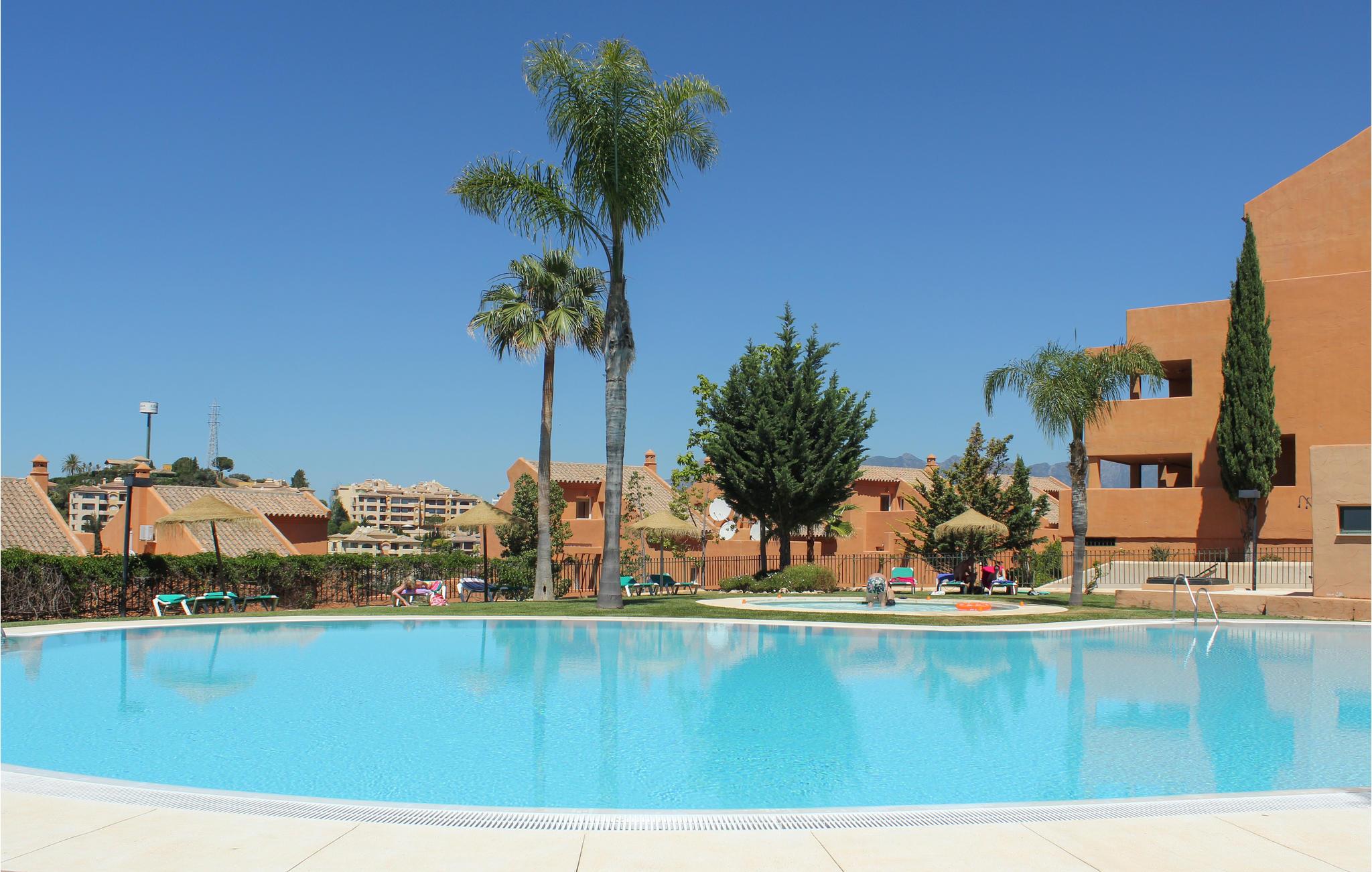 Tilbring jeres ferie i lejlighedskomplejkset Los Lagos de Santa Marìa Golf og Country Club. Den grønneste og roligeste i Marabella . Los Lagos er i perfekt harmoni med landskabet hvor egetræer, korkeg og bakker præger landskabet. Dedikerede golfspillere kan dyrke deres hobby her eller på en af de andre golfbaner som ligger rundt omkring i området. Der er desuden kun et par kilometer til Marbellas bedste strande, ligesom der kun er ti min i bil til yachthavnen i Cabopino. Der er et stort udvalg af barer, restauranter butikker banker og et supermarked inden for kun en km. Denne elegante lejlighed ligger på første sal og har en stor opholdsstue med adgang til terrassen hvorfra der er udsigt til hele bebyggelsen og Middelhavet. Soveværelset har et badeværelse og indbyggede skabe. Gæsteværelset har ligeledes indbyggede skabe. Hele lejligheden er velindrettet og det moderne køkken veludstyret ligesom opholdsstuen har et stort fladskærms-tv.