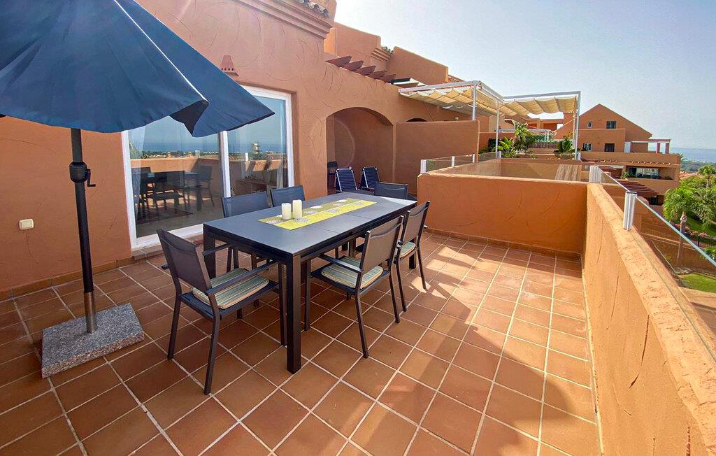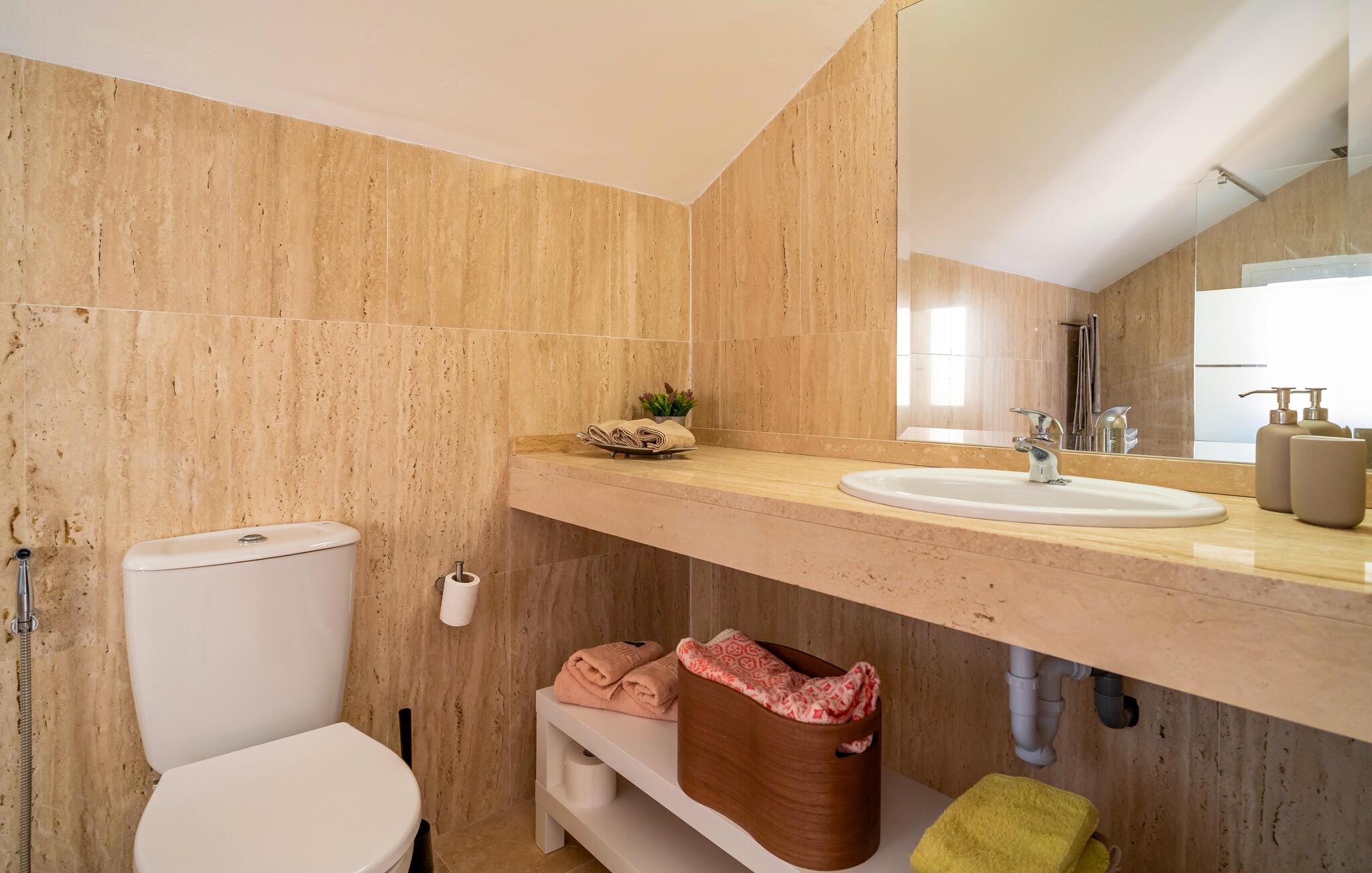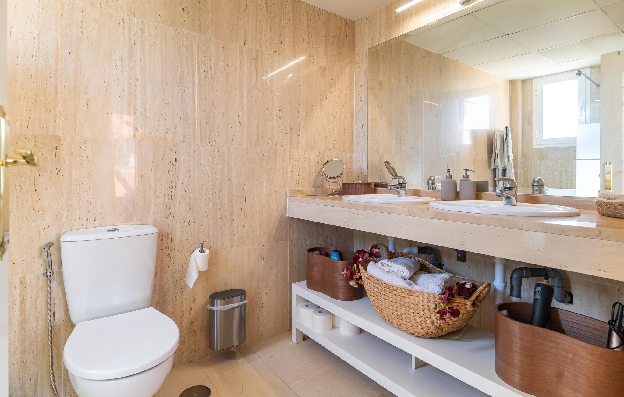 Velkommen til denne stilfulde ferielejlighed, hvor I kan slappe af og koble fra med familien. Tilbered lækre tapas i det åbne køkken og nyd den elegante atmosfære i den smagfulde opholdsstue. Efter en lang dag i solen inviterer den komfortable sofa jer til hyggelige filmaftener og en afslappende læseoplevelse.