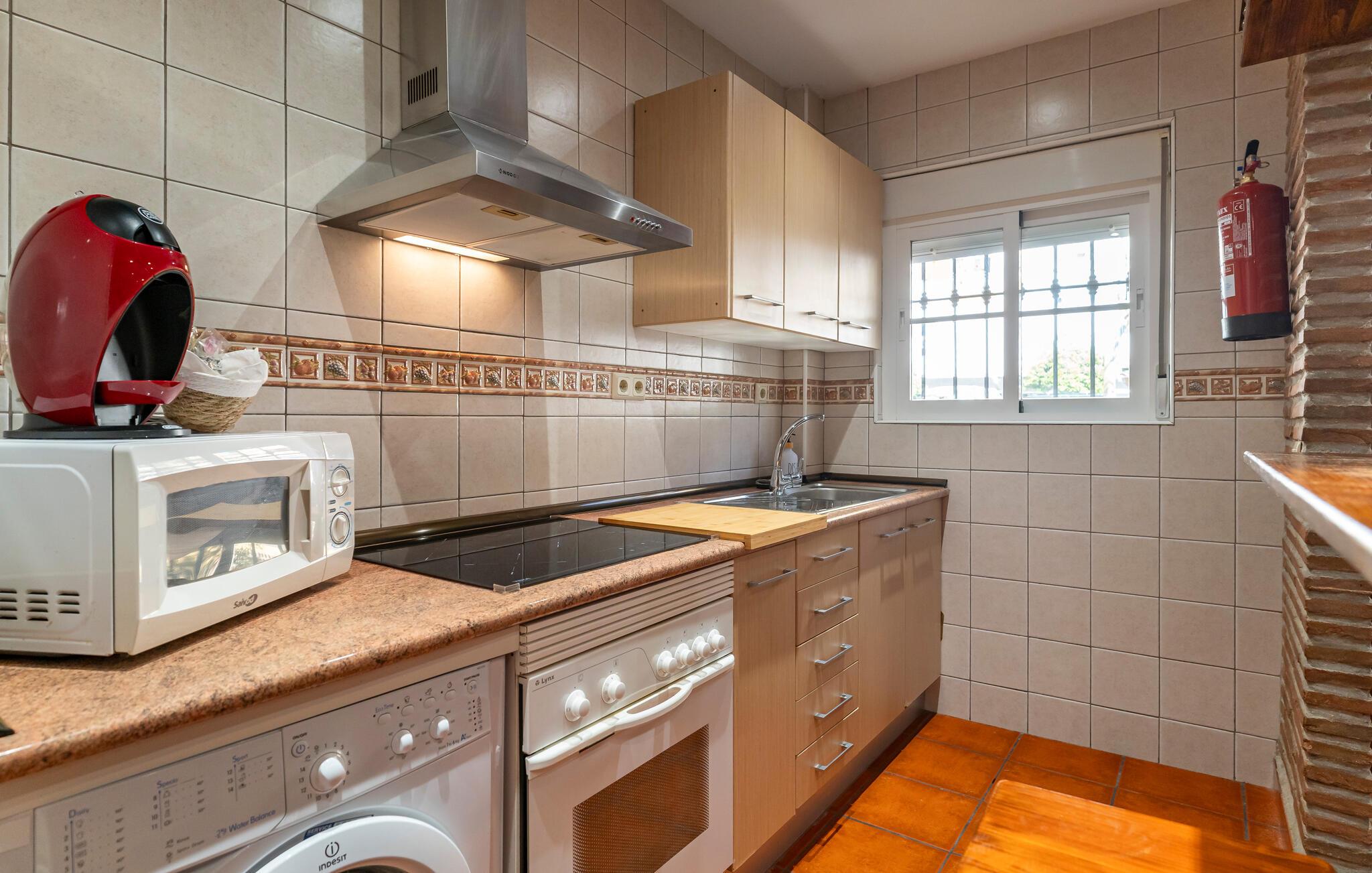 Jeres bolig er det ideelle udgangspunkt for afslappede feriedage på den sydspanske kyst. Nyd den centrale beliggenhed og den varme atmosfære i denne lejlighed med rustik stil. Læn jer tilbage i den store sofa, se jeres yndlingsserie, eller planlæg den næste dags udflugter. Det åbne køkken med muret bardisk er ikke kun et visuelt højdepunkt, men også praktisk indrettet. Spis jeres måltider direkte ved bardisken, eller nyd et glas vin her sidst på dagen.