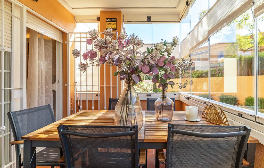 Tilbring rolige stunder i havestuen med glasfront – perfekt til fælles måltider eller en god bog. Sæt jer til rette ved det store træbord, og nyd det grønne omkring jer i den beskyttede atmosfære. Svøm et par baner i den rummelige fællespool, eller slap af i skyggen under palmerne på den velholdte græsplæne.