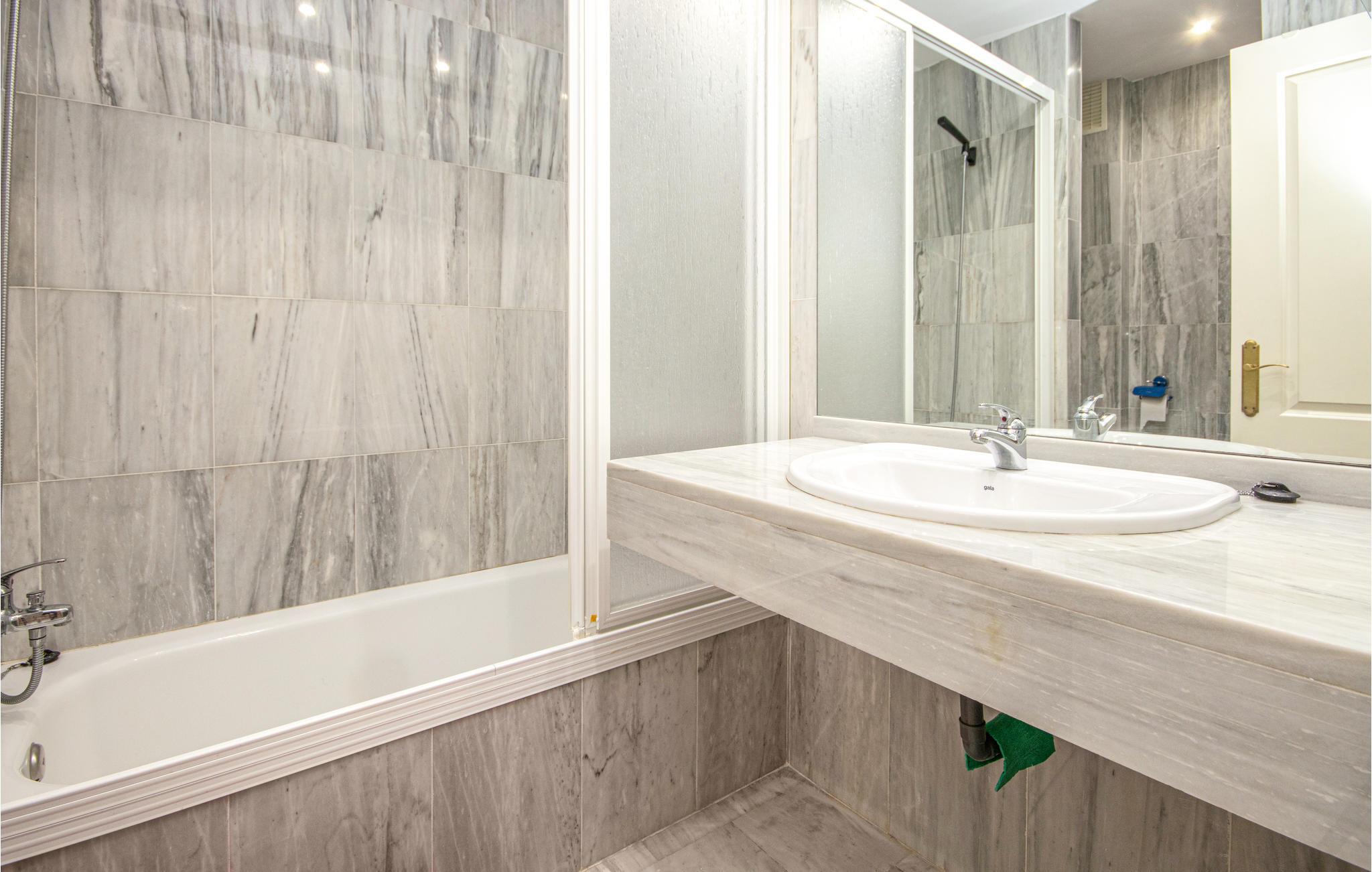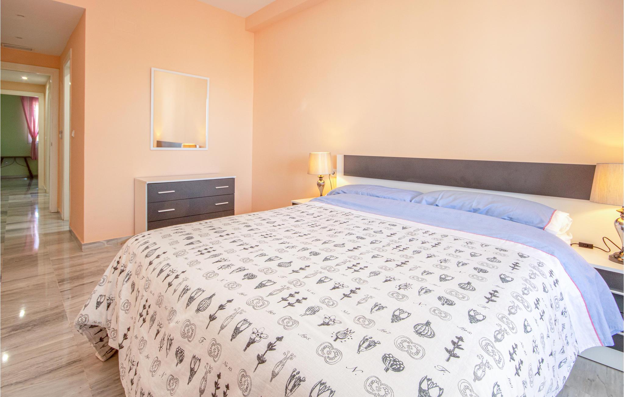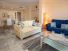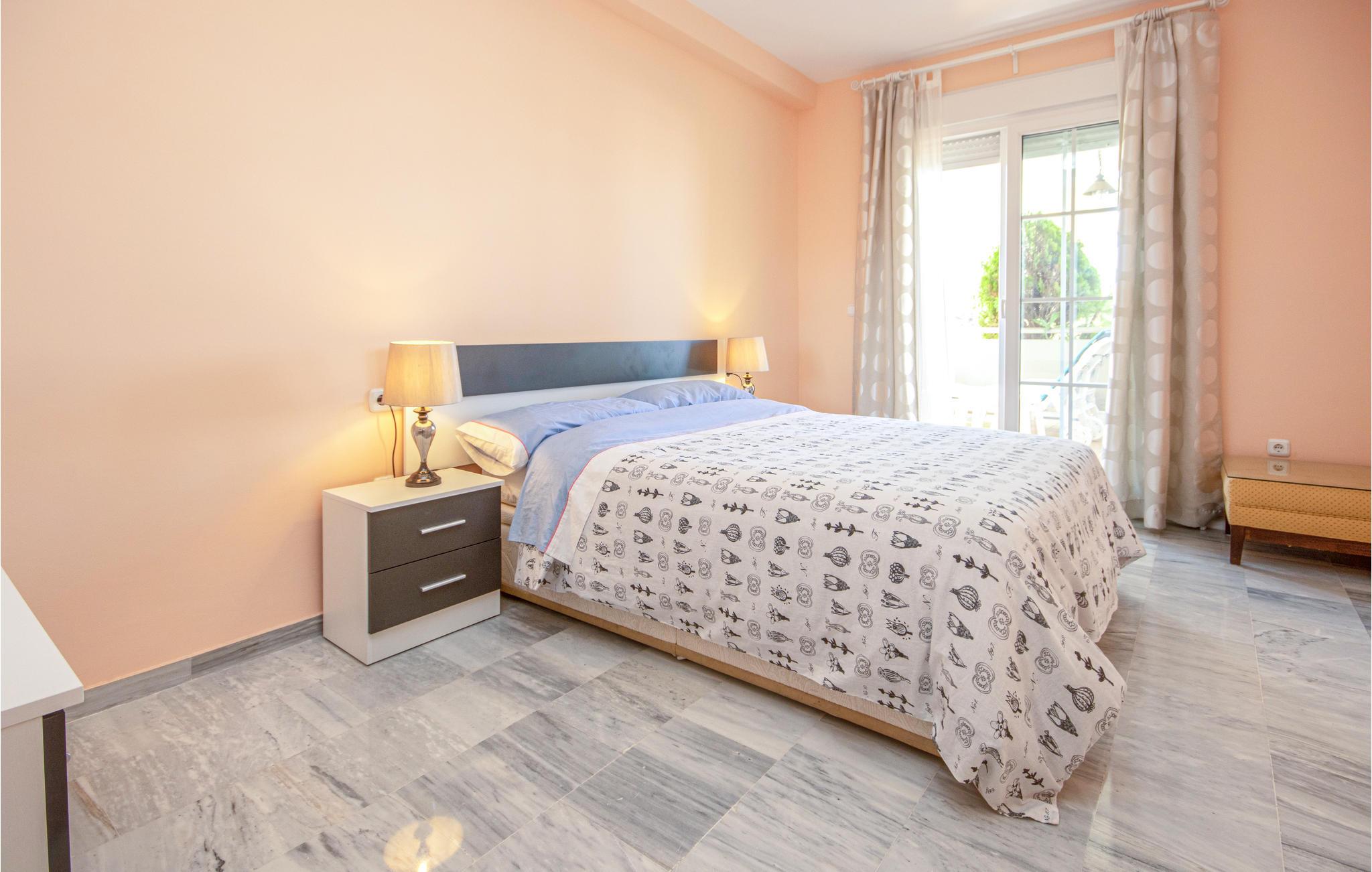 Lejligheden på første sal tilbyder aircondition (varm / kold), gratis WiFi og en stor sydvendt terrasse med udsigt over havet og poolområdet. Gå ind i loungen, og der er spisebord og stole og 2 sofaer, et stort fladskærms-tv med internationale kanaler, en Blueray DVD-afspiller og en Bluetooth-højttaler.