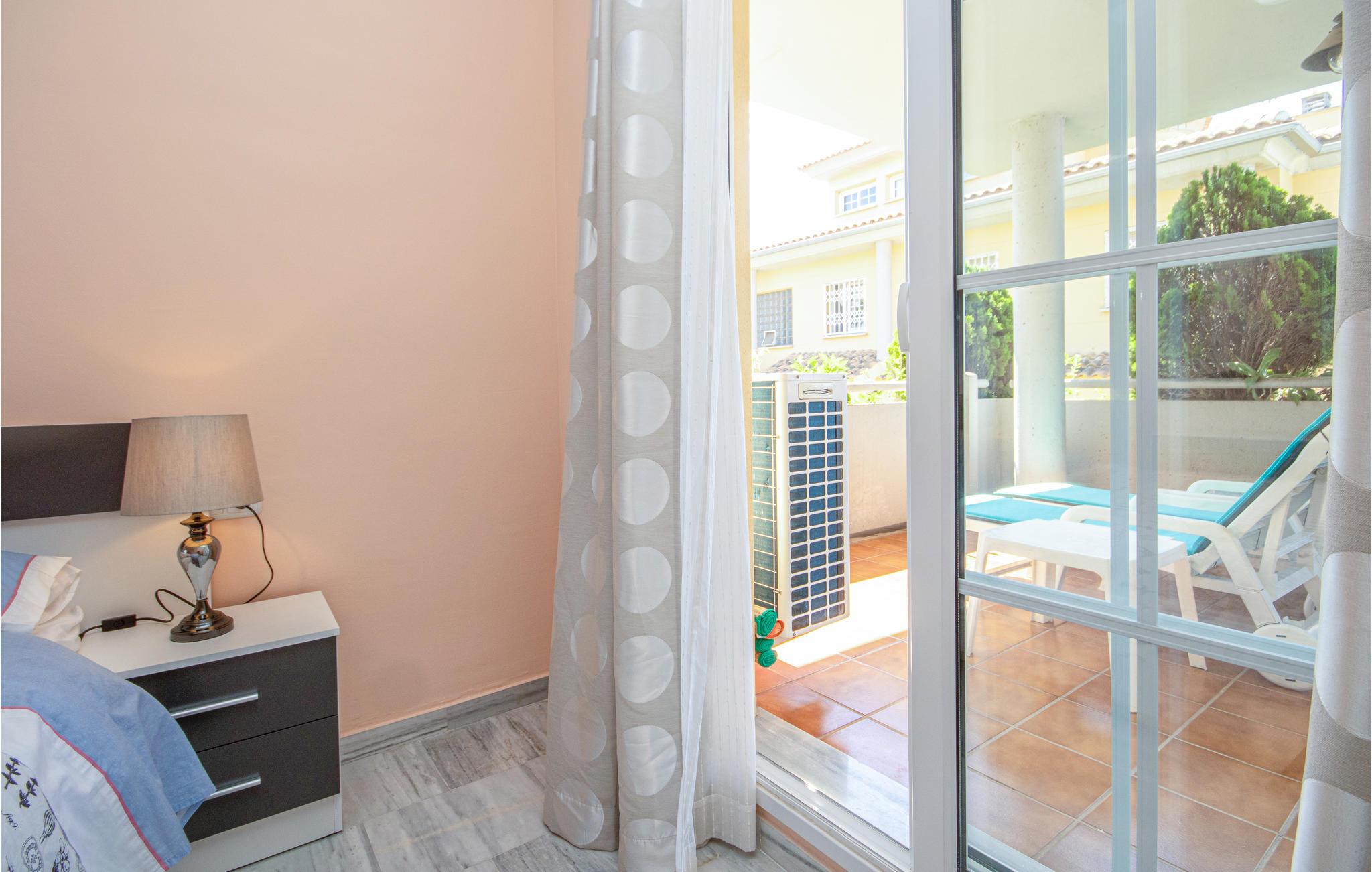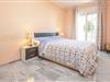 Det store soveværelse er indrettet med en king-size seng og indbyggede skabe og har en-suite badeværelse og adgang til terrassen. Gæsteværelset er udstyret med 2 enkeltsenge og indbyggede skabe og bruger gæstebadeværelset.