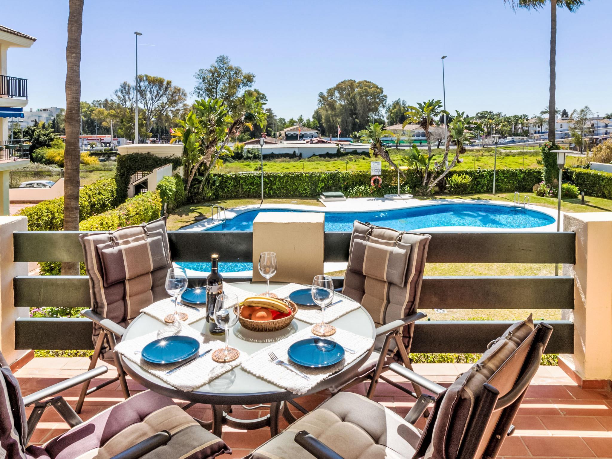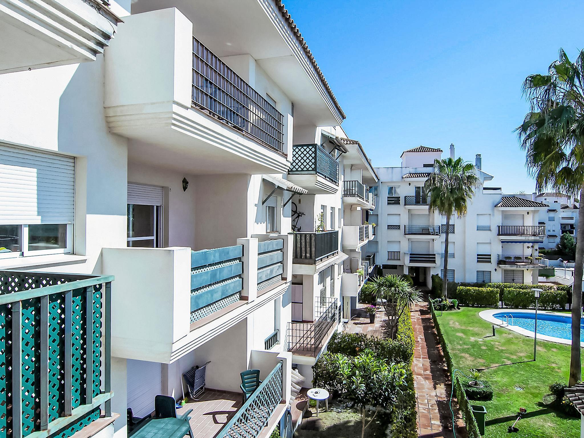 Apartment block "Lorcrimar". Nueva Andalucía, on the outskirts, 1.9 km from the centre of Puerto Banús, 600 m from the sea. For shared use: garden with lawn, swimming pool (seasonal availability: 01.Jan. - 31.Dec.). Shower/WC in the pool area, tennis (extra), communal covered parking. Supermarket 400 m, shopping centre 1 km, restaurant 100 m, bus stop "Cortijo Blanco" 750 m, sandy beach 600 m. Sports harbour 1.9 km, golf course (18 hole) 3 km. Please note: motorway close by. Use of the pool outside the indicated period will be at own risk. It has many of the best golf courses close to the apartment, La Quinta, Los Naranjos, Aloha and others. There are also a tennis club and a padel tennis club next door.