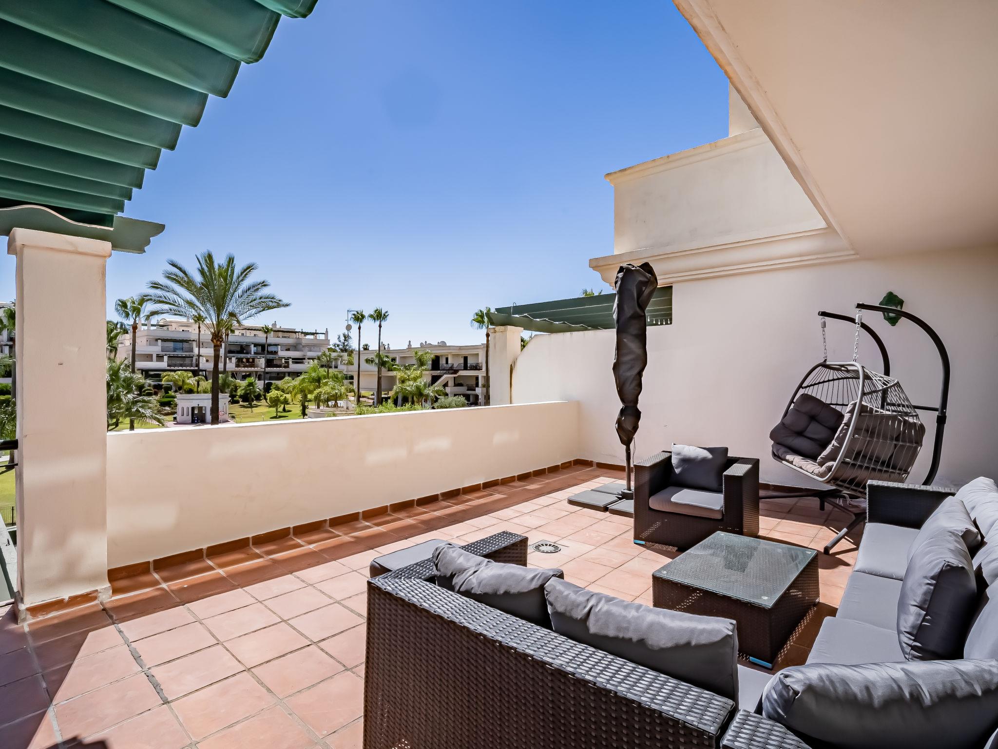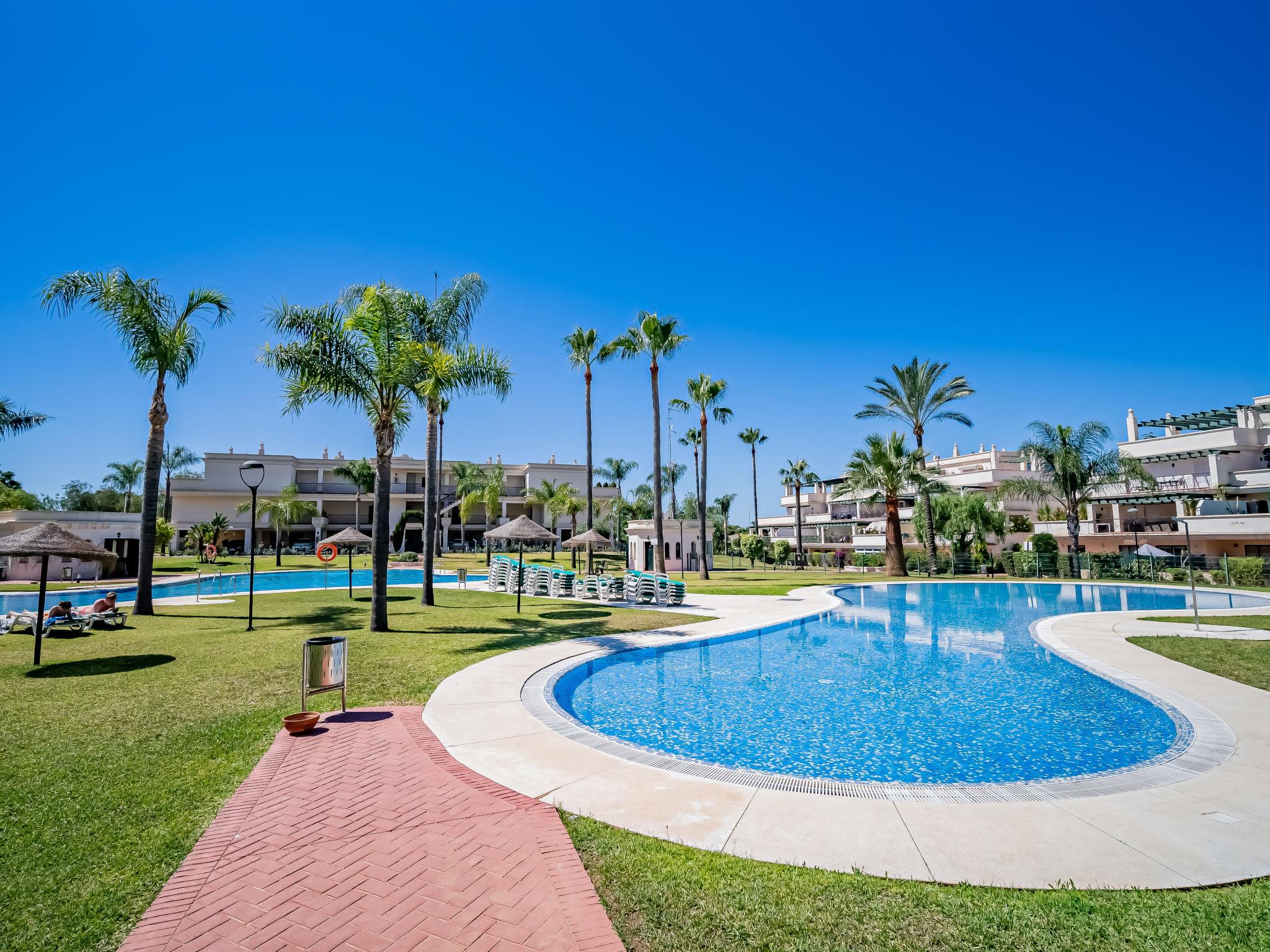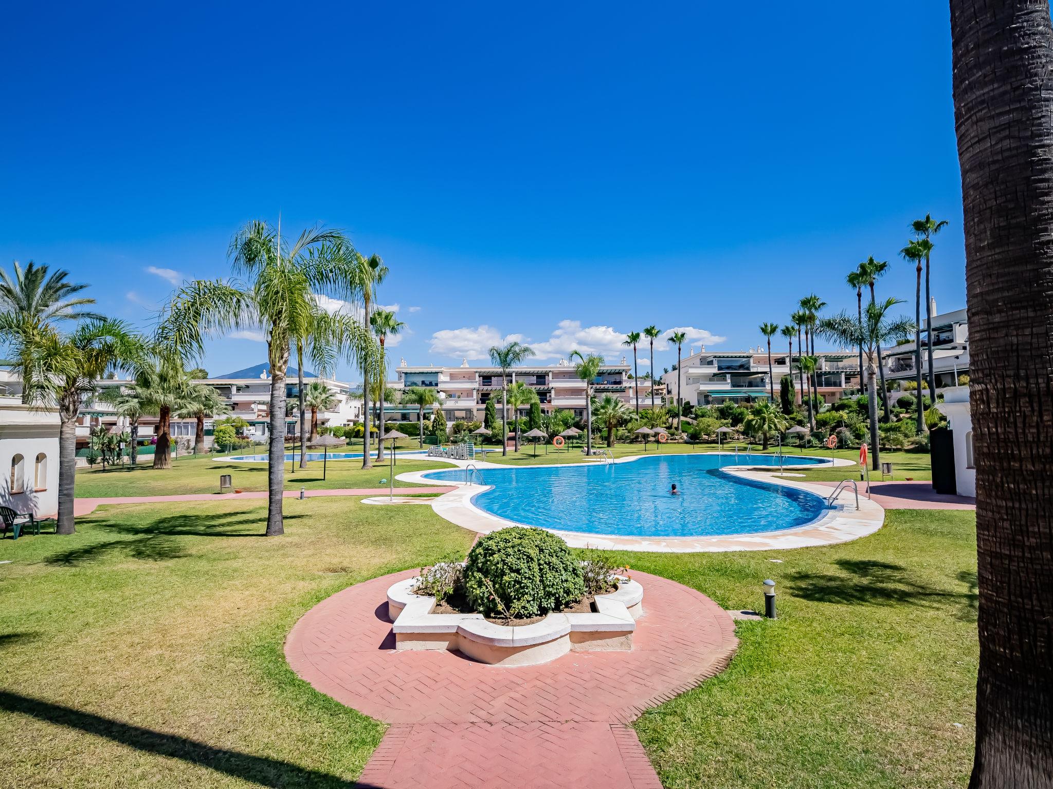 Very beautiful apartment block "Lorcrimar". Nueva Andalucía, on the outskirts, 1.9 km from the centre of Puerto Banús, 1 km from the sea, 1 km from the beach. For shared use: garden with lawn, swimming pool (depth 120 - 130 cm, seasonal availability: 01.Jun. - 30.Sep. pool opening hours: 12:00-20:00). Unconventional pool shape. Shower/WC in the pool area. In the house: WiFi, lift. Communal covered parking. Supermarket 400 m, shopping centre 1 km, restaurant 200 m, bus stop "Cortijo Blanco" 850 m, sandy beach 1 km. Sports harbour 1.9 km, golf course (18 hole) 3 km.