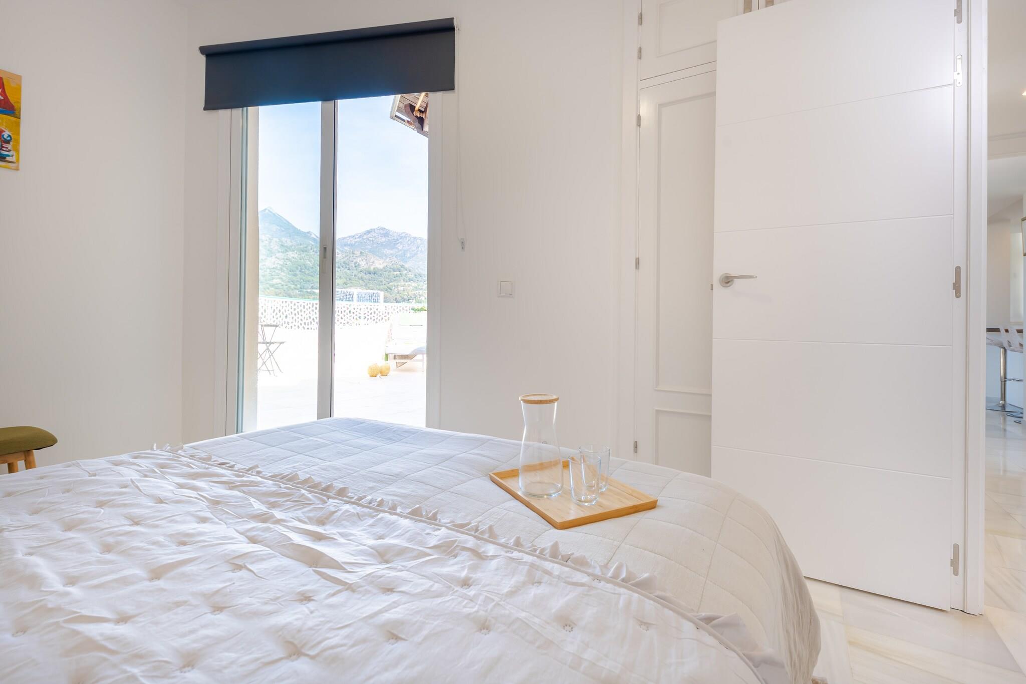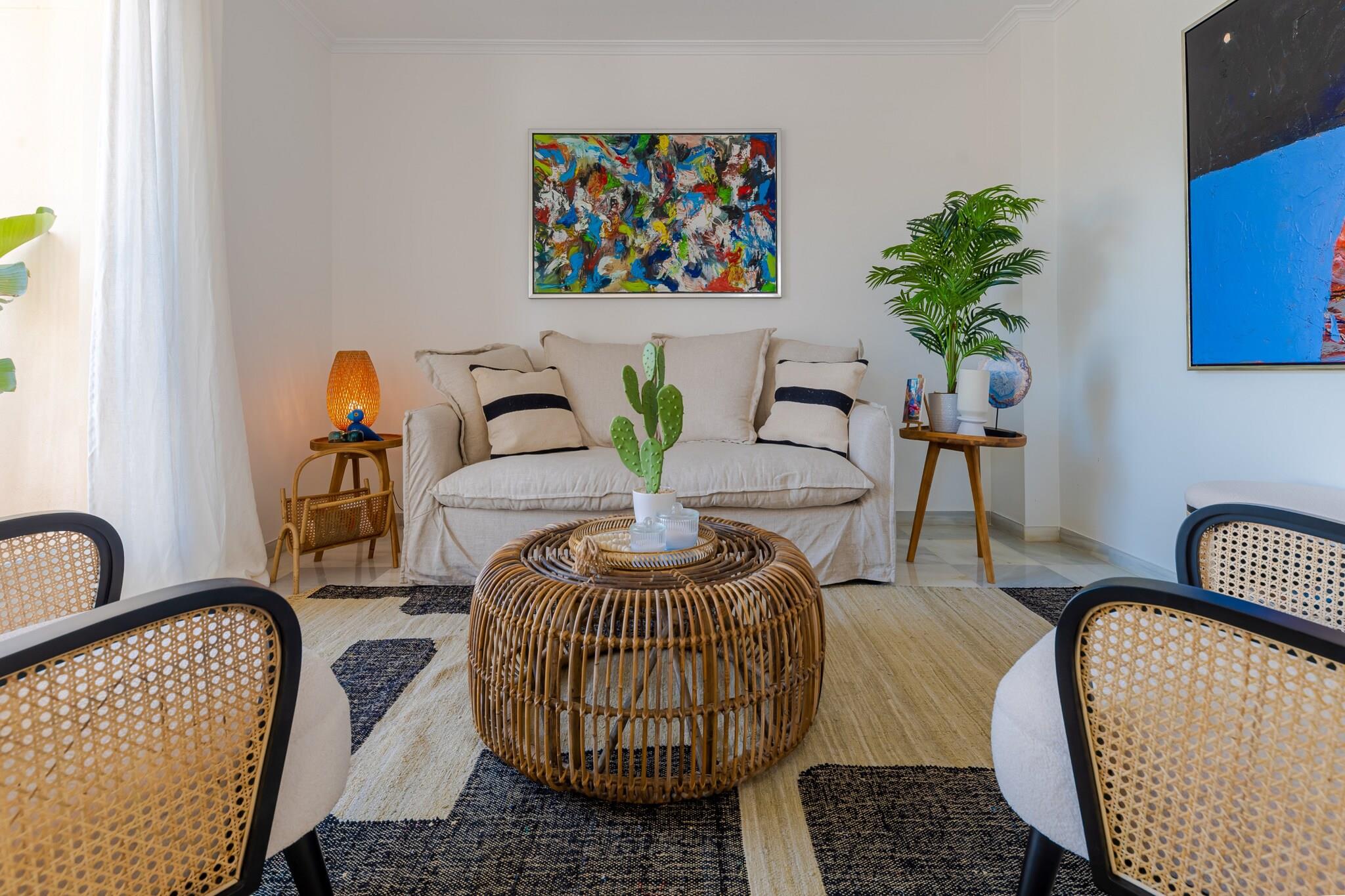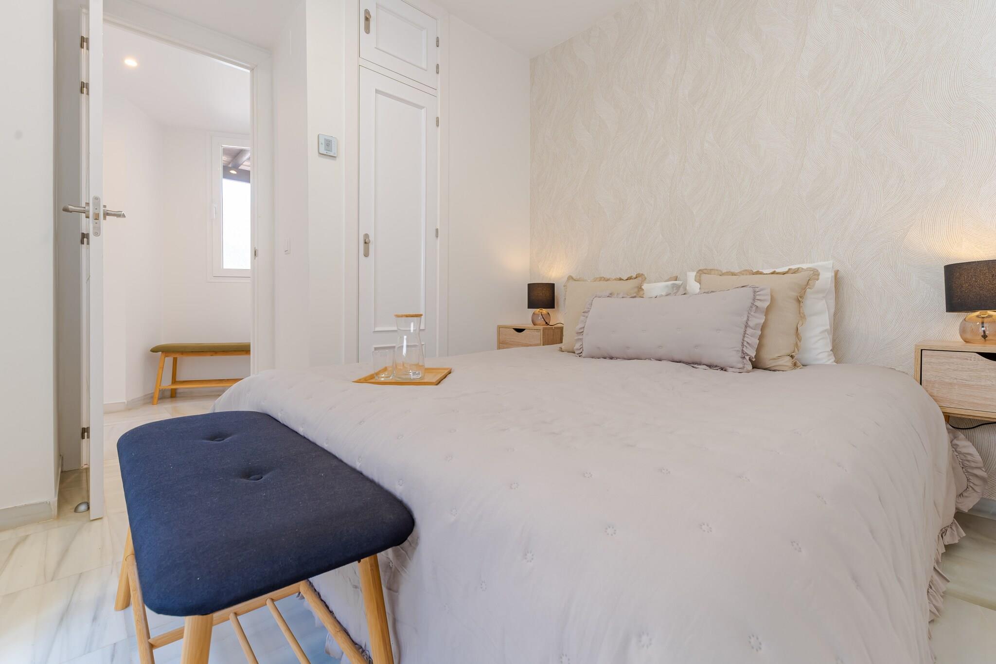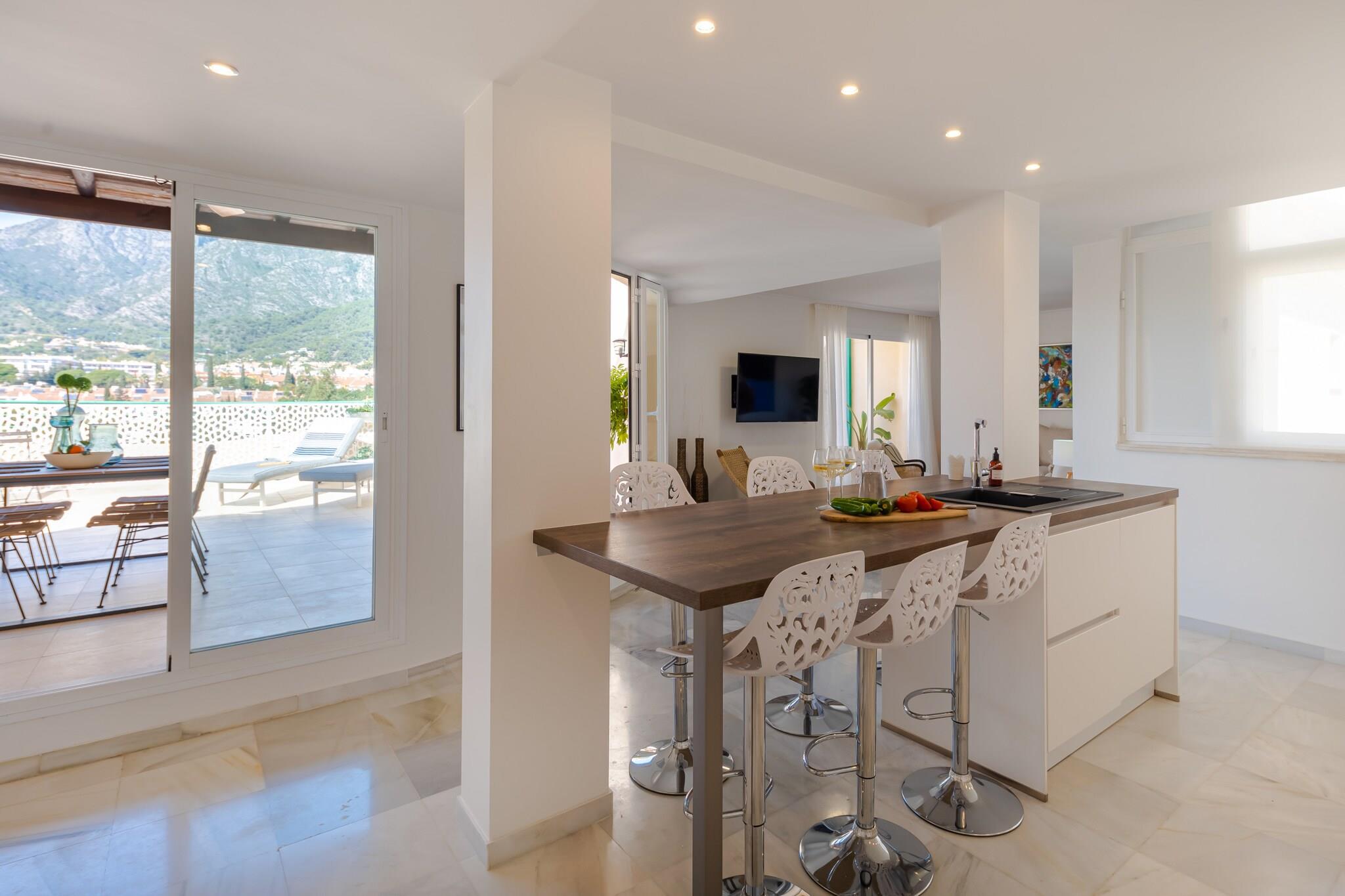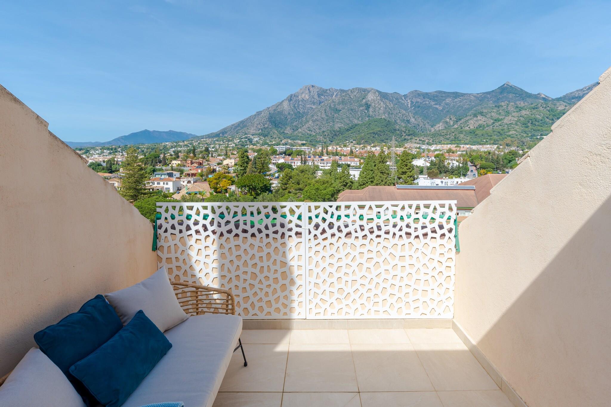 Lige i hjertet af Marbella tilbyder denne stilfulde penthouse en indbydende base for gæster, der ønsker at opleve byens energi, mens de nyder privat udendørs plads og komfort i resort-stil. Med restauranter, butikker og den berømte Marbella-promenade i nærheden er den ideel for familier eller venner, der ønsker at udforske Costa del Sol. Indenfor har lejligheden plads til op til seks gæster fordelt på tre soveværelser, der alle er indrettet med en kingsize-dobbeltseng. Den lyse stue og spiseplads har komfortable siddepladser, et tv og et spisebord til fælles måltider. Et veludstyret køkken gør det nemt at tilberede måltider under opholdet. Ejendommen har to moderne badeværelser med brusere og toiletter, mens aircondition, varme, internetadgang, elevator og en vaskemaskine sørger for daglig bekvemmelighed. Træd ud på den rummelige private terrasse, hvor havemøbler, liggestole og en grill skaber en afslappende udendørs atmosfære. Et boblebad-jacuzzi mod betaling tilføjer et ekstra strejf af luksus, perfekt til at slappe af efter en dag med udforskning af Marbella. Gæsterne har også adgang til boligkompleksets fælles swimmingpool og parkering på stedet. Penthouse-lejligheden ligger i Marbellas livlige centrum tæt på strande, strandklubber og den livlige promenade. I nærheden finder du restauranter, caféer og butikker, mens Puerto Banús og flere golfbaner ligger en kort køretur væk, hvilket giver masser af muligheder for at nyde livsstilen på Costa del Sol.