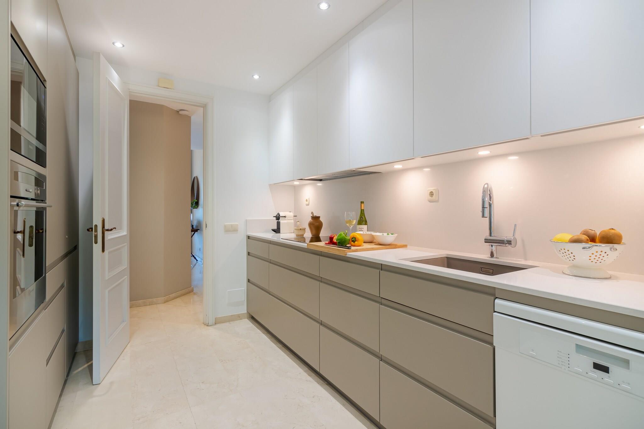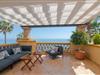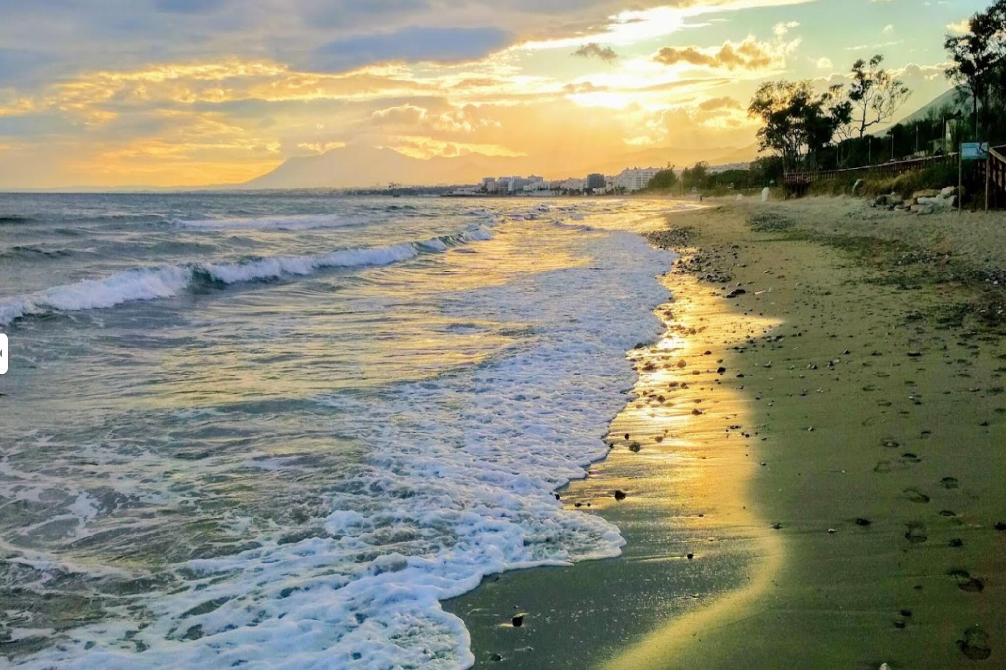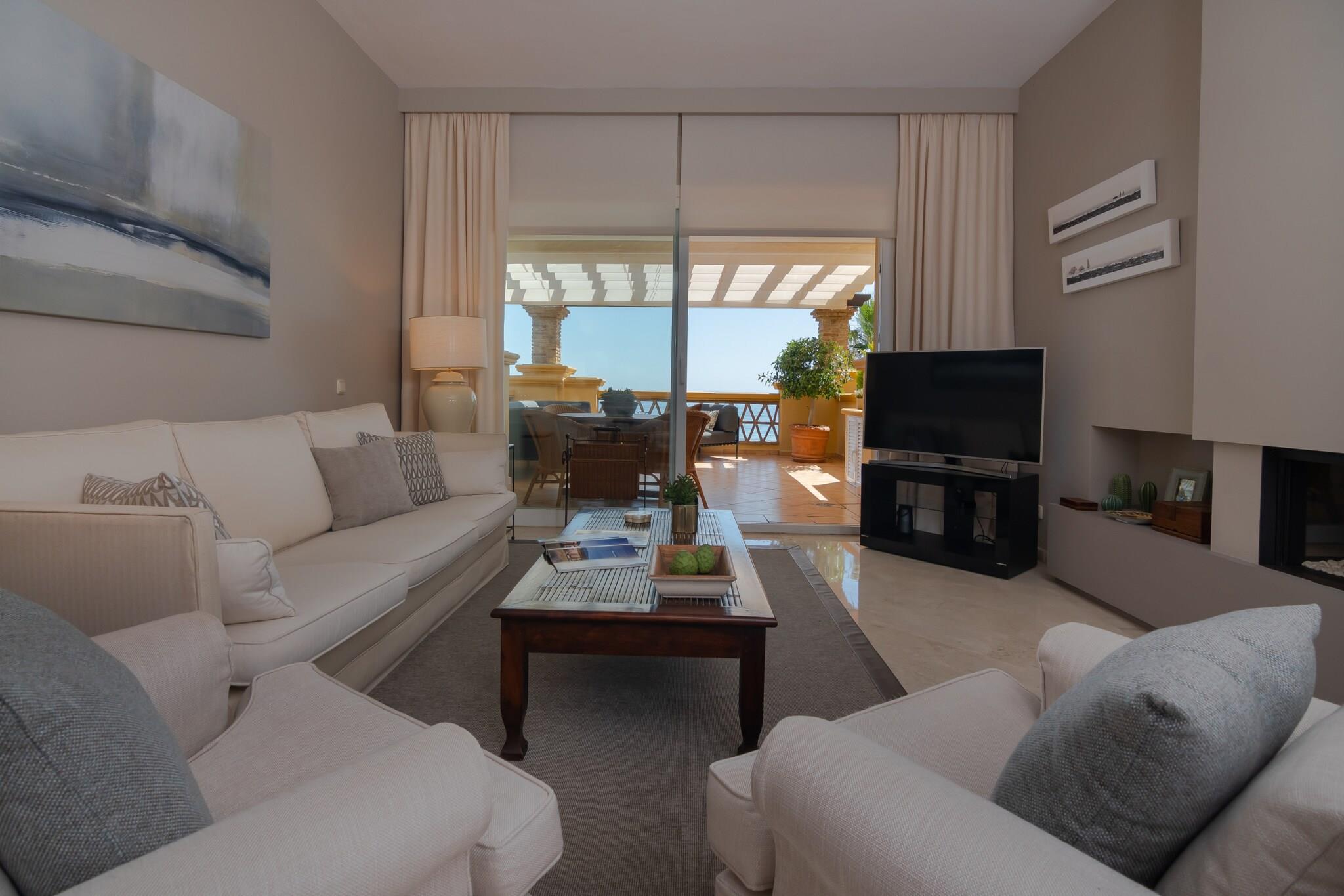 Beliggende i en af de bedste beliggenheder i et eksklusivt boligområde ved havet i Marbellas Rio Real Playa tilbyder denne eksklusive lejlighed en fantastisk havudsigt i første række og komfortabel indkvartering til op til seks gæster. Med tre smagfuldt indrettede soveværelser og tre badeværelser er den ideel til familier eller små grupper, der søger et stilfuldt og afslappet ophold kun få minutter fra Middelhavskysten. Indenfor byder den lyse stue og spiseplads på rigelig siddeplads og et spisebord til fælles måltider, med store skydedøre, der åbner ud mod en privat terrasse med udsigt over det glitrende hav. Det fuldt udstyrede køkken indeholder moderne apparater såsom køleskab, ovn, opvaskemaskine og kaffemaskine, så man nemt kan lave sin egen mad. Aircondition overalt sikrer komfort på varme sommerdage, mens gratis Wi-Fi og tv tilbyder underholdning og forbindelse. De tre soveværelser er indrettet til fleksible gruppeophold. Master-suiten har en dobbeltseng og eget badeværelse med badekar og bruser, mens det andet soveværelse også har en dobbeltseng med eget brusebad. Det tredje soveværelse har to enkeltsenge og adgang til et separat badeværelse med bruser – perfekt til ekstra gæster. Udenfor har beboerne adgang til to fælles swimmingpools, herunder en opvarmet pool i de koldere måneder, samt børnebassiner og anlagte haver. Et aflukket fælles parkeringsområde gør ankomsten problemfri. Kun en kort gåtur fra livlige strandklubber og restauranter som Trocadero Arena og kun få minutter i bil fra Puerto Banús kombinerer denne lejlighed ved stranden kystnær luksus med dagligdags bekvemmelighed på Costa del Sol.