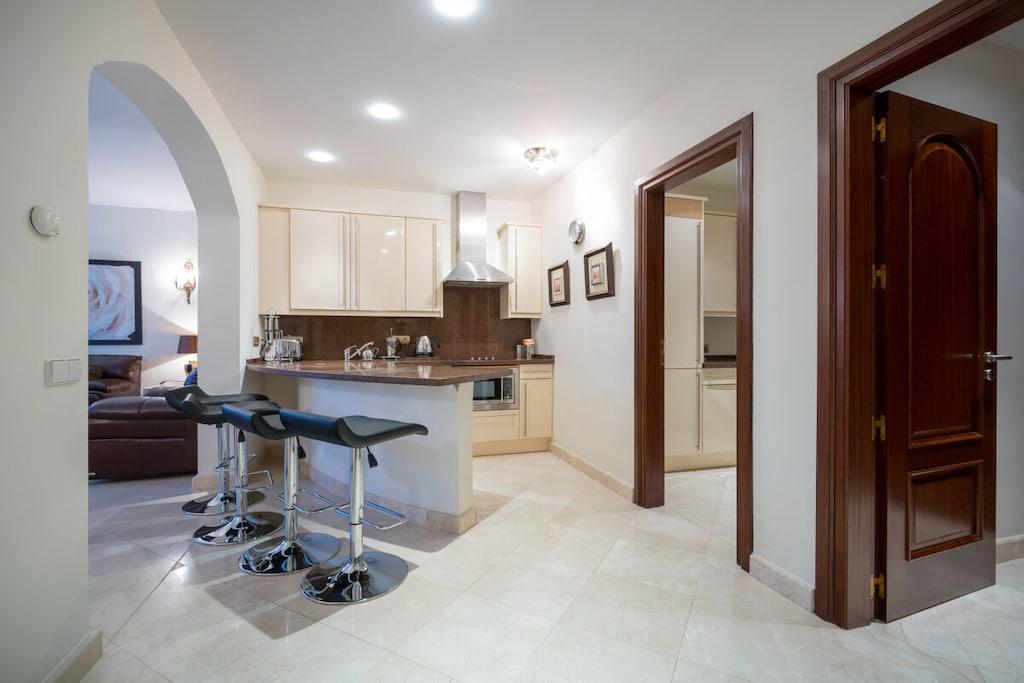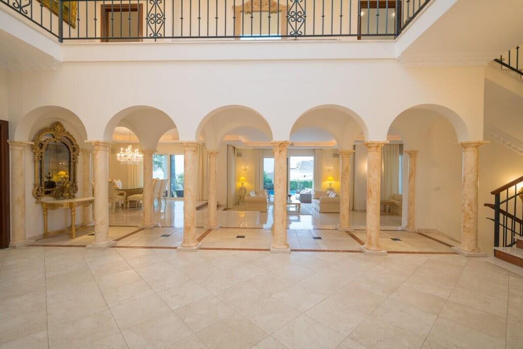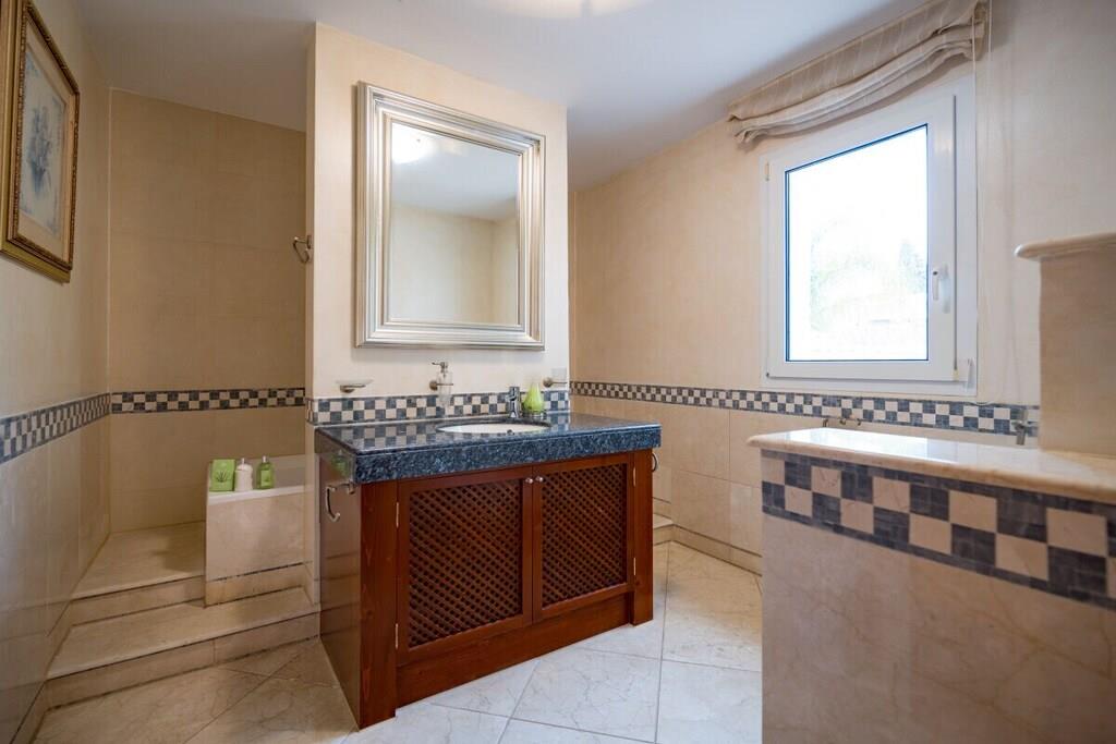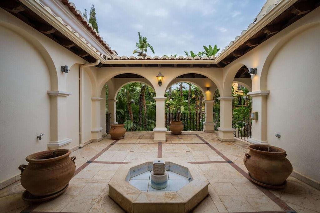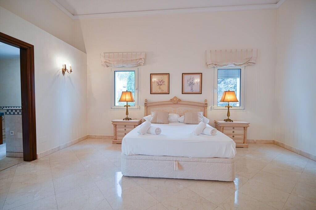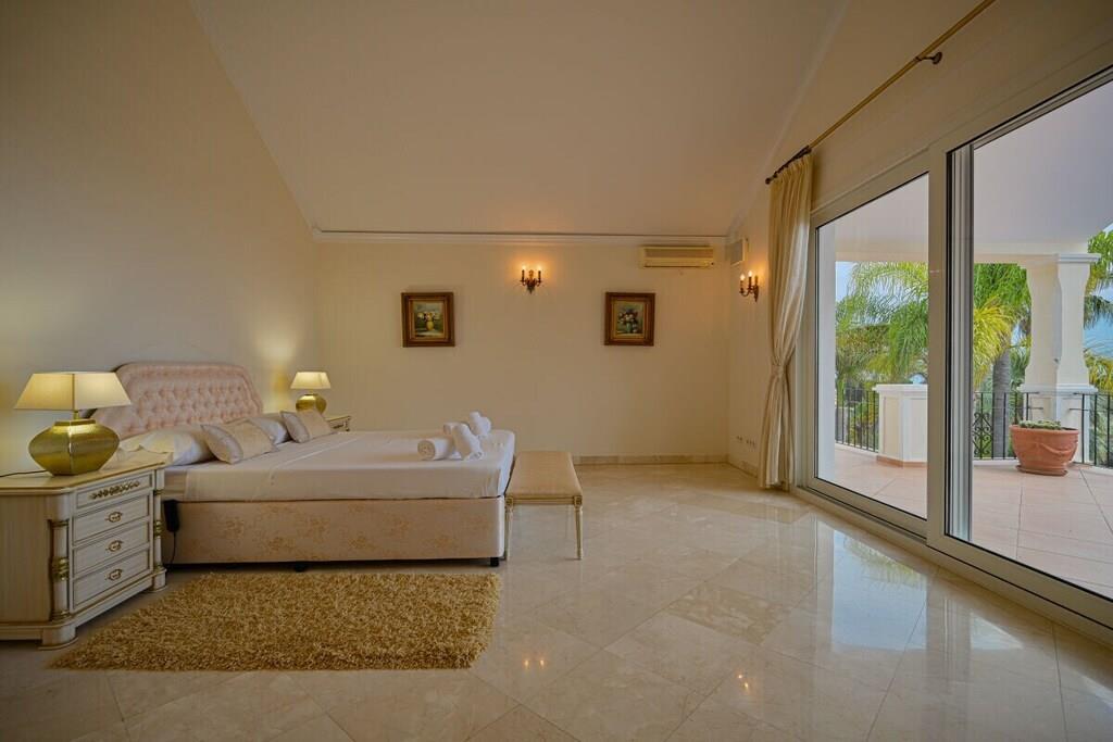 Verbringen Sie einen fabelhaften und luxuriösen Urlaub in dieser beeindruckenden, nach Südosten ausgerichteten Villa in El Rosario mit einer Fläche von 880 m2, die auf drei Ebenen gebaut ist und auf einem wunderschönen Grundstück von 1250 m2 mit einem Innenhof und einem mediterranen Garten mit üppiger Vegetation und einem beheizten Pool von 10m x 4m liegt. Die faszinierenden Innenräume und die vielseitigen Terrassen und der Garten bieten alles, wovon Sie träumen können. Der herrliche Panoramablick auf die Berge, ein privater beheizter Pool, ein Grillplatz, Sitz-, Ess- und Loungebereiche, ein beeindruckender Innenhof und ein schöner Patio sind nur ein kleiner Vorgeschmack auf das, was Sie auf diesem wunderschönen Anwesen erwartet. In unmittelbarer Nähe des Nationalparks Sierra de las Nieves und nur einen Kilometer von Playa el Alicate entfernt, können Sie hier alle Naturschönheiten des erstaunlichen Spaniens genießen. Die Villa befindet sich im oberen Teil des Viertels, so dass Sie eine unglaubliche Aussicht auf das Meer haben, an klaren, sonnigen Tagen können Sie sogar den Felsen von Gibraltar oder Afrika sehen. ~ Innen Diese beeindruckende, nach Südosten ausgerichtete Villa wurde auf drei Ebenen auf einem 1250 m2 großen Grundstück erbaut und verfügt über fünf schöne und geräumige Schlafzimmer, fünf Bäder, ein Service-WC und ein großes und helles Wohnzimmer. Die Villa verfügt über zwei Aufzüge, mit denen die verschiedenen Ebenen des Anwesens leicht zugänglich sind. Auf der ersten Ebene der Villa befindet sich ein faszinierendes Wohnzimmer, das einen schönen Blick auf den Garten und den Pool bietet. Die Marmorfliesen, Säulen, eleganten Möbel und Kronleuchter versetzen Sie zurück in die Zeit des eleganten Adels und der luxuriösen Unterkünfte. Das Wohnzimmer verfügt über einen Essbereich mit einem Glastisch und bequemen Polsterstühlen. Die beiden geräumigen Sitzecken sind mit bequemen Sofas, Couchtischen, großen Fenstern und wandgroßen Glasschiebetüren ausgestattet. Im Erdgeschoss befinden sich zwei Schlafzimmer. Das erste Schlafzimmer ist mit einem Doppelbett, Nachttischen mit Lampen, einer Kommode und Einbauschränken ausgestattet. Die Möbel sind elegant und edel, die Marmorböden vermitteln auch an heißen Sommertagen den Eindruck einer kühlen Atmosphäre. Das Familienbad verfügt über eine Badewanne mit Whirlpool, eine separate Dusche mit Regenbrause, ein Doppelwaschbecken, eine Toilette und ein Bidet. Das zweite Schlafzimmer im Erdgeschoss verfügt über ein Doppelbett, Nachttische mit Lampen, eine Kommode und Einbauschränke. Von hier aus kann man in den Garten gehen. Das Familienbadezimmer hat eine Badewanne, ein Doppelwaschbecken, eine begehbare Dusche, eine Toilette und ein Bidet und ist elegant eingerichtet. Die Küche ist modern ausgestattet, mit zwei Kühlschränken, einem Backofen, Glaskeramik, einer Kaffeemaschine, einem Toaster, einem Wasserkocher, einer Doppelspüle, einer Mikrowelle, einem Geschirrspüler und einem Dunstabzug. Auf dieser Ebene befindet sich auch eine Servicetoilette. Im zweiten Stock der Villa befinden sich zwei Schlafzimmer, die durch einen geräumigen Flur mit schmiedeeisernen und hölzernen Geländern verbunden sind. Das Hauptschlafzimmer in der obersten Etage der Villa bietet einen atemberaubenden Panoramablick über das gesamte Gebiet. Sie können das Meer und die mediterrane Vegetation und Architektur bewundern, ohne das Schlafzimmer zu verlassen. Das elektrisch verstellbare Bett von Jensen macht auch Ihren Schlaf in dieser Villa zu einem unvergesslichen Erlebnis. Sie haben auch Nachttische mit Lampen und einen Schminktisch. Der Ankleideraum ist sehr großzügig und bietet viel Platz für Stauraum. Vom Hauptschlafzimmer aus gelangen Sie auf die schöne Terrasse, von der aus Sie einen Panoramablick auf das Meer, die Berge und die Urbanisation haben. Das Hauptbadezimmer besticht durch seine eleganten Möbel und die exquisite Ausstattung. Es gibt eine Badewanne, eine begehbare Dusche, ein Doppelwaschbecken, eine Toilette und ein Bidet. Alle Schlafzimmer haben elektrische Rollläden. Das zweite Schlafzimmer auf dieser Ebene verfügt über ein Doppelbett und Nachttische mit Lampen und einem Schminktisch. Das eigene Badezimmer verfügt über eine Badewanne mit Dusche, ein Waschbecken, eine Toilette und ein Bidet. Im Erdgeschoss der Villa haben Sie Zugang zu einer separaten Wohnung mit einem schönen Wohnzimmer, das eine komfortable Sitzecke mit zwei geräumigen Ledersofas, einem Ledersessel, einem Couchtisch und einem Flachbildfernseher hat. Das Schlafzimmer hat ein Doppelbett, Nachttische mit Lampen und einen Ausgang zum Innenhof durch große Glasschiebetüren. Das eigene Badezimmer hat eine Toilette, ein Bidet und eine begehbare Dusche. Die offene Küchenzeile mit Barhockern entlang einer Insel, einem Toaster und einer Kaffeemaschine. Sie haben Zugang zu einer Waschküche mit Bügelbrett und Kühlschrank. Auf dieser Ebene der Villa haben Sie über die Garage Zugang zu einem komplett ausgestatteten Fitnessraum. Wenn Sie sich auch während Ihres Urlaubs fit halten wollen, stehen Ihnen alle notwendigen Geräte zur Verfügung: Laufband, Fahrräder, Ellipsentrainer, Hanteln. Zwei Aufzüge ermöglichen einen einfachen Zugang zu allen Ebenen der Villa. ~ Terrassen, Garten & Innenhof Die Villa verfügt über 1250 m2 schöne Terrassen, einen Innenhof und einen Garten, der sie umgibt. Der Eingang im Hof gibt Ihnen einen sehr angenehmen ersten Eindruck von der mediterranen Atmosphäre: Steinmauern, die die Privatsphäre des Grundstücks garantieren, und eine üppige mediterrane Vegetation. Der Hof und die Garage bieten Platz für bis zu 4 Autos. Über die typische Backsteintreppe gelangt man auf die Hauptebene des Grundstücks mit Garten und Palmen. Eine großzügige Treppe führt zum Haupteingang der Villa. Wenn Sie um die Villa herumgehen, werden Sie von einem wunderschönen Panorama überrascht, das die überraschend