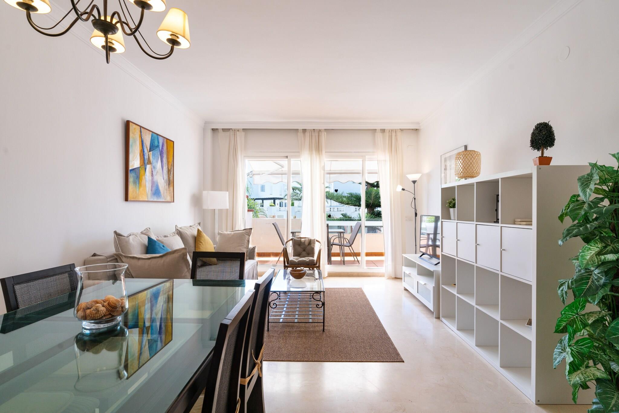 Denne lyse og rummelige lejlighed på 90 m² i Marbella tilbyder et behageligt ophold for op til fire personer, med to soveværelser og to badeværelser, hvoraf det ene er en-suite. Beliggende på første sal i et lille kompleks nær stranden i Elviria, er lejligheden udstyret med moderne bekvemmeligheder for et bekvemt og behageligt ophold. Ejendommen har en sydvendt terrasse med udsigt til haven, perfekt til at slappe af i solen. Indvendigt er lejligheden udstyret med aircondition, centralvarme og Wi-Fi overalt. Lejligheden er ideelt beliggende i gåafstand fra både stranden og lokale faciliteter, hvilket gør den til en god base for at udforske Marbella. Det omkringliggende område tilbyder nem adgang til butikker, restauranter og barer, hvilket sikrer, at gæsterne har alt, hvad de har brug for inden for rækkevidde. Nærheden til stranden giver den perfekte mulighed for at slappe af ved havet, mens Marbellas pulserende bymidte ligger en kort køretur derfra. Det fuldt udstyrede uafhængige køkken i lejligheden har moderne apparater, herunder køleskab, mikroovn, ovn, fryser og opvaskemaskine. Der er også små apparater såsom kaffemaskine, brødrister, kedel og juicer, hvilket gør det nemt at tilberede måltider. Lejligheden inkluderer alle nødvendige køkkenredskaber, sengetøj og håndklæder, hvilket sikrer, at gæsterne har alt, hvad de behøver for et behageligt ophold. Med sin blanding af bekvemmelighed, komfort og beliggenhed tilbyder denne lejlighed en ideel ramme for en afslappende ferie i Marbella.