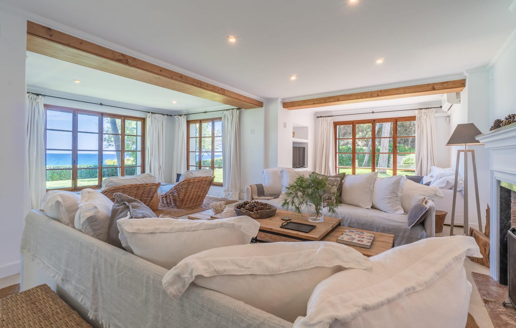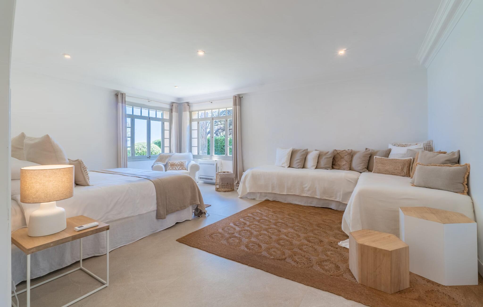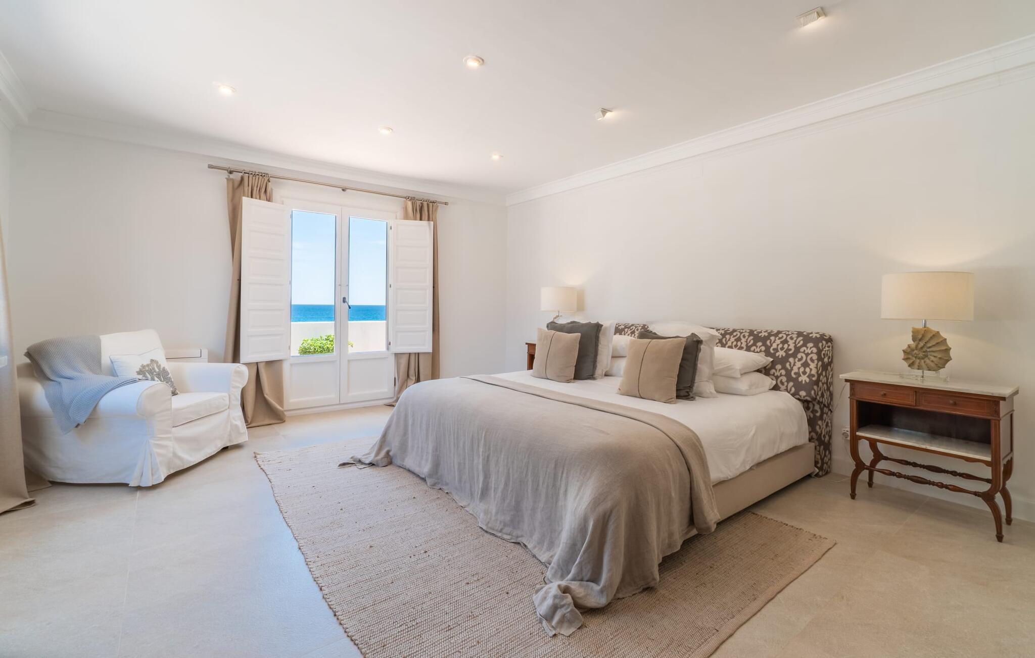 Det er et særligt øjeblik - måske banker jeres hjerte hurtigere - når I nærmer jer "Marbella"-boligen via den lange indkørsel. Villaen skinner i enhver henseende, ikke kun med sine lyse hvide facader og de arkitektoniske standarder, som den mere end lever op til. Denne premium villa ligger på græsplænen foran paradis, kun 52 m fra stranden og havet. En lille sti med egen indgangsport fører direkte til kysten. I kan bruge dette næsten som jeres egen private pool, men uden størrelsesbegrænsninger (en udendørs bruser er placeret på kanten af ??ejendommen ved siden af ??havelågen). Bygningen er omgivet af en række terrasser og frodige grønne plæner. I vil snart opdage verandaen med klassiske buer og hvide polyrattanmøbler, siddepladser i cafe-stil og et langbord med designerborde. I skal selv bestemme, hvor jeres yndlingssted er - det være sig altanen langs soveværelserne eller den afslappede lounge med hvide kurvemøbler direkte over promenaden. En ting er sikkert: alle disse steder byder på en vidunderlig, vid panoramaudsigt direkte ud til havet, som er ubebygget og kun begrænset af horisonten. Med den mobile grill kan I holde en privat fest hver dag foran denne vidunderlige kulisse - det bliver bestemt ikke kedeligt med denne spektakulære smukke udsigt. De udvendige facaders hvide (med æblegrønne skodder) og loungemøbler af høj kvalitet danner sammen med havens friske grønne og den azurblå horisont en perfekt harmoni af maritime farver. Det fuldt klimatiserede interiør er ikke mindre imponerende. Hvid stil, ideelt kombineret med en række underspillede indretninger, så meget desto mere imponerende for deres subtilitet, og en åben grundplan vil overbevise enhver skeptiker. Det vidunderlige køkken med kogeø, som også kan bruges som morgenmadsbar, og dets forskelligartede udstyr byder på ægte komfort. Det lange spisebord i landlig stil er et hyggeligt sted for måltider. Hvis I ikke bare vil nyde udsigten til haven og havet gennem de mange gulv-til-loft vinduer med sprosser, kan I i stedet beundre stukloftet med smarte designerlamper og så lade blikket vandre over den behagelige sofa i suiten. De to kurvsenge i alkoven, inklusive en afslappende udsigt, vil helt sikkert være et populært sted for morgenbrødre eller natteravner. Selv med en gruppe på tolv personer plus små børn er denne afslappende villa yderst behagelig. Generøst designede soveværelser i stueetagen og første sal er også udsøgt indrettede. De helt igennem smarte og moderne badeværelser har alle badekar og brusere. To har en-suite badeværelser, et er mellem to soveværelser og det fjerde er frit tilgængeligt, ligesom gæstebadeværelset. Kort sagt tilbyder de komplet komfort med elegant og postmoderne fliseindretning. Hvis I kan lide at sove med vinduet åbent, så vil havets blide lyd være både jeres personlige vuggevise og jeres nemme morgenvækkeur. Elsker I badeferie og havet? Så er det virkelig nemt for jer her, for kun en lille havelåge adskiller jer fra den hvide sandstrand Platja de son Moll. I kan gå til stranden når som helst på dagen. Villaen er beliggende i en smuk udvikling kaldet Es Fanger, syd for Cala Ratjada. Resortet ligger i gåafstand, hvor I kan slentre langs havnepromenaden med dens mange restauranter og caféer. Den er meget populær om sommeren, men i lavsæsonen viser den travle havneby en helt anden side med sit udsigtspunkt til fyret. Takket være den centrale beliggenhed er det omkringliggende område meget nemt at nå. Ture til markederne i de nærliggende middelalderferiesteder Capdepera eller Artà (på onsdage og tirsdage) er hurtige og nemme. Oplev jeres "egen" Mallorca på jeres egen unikke måde - og den eksklusive villa "Marbella" vil helt sikkert bidrage til jeres uforglemmelige ophold. Villa "Marbella" er et paradis lige ved havet med en utrolig smuk beliggenhed, indlejret i et af de rolige feriesteder i Cala Ratjada. Det er en behagelig og kort gåtur til feriestedet eller nabolandet Pedruscada. I kan handle der eller besøge en af ??de små byer og deres ugentlige markeder, der finder sted hver dag i de forskellige byer. Stranden er næsten lige uden for døren - Platja de son Moll ligger kun 52 m væk i luftlinje. Bemærk venligst, at denne ejendom ikke accepterer ungdomsgrupper eller polterabender. En ungdomsgruppe på denne ejendom består af personer på 25 år eller derunder. Book ikke denne ejendom, hvis I er en ungdomsgruppe eller en polterabendgruppe, da jeres reservation vil blive afvist, når den er booket, hvilket også kan være tilfældet ved ankomst til ejendommen eller under jeres ophold, og I vil ikke modtage en refusion.