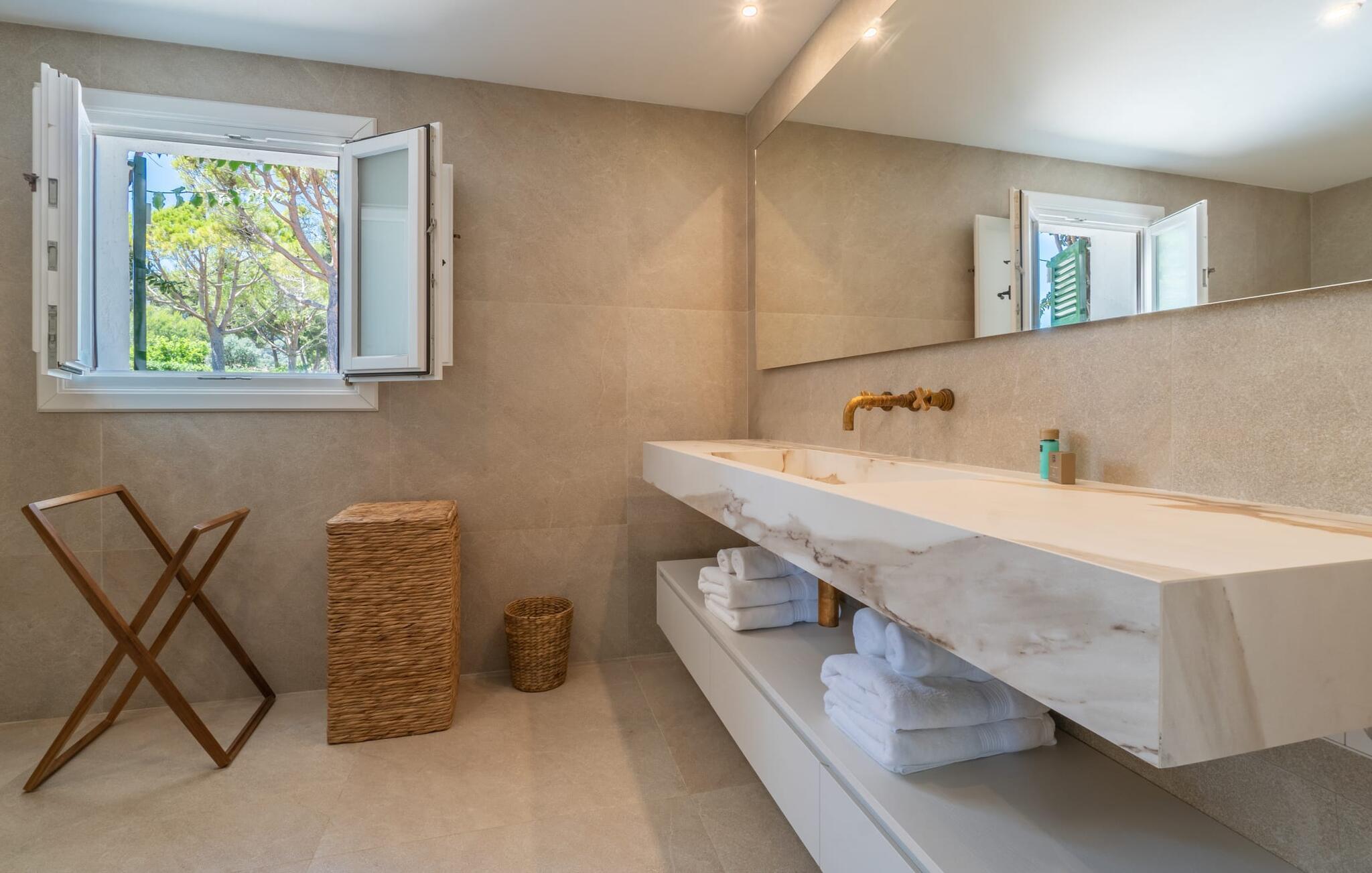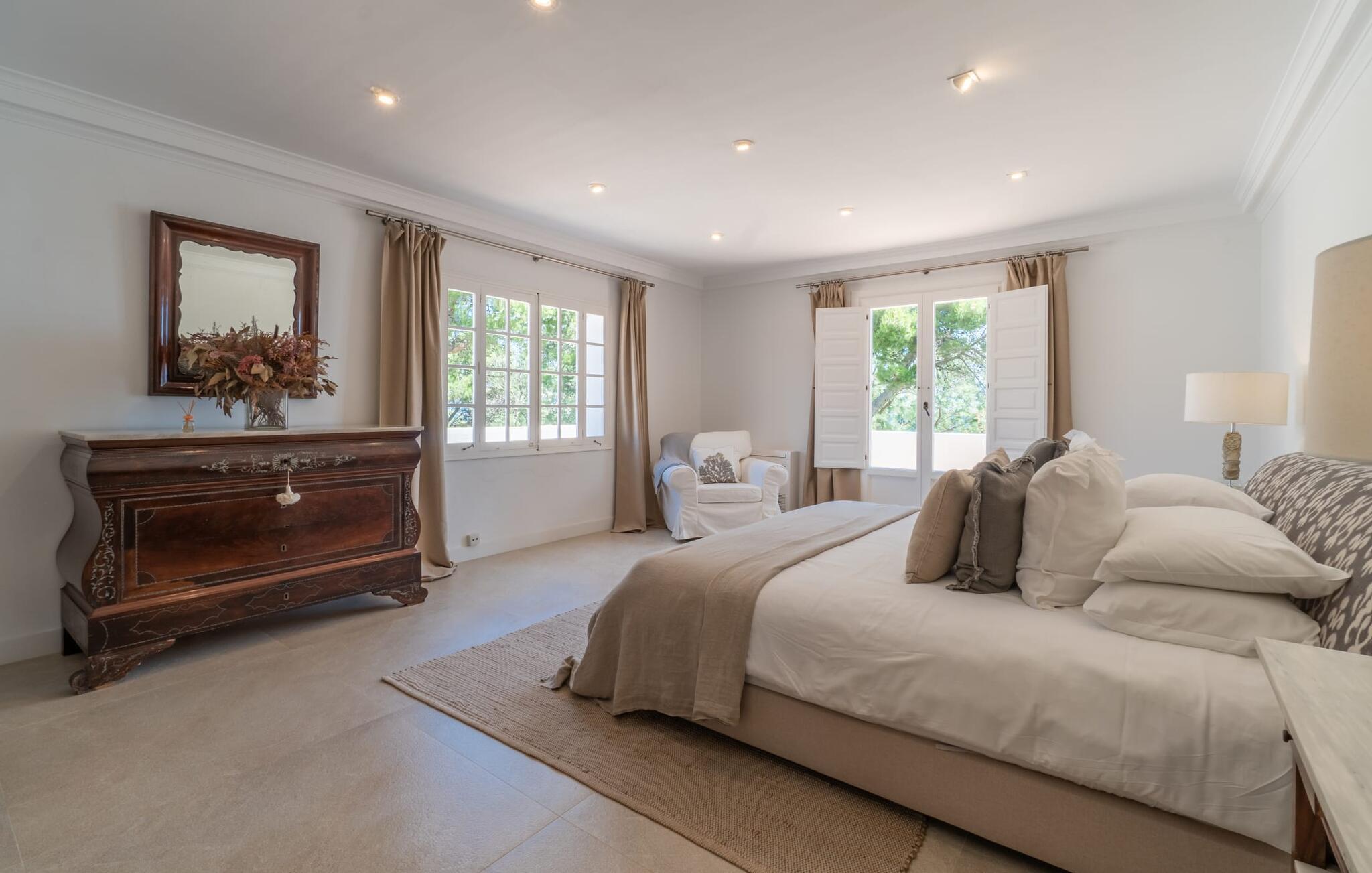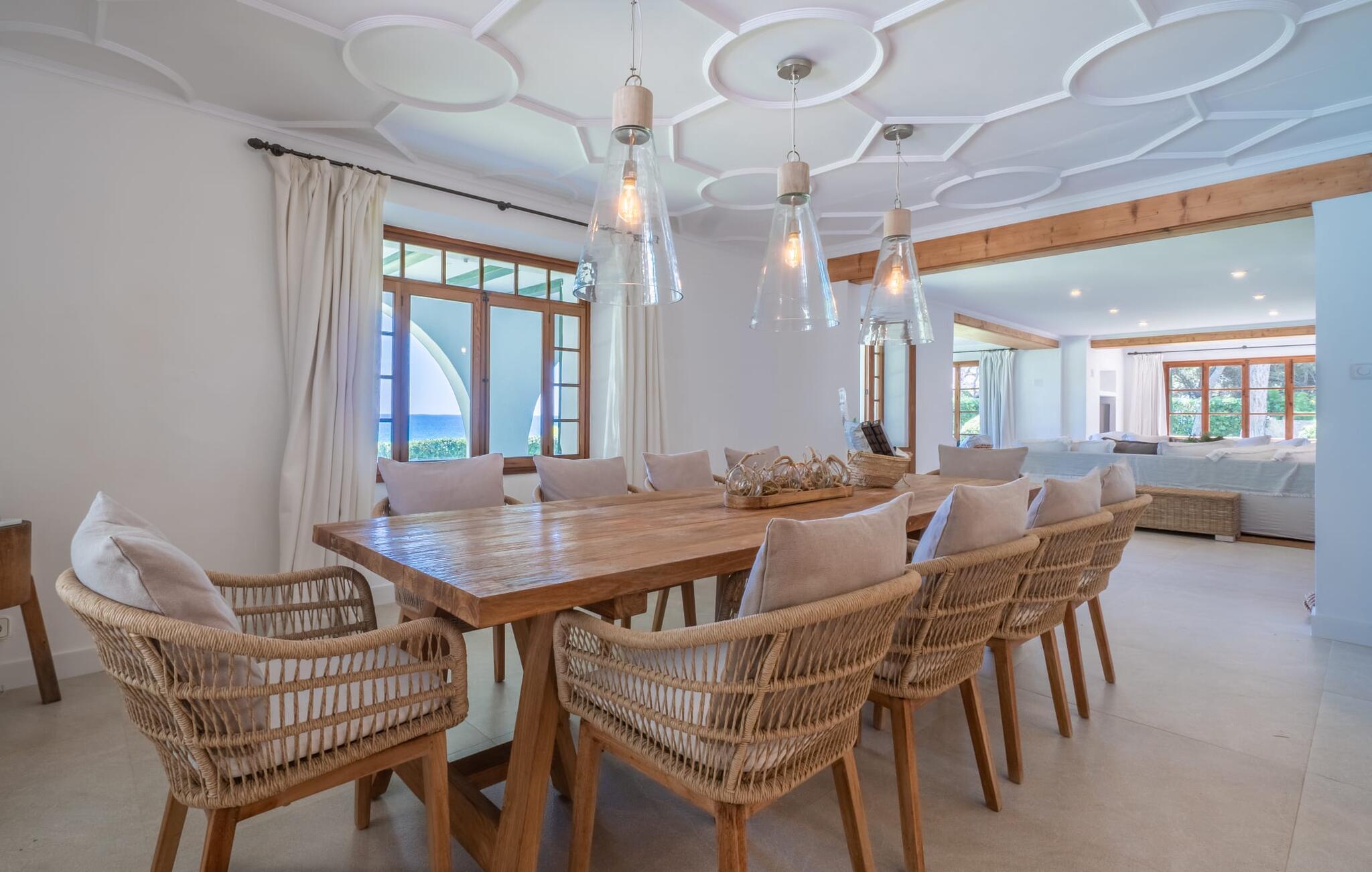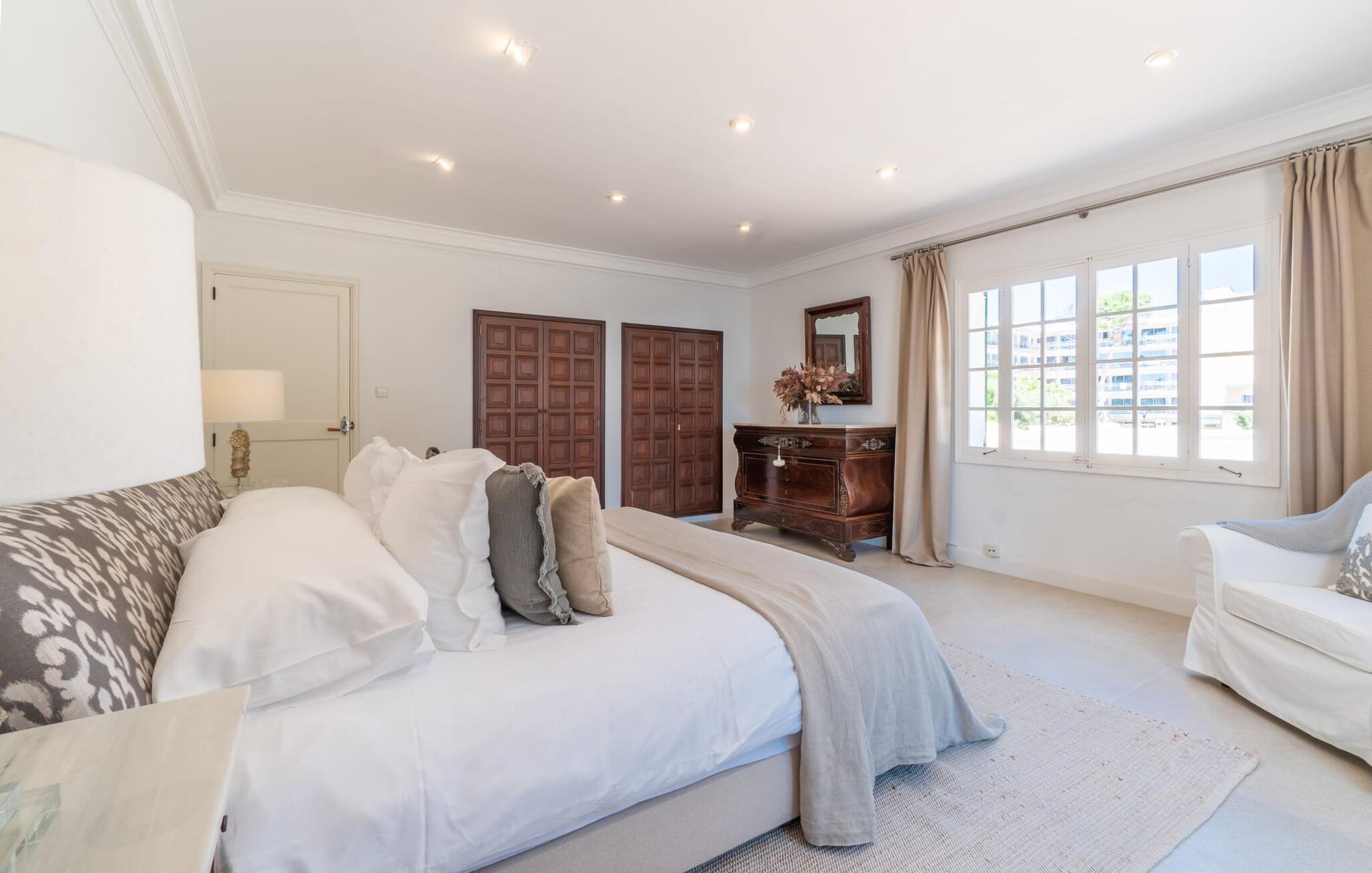 Det er et særligt øjeblik - måske banker jeres hjerte hurtigere - når I nærmer jer "Marbella"-boligen via den lange indkørsel. Villaen skinner i enhver henseende, ikke kun med sine lyse hvide facader og de arkitektoniske standarder, som den mere end lever op til. Denne premium villa ligger på græsplænen foran paradis, kun 52 m fra stranden og havet. En lille sti med egen indgangsport fører direkte til kysten. I kan bruge dette næsten som jeres egen private pool, men uden størrelsesbegrænsninger (en udendørs bruser er placeret på kanten af ??ejendommen ved siden af ??havelågen). Bygningen er omgivet af en række terrasser og frodige grønne plæner. I vil snart opdage verandaen med klassiske buer og hvide polyrattanmøbler, siddepladser i cafe-stil og et langbord med designerborde. I skal selv bestemme, hvor jeres yndlingssted er - det være sig altanen langs soveværelserne eller den afslappede lounge med hvide kurvemøbler direkte over promenaden. En ting er sikkert: alle disse steder byder på en vidunderlig, vid panoramaudsigt direkte ud til havet, som er ubebygget og kun begrænset af horisonten. Med den mobile grill kan I holde en privat fest hver dag foran denne vidunderlige kulisse - det bliver bestemt ikke kedeligt med denne spektakulære smukke udsigt. De udvendige facaders hvide (med æblegrønne skodder) og loungemøbler af høj kvalitet danner sammen med havens friske grønne og den azurblå horisont en perfekt harmoni af maritime farver. Det fuldt klimatiserede interiør er ikke mindre imponerende. Hvid stil, ideelt kombineret med en række underspillede indretninger, så meget desto mere imponerende for deres subtilitet, og en åben grundplan vil overbevise enhver skeptiker. Det vidunderlige køkken med kogeø, som også kan bruges som morgenmadsbar, og dets forskelligartede udstyr byder på ægte komfort. Det lange spisebord i landlig stil er et hyggeligt sted for måltider. Hvis I ikke bare vil nyde udsigten til haven og havet gennem de mange gulv-til-loft vinduer med sprosser, kan I i stedet beundre stukloftet med smarte designerlamper og så lade blikket vandre over den behagelige sofa i suiten. De to kurvsenge i alkoven, inklusive en afslappende udsigt, vil helt sikkert være et populært sted for morgenbrødre eller natteravner. Selv med en gruppe på tolv personer plus små børn er denne afslappende villa yderst behagelig. Generøst designede soveværelser i stueetagen og første sal er også udsøgt indrettede. De helt igennem smarte og moderne badeværelser har alle badekar og brusere. To har en-suite badeværelser, et er mellem to soveværelser og det fjerde er frit tilgængeligt, ligesom gæstebadeværelset. Kort sagt tilbyder de komplet komfort med elegant og postmoderne fliseindretning. Hvis I kan lide at sove med vinduet åbent, så vil havets blide lyd være både jeres personlige vuggevise og jeres nemme morgenvækkeur. Elsker I badeferie og havet? Så er det virkelig nemt for jer her, for kun en lille havelåge adskiller jer fra den hvide sandstrand Platja de son Moll. I kan gå til stranden når som helst på dagen. Villaen er beliggende i en smuk udvikling kaldet Es Fanger, syd for Cala Ratjada. Resortet ligger i gåafstand, hvor I kan slentre langs havnepromenaden med dens mange restauranter og caféer. Den er meget populær om sommeren, men i lavsæsonen viser den travle havneby en helt anden side med sit udsigtspunkt til fyret. Takket være den centrale beliggenhed er det omkringliggende område meget nemt at nå. Ture til markederne i de nærliggende middelalderferiesteder Capdepera eller Artà (på onsdage og tirsdage) er hurtige og nemme. Oplev jeres "egen" Mallorca på jeres egen unikke måde - og den eksklusive villa "Marbella" vil helt sikkert bidrage til jeres uforglemmelige ophold. Villa "Marbella" er et paradis lige ved havet med en utrolig smuk beliggenhed, indlejret i et af de rolige feriesteder i Cala Ratjada. Det er en behagelig og kort gåtur til feriestedet eller nabolandet Pedruscada. I kan handle der eller besøge en af ??de små byer og deres ugentlige markeder, der finder sted hver dag i de forskellige byer. Stranden er næsten lige uden for døren - Platja de son Moll ligger kun 52 m væk i luftlinje. Bemærk venligst, at denne ejendom ikke accepterer ungdomsgrupper eller polterabender. En ungdomsgruppe på denne ejendom består af personer på 25 år eller derunder. Book ikke denne ejendom, hvis I er en ungdomsgruppe eller en polterabendgruppe, da jeres reservation vil blive afvist, når den er booket, hvilket også kan være tilfældet ved ankomst til ejendommen eller under jeres ophold, og I vil ikke modtage en refusion.