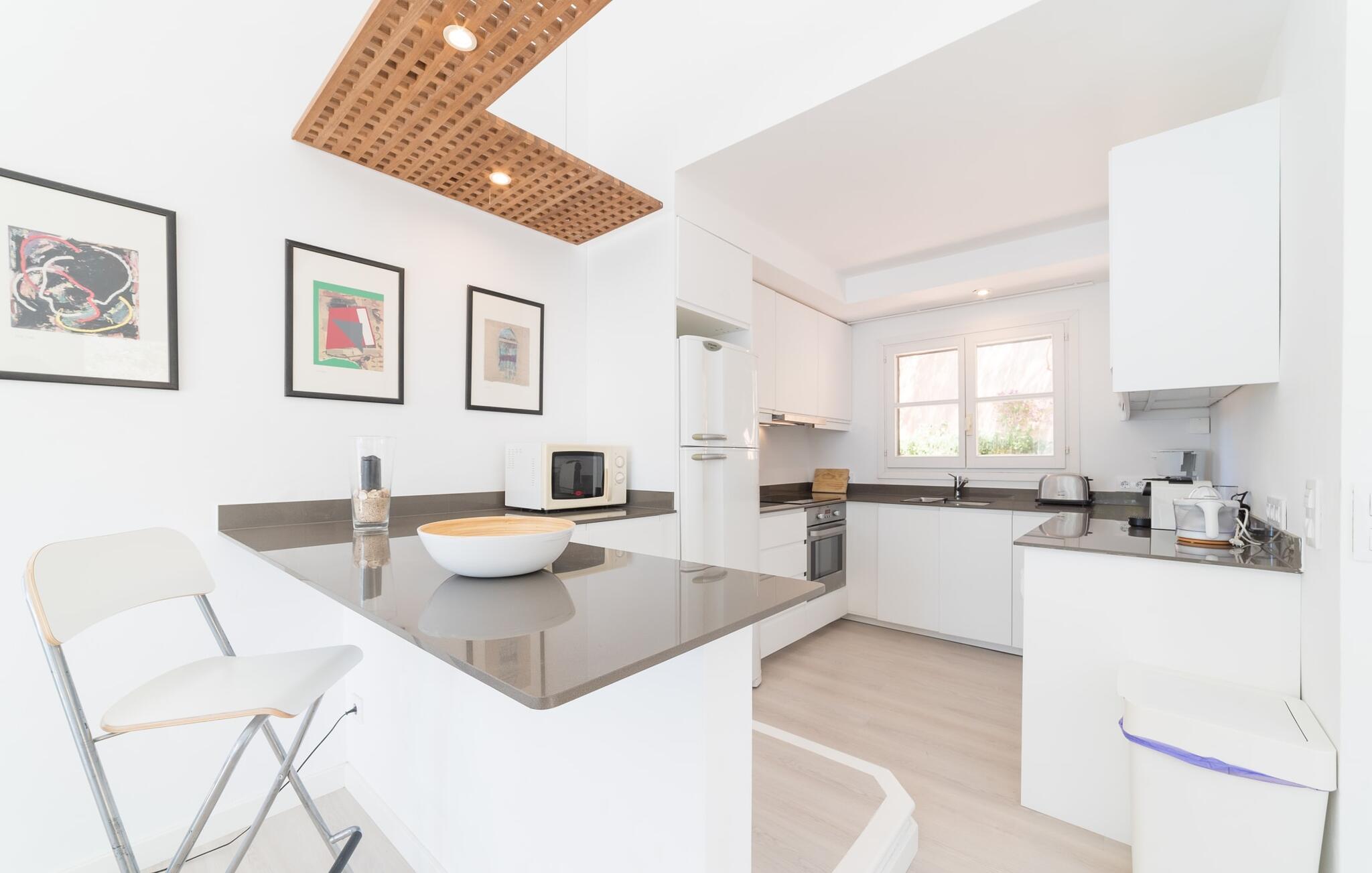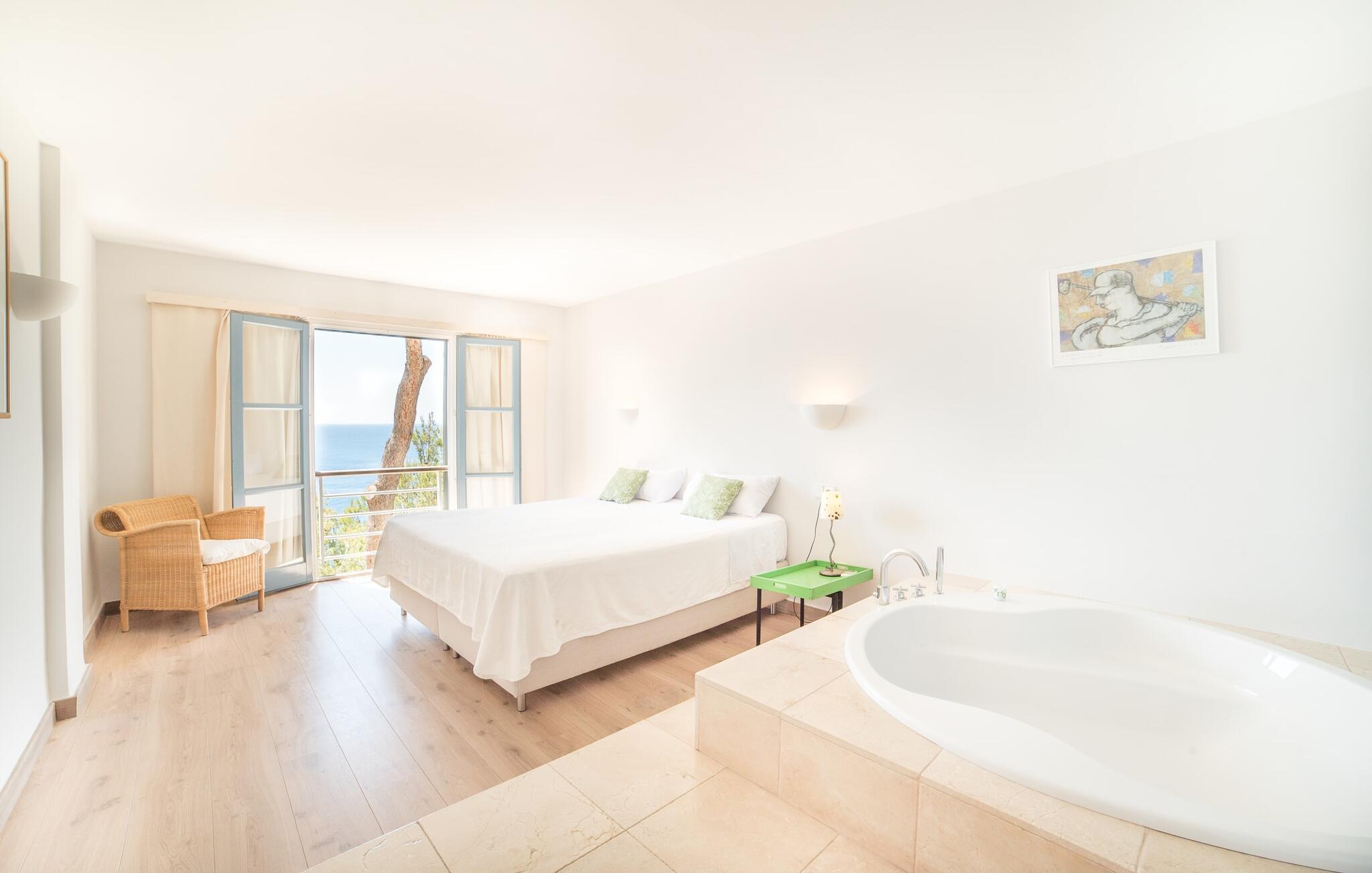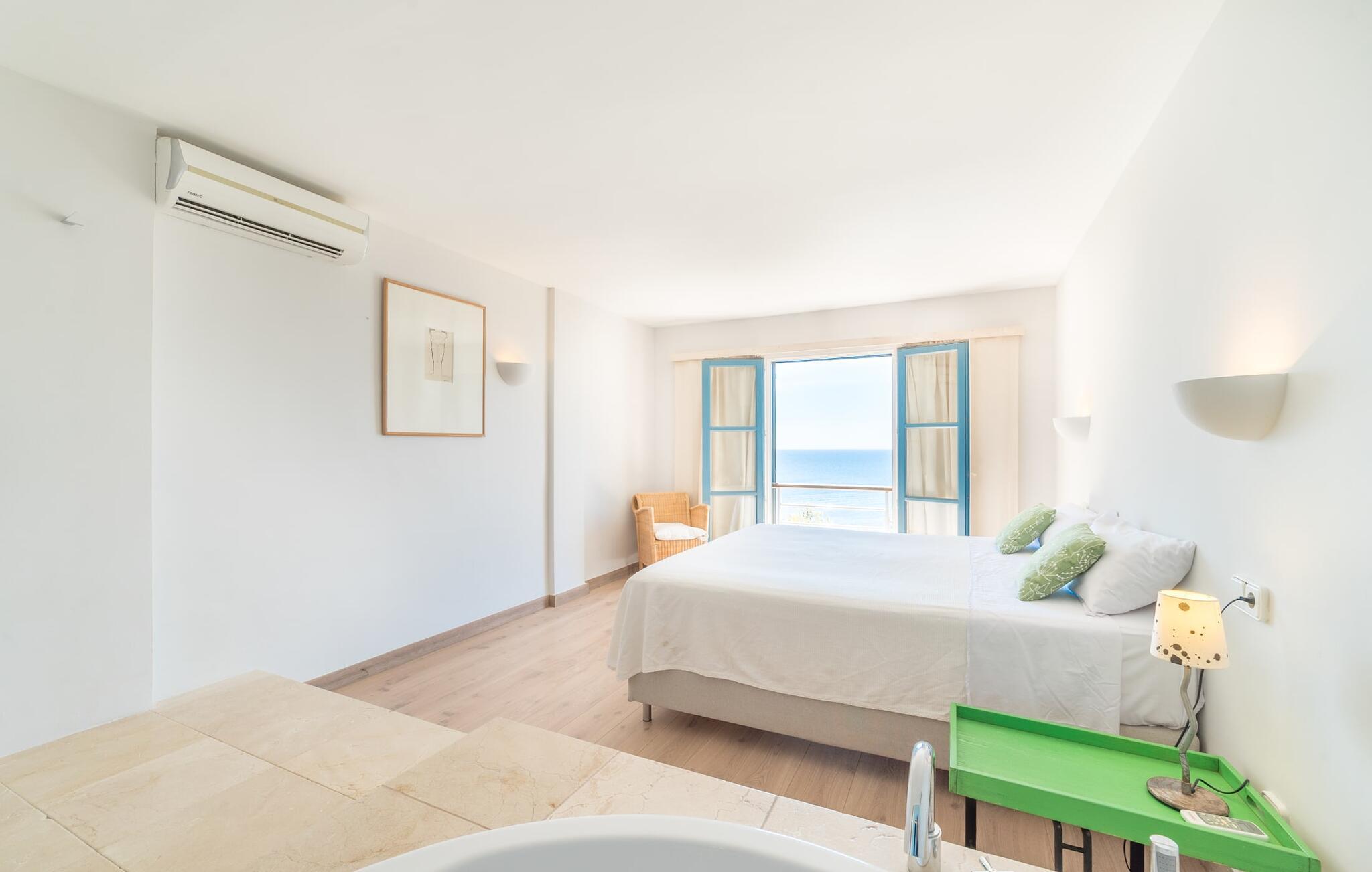 Den cremefarvede villa "Marblau" tilbyder en panoramaudsigt over havet, næsten inden for rækkevidde. Til højre kan I se bugten og byen Canyamel. Til venstre kan man nyde frit udsyn, for det dejligt afslappede hus står på den bebyggede bebyggelses sidste sten. I kan opleve den næsten uberørte natur af de fyrretræsklædte klipper og nyde det uforglemmelige syn af bølgerne, der bryder på de til tider ret forrevne klipper. På grund af bjergskråningens beliggenhed er der kun et begrænset udendørsareal til rådighed for jer, men den lille græsplæne foran de to soveværelser i stueetagen byder på et komfortabelt opholdsområde med et bord og et afslapningsområde til liggestolene i skyggen af træerne. Den øverste etage har også en balkon med havudsigt, hvor I kan nyde jeres morgenkaffe og se på det turkise hav. Den lyse blå af skodder og yderrammer fortsætter dette farveskema. På grund af nærheden til havet behøver I faktisk ikke et kunstigt sted at svømme; Der er dog en ret stor og meget velholdt fælles pool, som kan benyttes af alle gæster. Interiøret i den charmerende ukomplicerede villa skinner i trendy hvidt. På altanplan er der adgang til et stort værelse, der kombinerer ophold, spisestue og madlavning i moderne stil. De lyse sofaer og runde fletlænestole inviterer jer til at tilbringe en hyggelig aften med at se tv. Spisebordet er placeret direkte foran pejsen - en interessant detalje i dette hus, som kan bookes hele året rundt, og som udover centralvarmen sørger for hyggelig varme. Det hvide, fuldt udstyrede køkken er skjult i en niche og visuelt adskilt fra opholdsområdet af en disk. Selvom I ikke rydder op umiddelbart efter aftensmaden, generer det ingen, og den afslappede stemning forbliver. Baren i amerikansk stil er ikke kun et køligt sted at sidde, men kan også hjælpe med madlavning. En trætrappe ser ud til at "svæve" i rummet. Det fører til et åbent galleri, hvorfor der er dejligt højt til loftet. Der er i alt to soveværelser (alle med aircondition) til rådighed for en lille rejsegruppe. De to premium soveværelser på niveauet nedenfor er hver udstyret med et trendy en-suite brusebad. Det specielle ved disse to suiter er dog det luksuriøse badekar, der ligger mellem sengen og badeværelset. Villaen er derfor ideel til to par (en ekstra babyseng kan bestilles, hvis det kræves). Men uden for højsæsonen er priserne så attraktive, at dette pragtfulde strandhus også kan bruges af et enkelt par til en romantisk ferie. Selv navnet på det smukke feriested Canyamel er dejligt og lyder som noget sødt og smukt. Etymologien understøtter denne idé, da navnet er afledt af det latinske ord for "sukkerrør", som med succes blev dyrket her i 1700-tallet. Nu om dage kommer folk til området for at forkæle sig selv med noget sødt – nemlig en afslappende ferie i en afslappende villa med havudsigt, ligesom "Marblau". Den fine sandstrand har fremragende vandkvalitet og er endda blevet tildelt det Blå Flag. Samtidig er denne region et paradis for golfspillere, da den udfordrende golfbane Canyamel kun ligger 2 km væk. Imponerende seværdigheder som Coves d'Artà – et imponerende hulesystem – er næsten inden for syne og kun en kort køretur væk. Efter vores mening er "Marblau" absolut anbefalelsesværdig og vil overbevise jer med sin høje afslapningsfaktor! Den maritime villa "Marblau" ligger majestætisk i et smart boligområde i udkanten af den charmerende kystby Canyamel. Nyd en sensationel udsigt over havet, klippekysten og byen, hvor I vil finde supermarkeder til dagligvareindkøb samt nogle fremragende restauranter og barer. Den smukke by kan nås til fods via en bro - det samme kan Playa de Canyamel, en fin sandstrand med en malerisk kulisse.