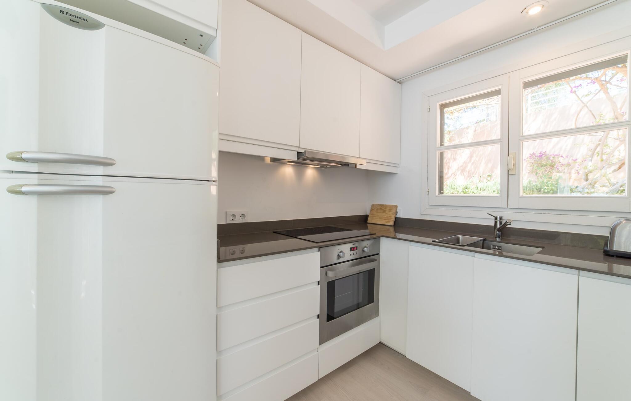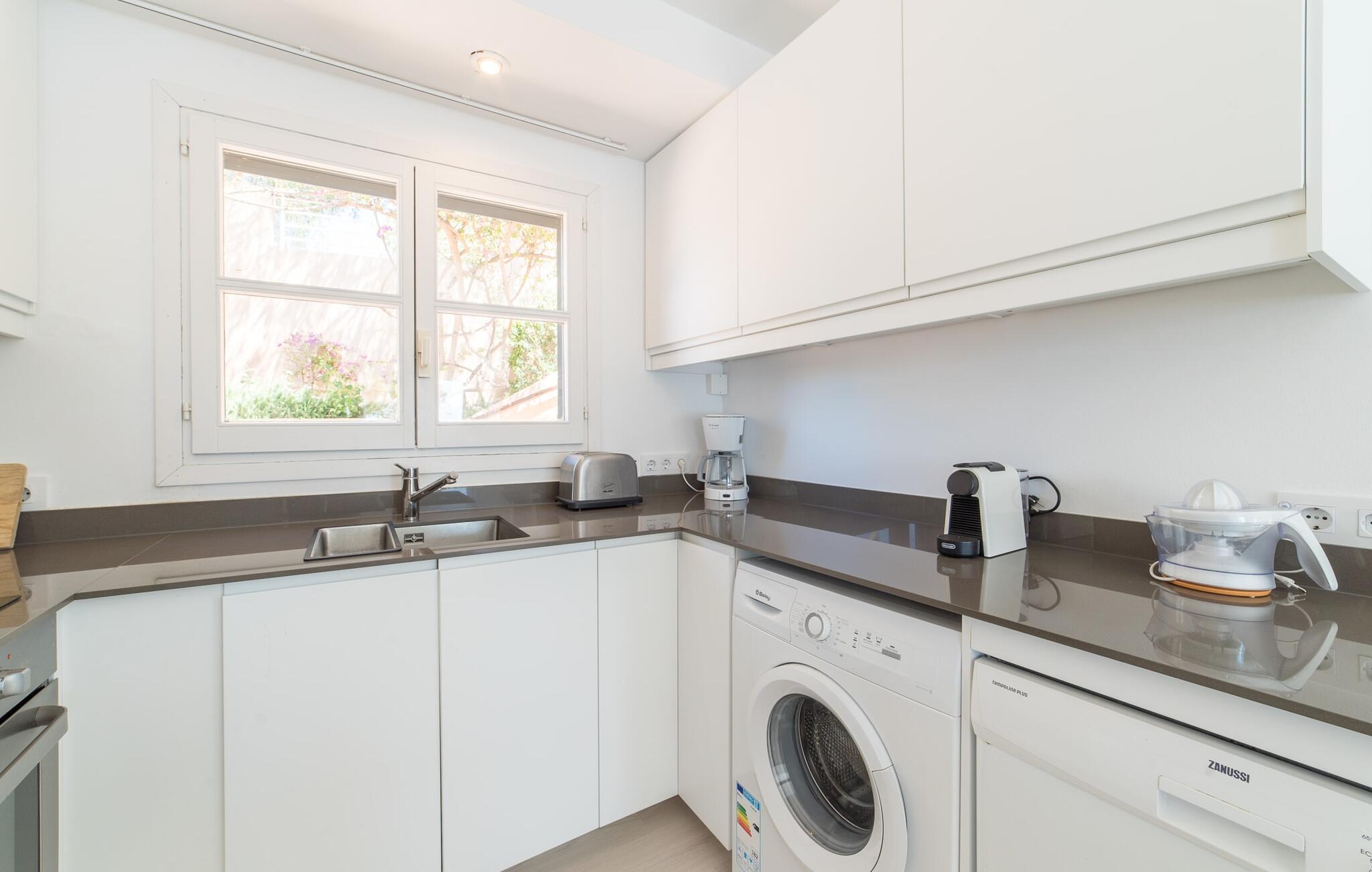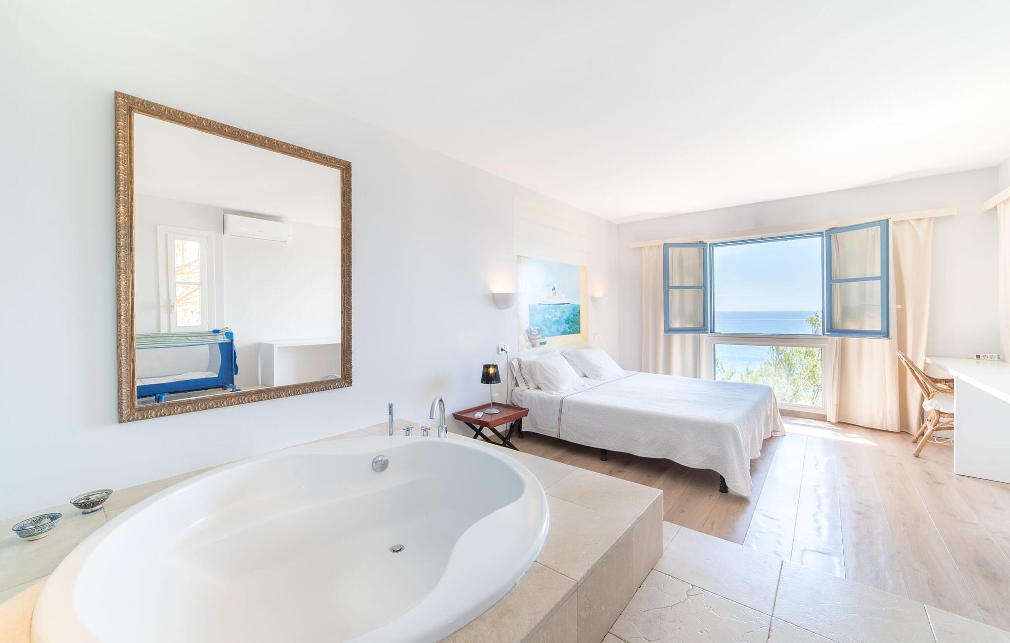 Den cremefarvede villa "Marblau" tilbyder en panoramaudsigt over havet, næsten inden for rækkevidde. Til højre kan I se bugten og byen Canyamel. Til venstre kan man nyde frit udsyn, for det dejligt afslappede hus står på den bebyggede bebyggelses sidste sten. I kan opleve den næsten uberørte natur af de fyrretræsklædte klipper og nyde det uforglemmelige syn af bølgerne, der bryder på de til tider ret forrevne klipper. På grund af bjergskråningens beliggenhed er der kun et begrænset udendørsareal til rådighed for jer, men den lille græsplæne foran de to soveværelser i stueetagen byder på et komfortabelt opholdsområde med et bord og et afslapningsområde til liggestolene i skyggen af træerne. Den øverste etage har også en balkon med havudsigt, hvor I kan nyde jeres morgenkaffe og se på det turkise hav. Den lyse blå af skodder og yderrammer fortsætter dette farveskema. På grund af nærheden til havet behøver I faktisk ikke et kunstigt sted at svømme; Der er dog en ret stor og meget velholdt fælles pool, som kan benyttes af alle gæster. Interiøret i den charmerende ukomplicerede villa skinner i trendy hvidt. På altanplan er der adgang til et stort værelse, der kombinerer ophold, spisestue og madlavning i moderne stil. De lyse sofaer og runde fletlænestole inviterer jer til at tilbringe en hyggelig aften med at se tv. Spisebordet er placeret direkte foran pejsen - en interessant detalje i dette hus, som kan bookes hele året rundt, og som udover centralvarmen sørger for hyggelig varme. Det hvide, fuldt udstyrede køkken er skjult i en niche og visuelt adskilt fra opholdsområdet af en disk. Selvom I ikke rydder op umiddelbart efter aftensmaden, generer det ingen, og den afslappede stemning forbliver. Baren i amerikansk stil er ikke kun et køligt sted at sidde, men kan også hjælpe med madlavning. En trætrappe ser ud til at "svæve" i rummet. Det fører til et åbent galleri, hvorfor der er dejligt højt til loftet. Der er i alt to soveværelser (alle med aircondition) til rådighed for en lille rejsegruppe. De to premium soveværelser på niveauet nedenfor er hver udstyret med et trendy en-suite brusebad. Det specielle ved disse to suiter er dog det luksuriøse badekar, der ligger mellem sengen og badeværelset. Villaen er derfor ideel til to par (en ekstra babyseng kan bestilles, hvis det kræves). Men uden for højsæsonen er priserne så attraktive, at dette pragtfulde strandhus også kan bruges af et enkelt par til en romantisk ferie. Selv navnet på det smukke feriested Canyamel er dejligt og lyder som noget sødt og smukt. Etymologien understøtter denne idé, da navnet er afledt af det latinske ord for "sukkerrør", som med succes blev dyrket her i 1700-tallet. Nu om dage kommer folk til området for at forkæle sig selv med noget sødt – nemlig en afslappende ferie i en afslappende villa med havudsigt, ligesom "Marblau". Den fine sandstrand har fremragende vandkvalitet og er endda blevet tildelt det Blå Flag. Samtidig er denne region et paradis for golfspillere, da den udfordrende golfbane Canyamel kun ligger 2 km væk. Imponerende seværdigheder som Coves d'Artà – et imponerende hulesystem – er næsten inden for syne og kun en kort køretur væk. Efter vores mening er "Marblau" absolut anbefalelsesværdig og vil overbevise jer med sin høje afslapningsfaktor! Den maritime villa "Marblau" ligger majestætisk i et smart boligområde i udkanten af den charmerende kystby Canyamel. Nyd en sensationel udsigt over havet, klippekysten og byen, hvor I vil finde supermarkeder til dagligvareindkøb samt nogle fremragende restauranter og barer. Den smukke by kan nås til fods via en bro - det samme kan Playa de Canyamel, en fin sandstrand med en malerisk kulisse.