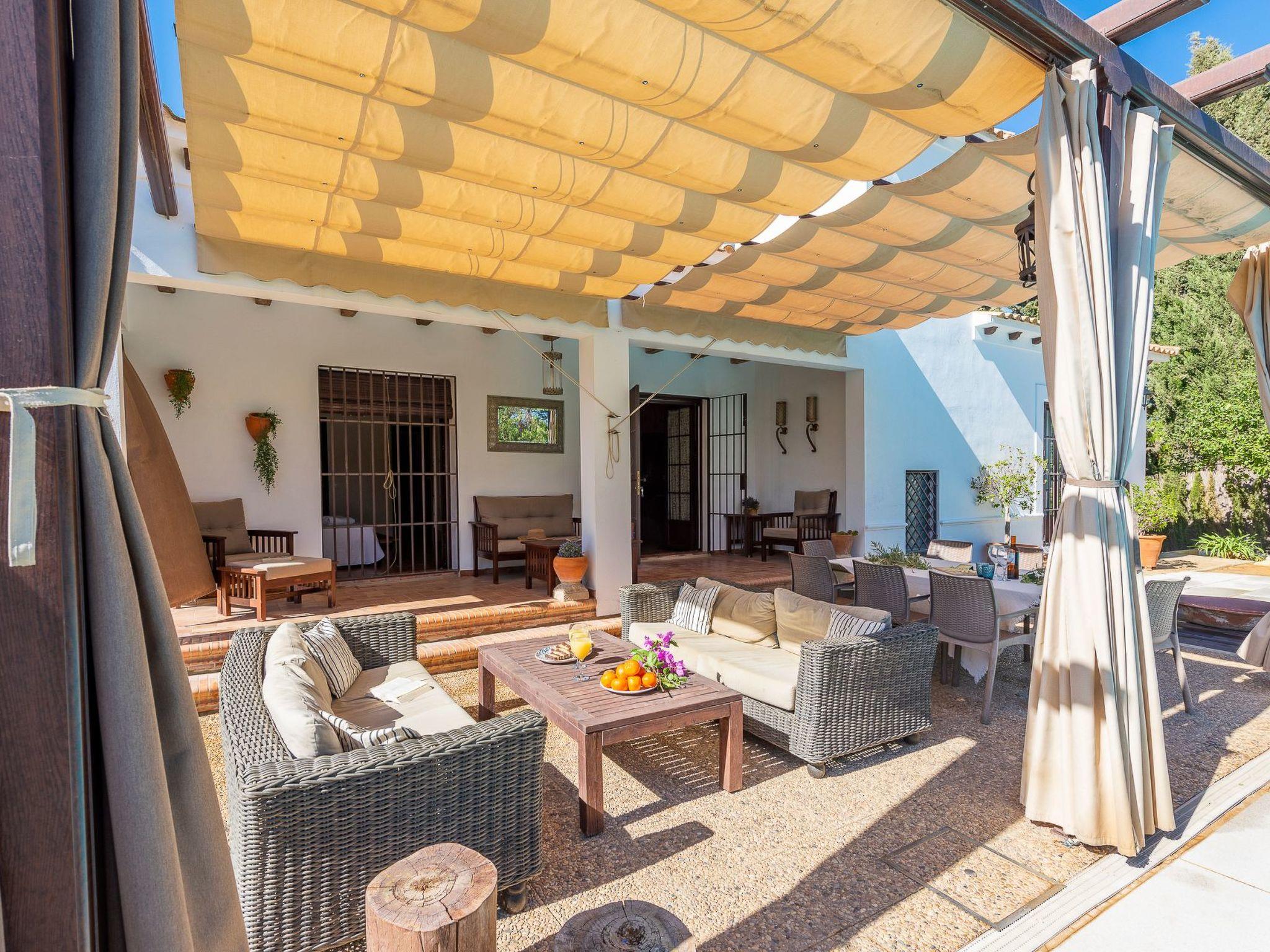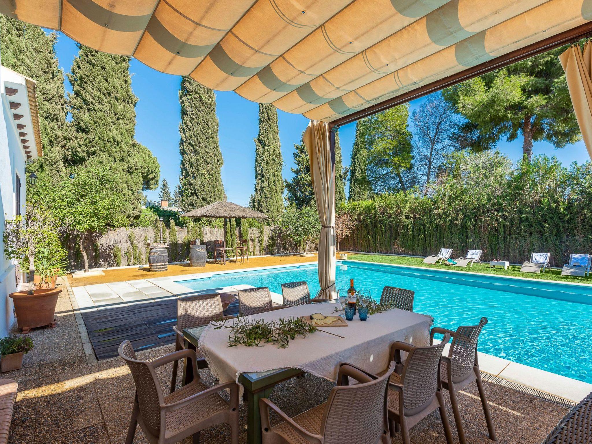 Pergola with outdoor furniture in front of the swimming pool.