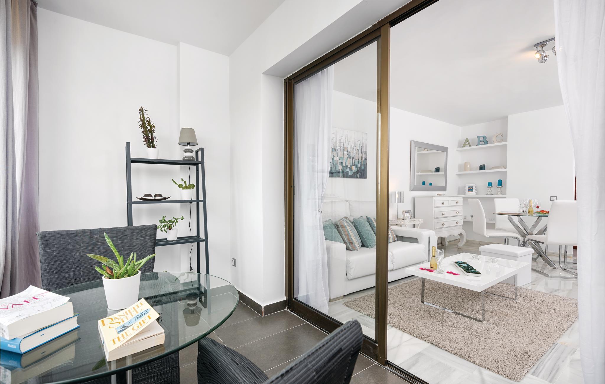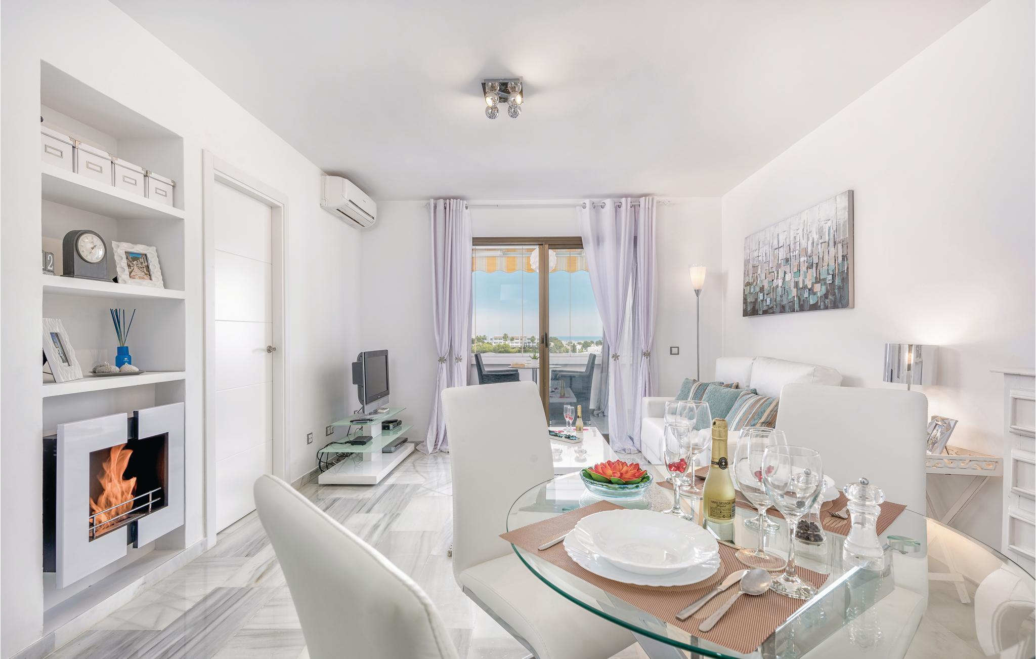 Luksuøs ferielejlighed der er stilfuldt indrettet med sans for små deltaljer. Gennem den store vinduesfront er der udsigt ud over både ferieanlægget og havet. I lejligheden er der to soveværelser og to badeværelser. Fra anlægget er der en fantastisk udsigt ud over både middelhavet og bjergene. Til dette anlæg hører en velplejet have og en fælles pool. Det tager kun få minutter at få til restauranter, supermarked osv. I kan parkere på en parkeringsplads med elektrisk port, der ligger i anlægget.