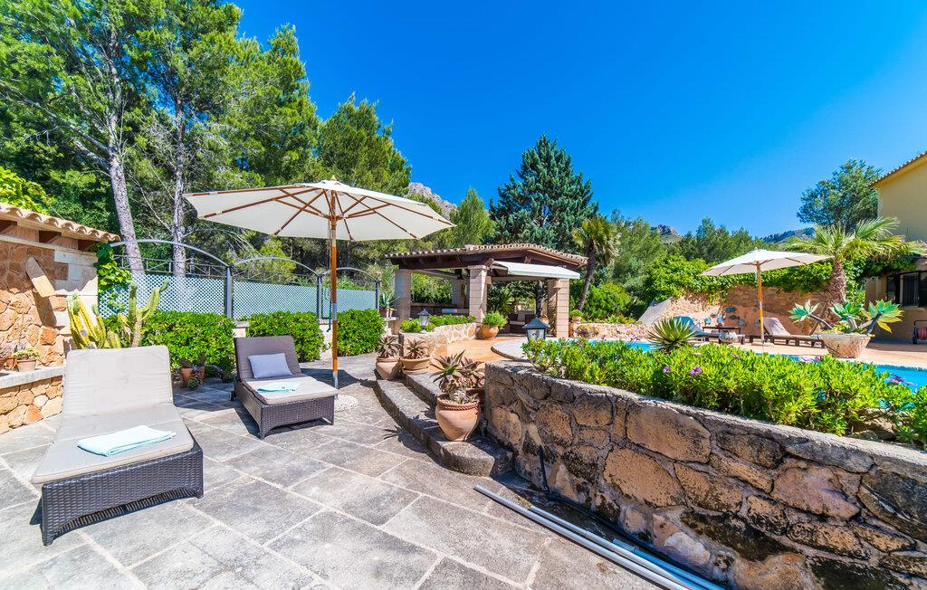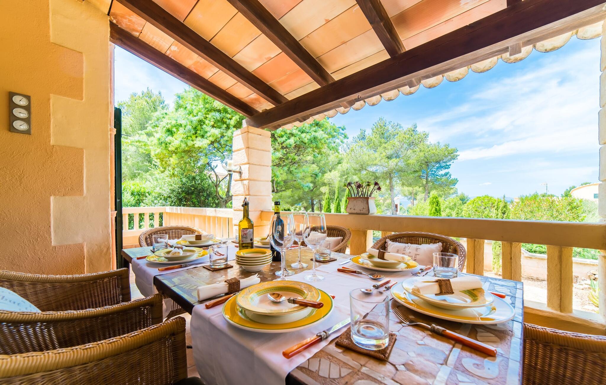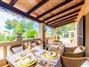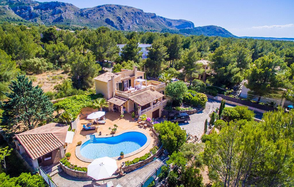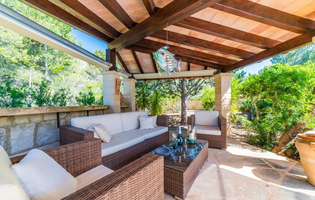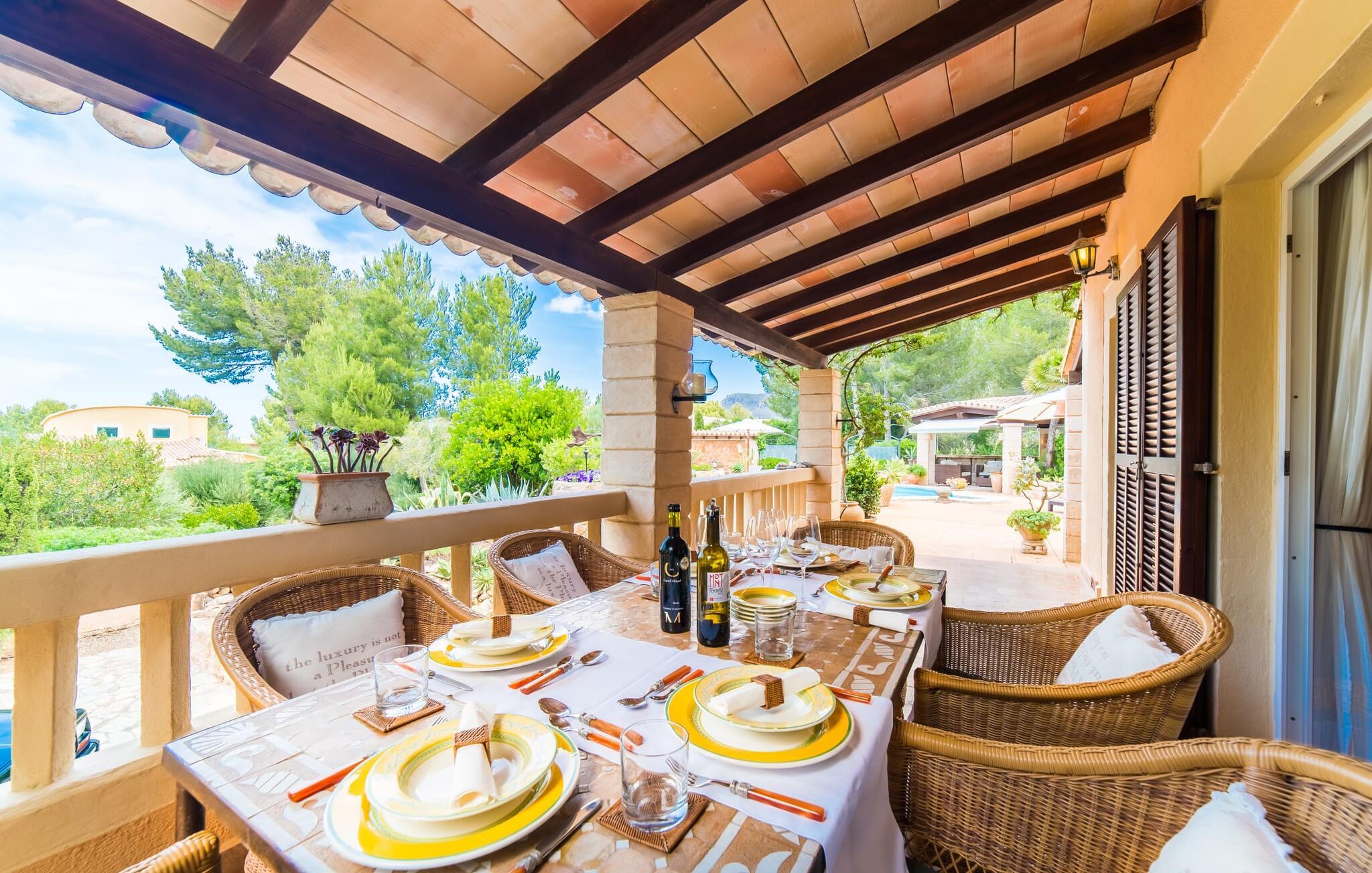 Fra det øjeblik I ankommer, vil I blive fortryllet af Villa Marimonts charme og elegance. Villaen i middelhavsstil er malerisk beliggende på en blid bakke med Tramuntana-bjergene i det fjerne, det intense, glitrende blå hav i forgrunden og Serra de Llevant-massivet midt i naturreservatet i baggrunden. I vil straks forelske jer i den maleriske, velholdte have og dens yndefuldt designede kroge og hjørner. Der er små overraskelser overalt. en hængekøje i skyggen her, et mosaikdekoreret bord der eller en murstensbænk. Træernes og planternes frodige grønne farve domineres af strålende lyseblå og hvide toner og den beroligende beige farve i naturstenene. Poolen, der ligger lige ved siden af huset, tilbyder absolut privatliv, og liggestole af høj kvalitet lægger op til at slappe af. Et poolhus med en lounge tilbyder et tilflugtssted fra sommersolen og kan takket være et udtrækkeligt beskyttelsesovertræk også bruges på regnfulde eller kølige dage. Med de stilfulde loungemøbler på den skyggefulde, overdækkede udendørsterrasse kan I tilbringe dejlige aftener med grill. Denne ejendoms sande appel ligger i dens alsidige udendørsområde, som er stemningsfuldt oplyst om aftenen. I sommermånederne kan I opholde jer udenfor til de sene morgentimer, for eksempel i den overdækkede spiseplads eller i den oplyste lounge i poolhuset. Gæsterne sætter også pris på det skyggefulde sted under pergolaen med en hængekøje.