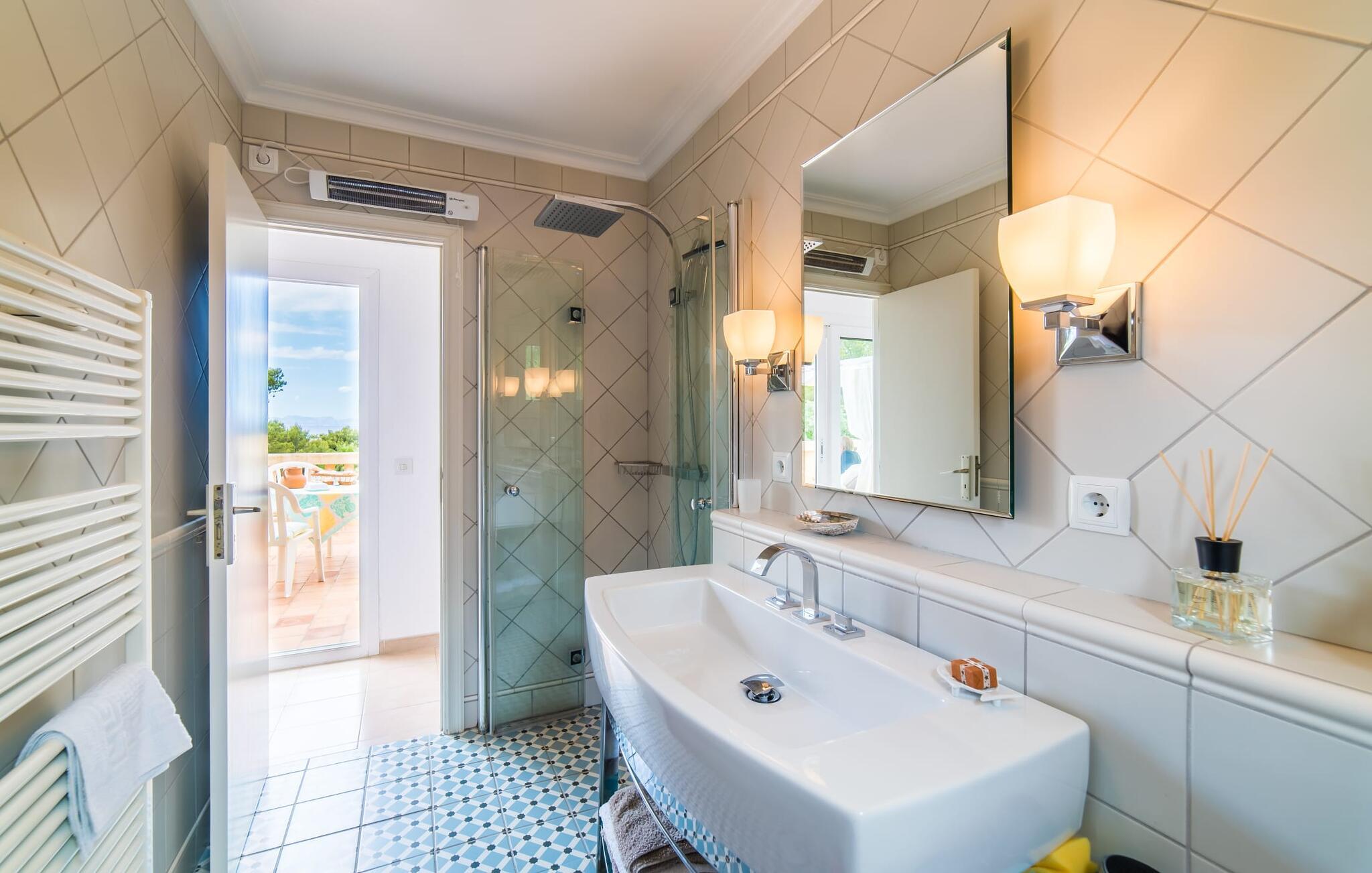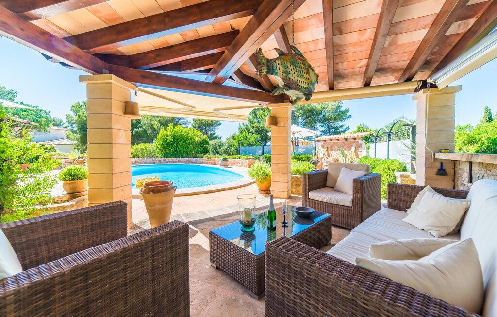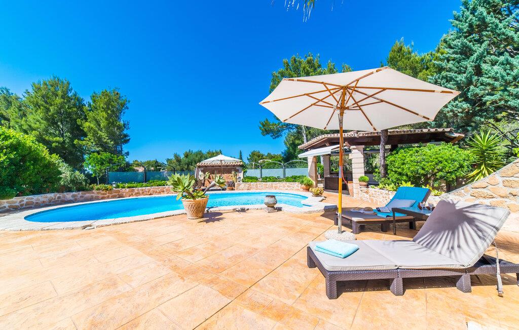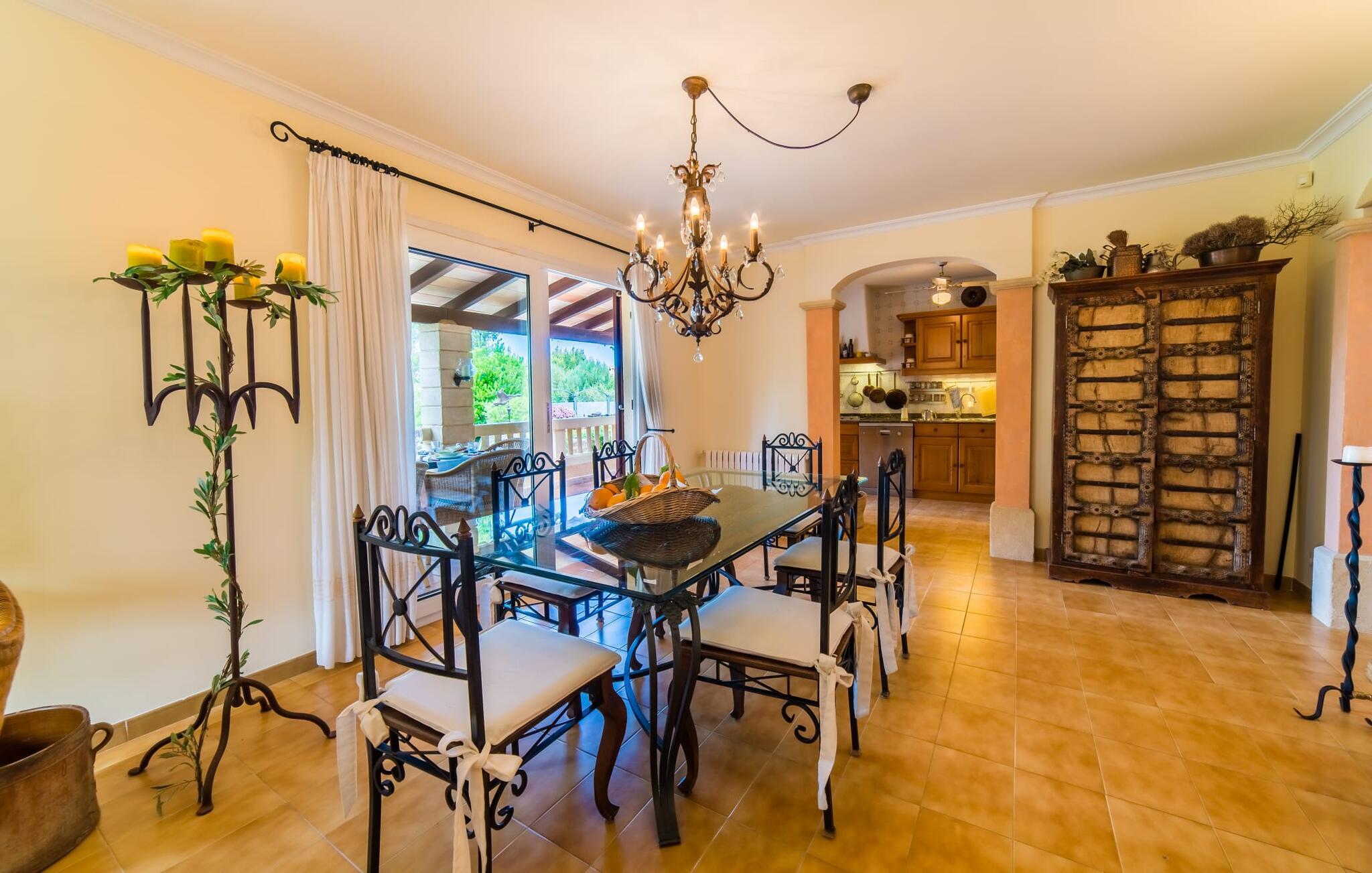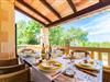 Fra det øjeblik I ankommer, vil I blive fortryllet af Villa Marimonts charme og elegance. Villaen i middelhavsstil er malerisk beliggende på en blid bakke med Tramuntana-bjergene i det fjerne, det intense, glitrende blå hav i forgrunden og Serra de Llevant-massivet midt i naturreservatet i baggrunden. I vil straks forelske jer i den maleriske, velholdte have og dens yndefuldt designede kroge og hjørner. Der er små overraskelser overalt. en hængekøje i skyggen her, et mosaikdekoreret bord der eller en murstensbænk. Træernes og planternes frodige grønne farve domineres af strålende lyseblå og hvide toner og den beroligende beige farve i naturstenene. Poolen, der ligger lige ved siden af huset, tilbyder absolut privatliv, og liggestole af høj kvalitet lægger op til at slappe af. Et poolhus med en lounge tilbyder et tilflugtssted fra sommersolen og kan takket være et udtrækkeligt beskyttelsesovertræk også bruges på regnfulde eller kølige dage. Med de stilfulde loungemøbler på den skyggefulde, overdækkede udendørsterrasse kan I tilbringe dejlige aftener med grill. Denne ejendoms sande appel ligger i dens alsidige udendørsområde, som er stemningsfuldt oplyst om aftenen. I sommermånederne kan I opholde jer udenfor til de sene morgentimer, for eksempel i den overdækkede spiseplads eller i den oplyste lounge i poolhuset. Gæsterne sætter også pris på det skyggefulde sted under pergolaen med en hængekøje.