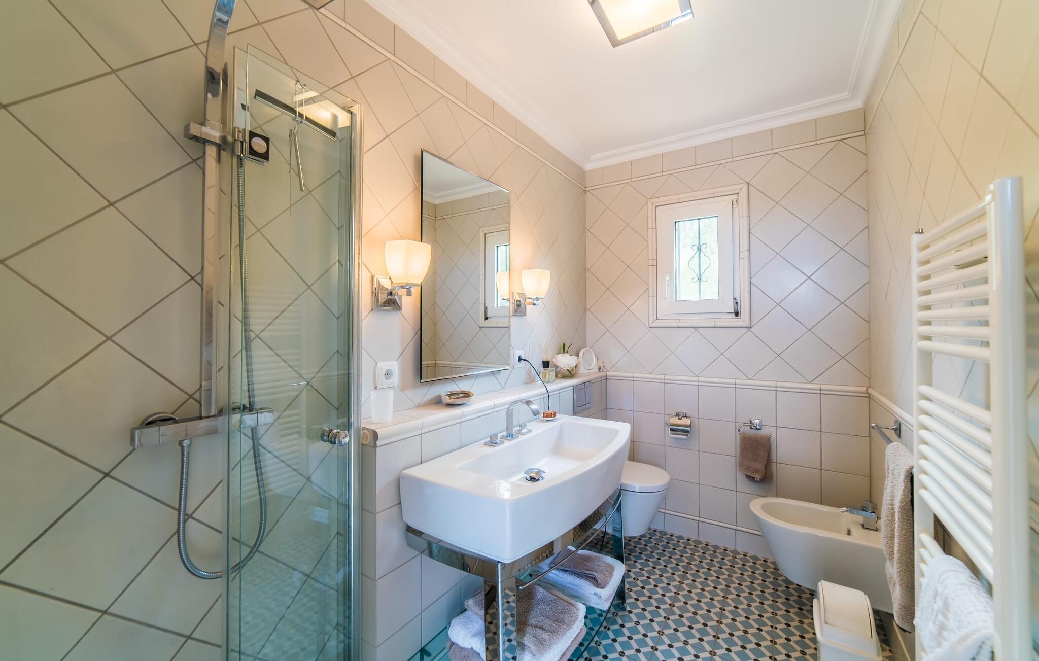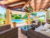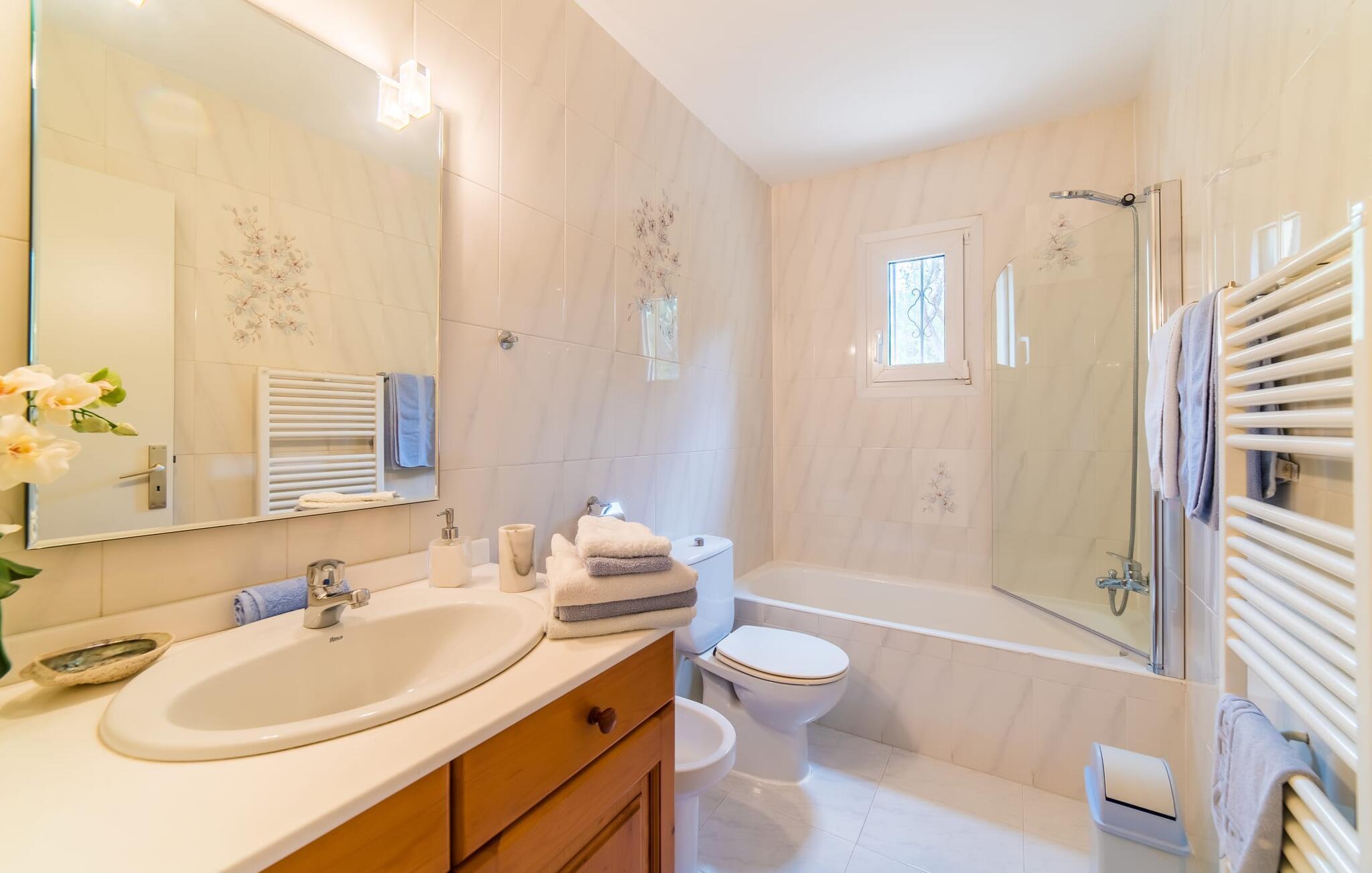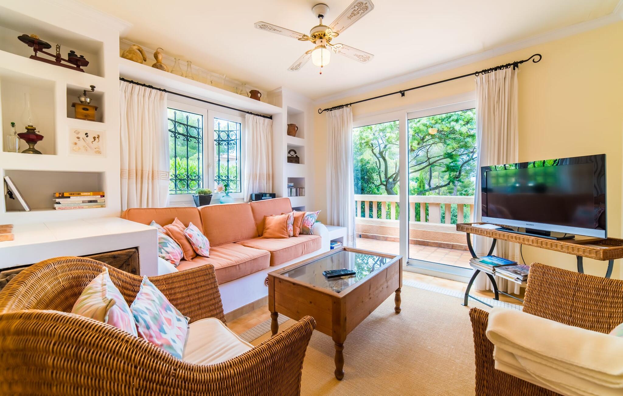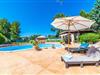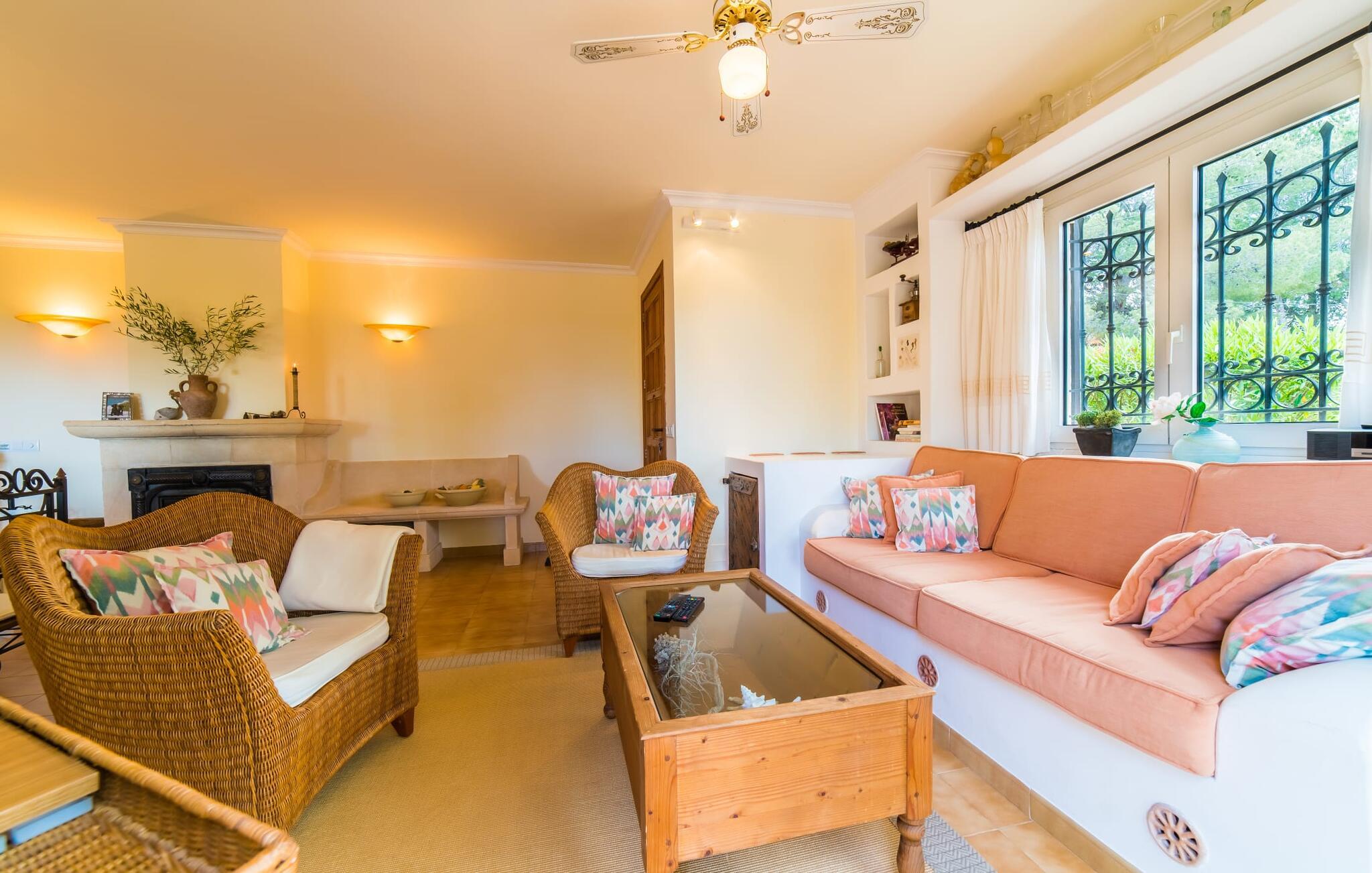 Fra det øjeblik I ankommer, vil I blive fortryllet af Villa Marimonts charme og elegance. Villaen i middelhavsstil er malerisk beliggende på en blid bakke med Tramuntana-bjergene i det fjerne, det intense, glitrende blå hav i forgrunden og Serra de Llevant-massivet midt i naturreservatet i baggrunden. I vil straks forelske jer i den maleriske, velholdte have og dens yndefuldt designede kroge og hjørner. Der er små overraskelser overalt. en hængekøje i skyggen her, et mosaikdekoreret bord der eller en murstensbænk. Træernes og planternes frodige grønne farve domineres af strålende lyseblå og hvide toner og den beroligende beige farve i naturstenene. Poolen, der ligger lige ved siden af huset, tilbyder absolut privatliv, og liggestole af høj kvalitet lægger op til at slappe af. Et poolhus med en lounge tilbyder et tilflugtssted fra sommersolen og kan takket være et udtrækkeligt beskyttelsesovertræk også bruges på regnfulde eller kølige dage. Med de stilfulde loungemøbler på den skyggefulde, overdækkede udendørsterrasse kan I tilbringe dejlige aftener med grill. Denne ejendoms sande appel ligger i dens alsidige udendørsområde, som er stemningsfuldt oplyst om aftenen. I sommermånederne kan I opholde jer udenfor til de sene morgentimer, for eksempel i den overdækkede spiseplads eller i den oplyste lounge i poolhuset. Gæsterne sætter også pris på det skyggefulde sted under pergolaen med en hængekøje.