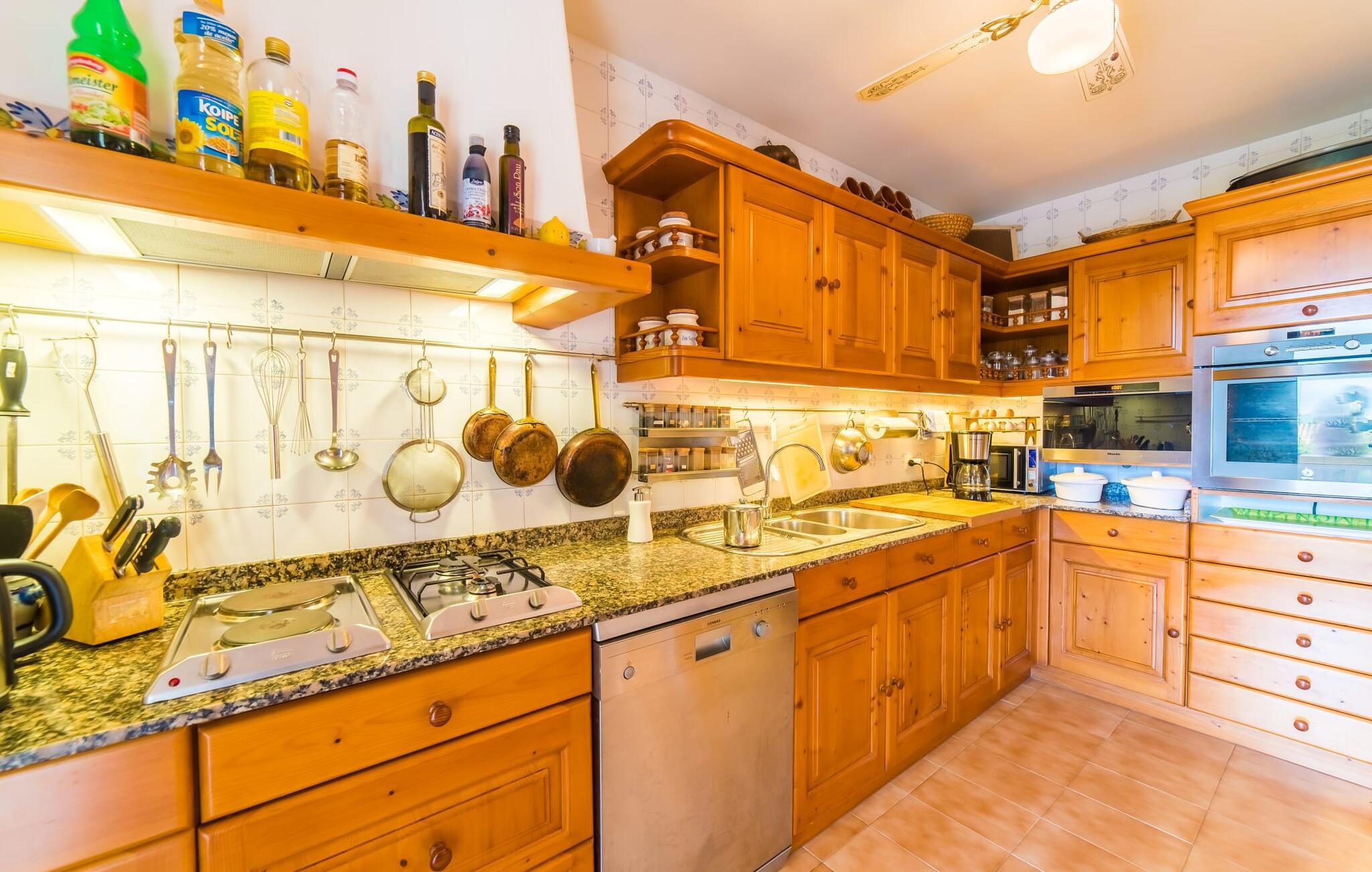 Villa Marimont er flot og meget smagfuldt indrettet og udstråler et indtryk af at være velholdt. Indgangen i stueetagen fører direkte ind i den lyse, varme og hyggelige stue. Der er selvfølgelig et fladskærms-tv med satellitforbindelse. Den åbne, direkte forbundet spiseplads med udsigt over terrassen er møbleret med et glasbord og har komfortabel plads til seks personer. Et andet stort bord på den overdækkede terrasse er også ideelt til at tilbringe kvalitetstid med familie og venner. Ved siden af spisestuen er der et fuldt udstyret køkken i middelhavsstil. Denne etage huser også de to lyse og komfortable dobbeltværelser og et badeværelse med bruser/badekar-kombination, toilet og bidet. En mosaikbeklædt trappe fører op til øverste etage, hvor I finder endnu et dobbeltværelse med udsigt over tagterrassen og havet, samt et dobbeltværelse med adgang til tagterrassen og et andet, moderne badeværelse med bruser, toilet og bidet. Rummelige garderobeskabe i hvert værelse tilbyder masser af opbevaringsplads til jeres bagage. En stor tagterrasse tilbyder en storslået udsigt over området. To komfortable lænestole lægger op til at solbade og nyde de spektakulære solnedgange eller den klare stjernehimmel.