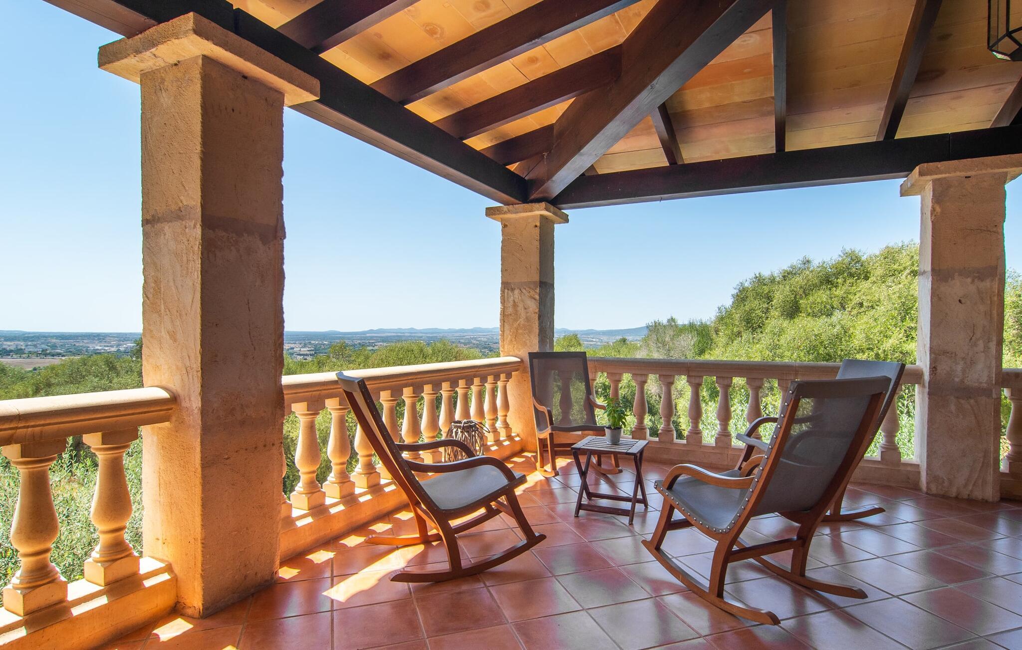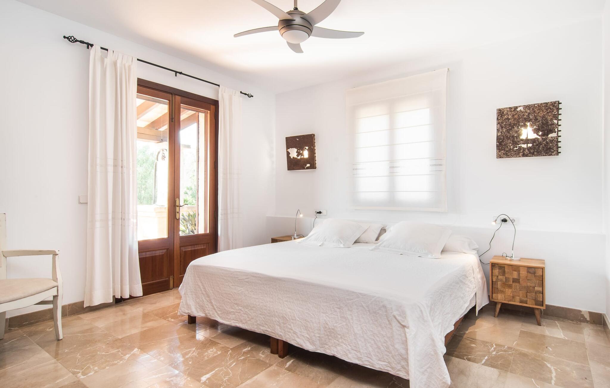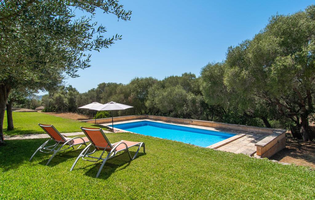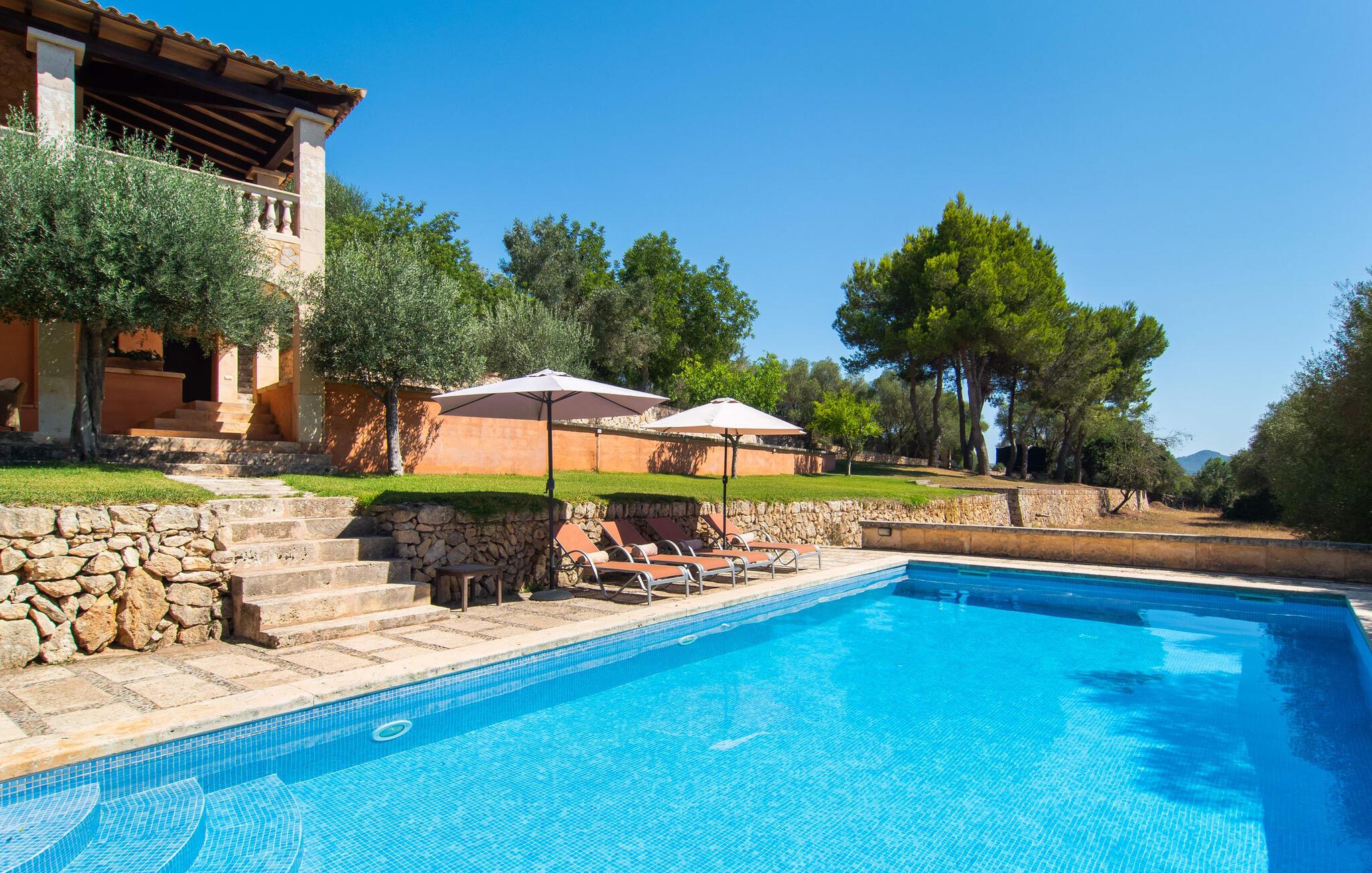 Villa "Marti" har en enestående beliggenhed nord for Manacor og tilbyder en betagende udsigt over det omkringliggende landskab og fjerne bakker. Beliggende i en smukt vedligeholdt ejendom, udstråler ejendommen en følelse af ro med grønne græsplæner, terrasseområder og middelhavsbuskads. Det charmerende landskab med små mure, nicher og stier inviterer jer til at finde et yndet sted at blive hængende. Den imponerende mosaikbelagte pool med komfortabel indgang er omgivet af en solterrasse, perfekt til solbadning. Havens træer giver naturlig skygge, mens den store terrasse tilbyder en vidunderlig plads til udendørs spisning eller en grill, perfekt til at nyde de friske råvarer fra det nærliggende marked i Manacor. Inde i villaen er en oase af komfort. Klassiske synlige bjælkelofter og smagfuld indretning skaber en hjemlig og indbydende atmosfære. Det rummelige opholds- og spiseområde inviterer jer til at slappe af med en behagelig sofa og en pejs til køligere aftener. Det fuldt udstyrede køkken sikrer bekvem spisning, mens de lyse og luftige soveværelser giver et roligt tilflugtssted for afslappende nætter. Der er en seng, der måler 1,50 x 2,00 m og to, der måler 1,80 x 2,00 m til rådighed. Badeværelserne imponerer med et moderne udtryk og indretning af høj kvalitet. Den fortryllende smukke finca "Marti" ligger på en fredet ejendom, kun 3 km nord for Manacor. Det tilbyder kræsne gæster det højeste niveau af komfort, både inde og ude. Manacor har en god infrastruktur. De smukke strande på østkysten kan nås på cirka 20 minutter i bil. Rejsen i bil til Palma de Mallorca Lufthavn tager cirka 45 minutter.