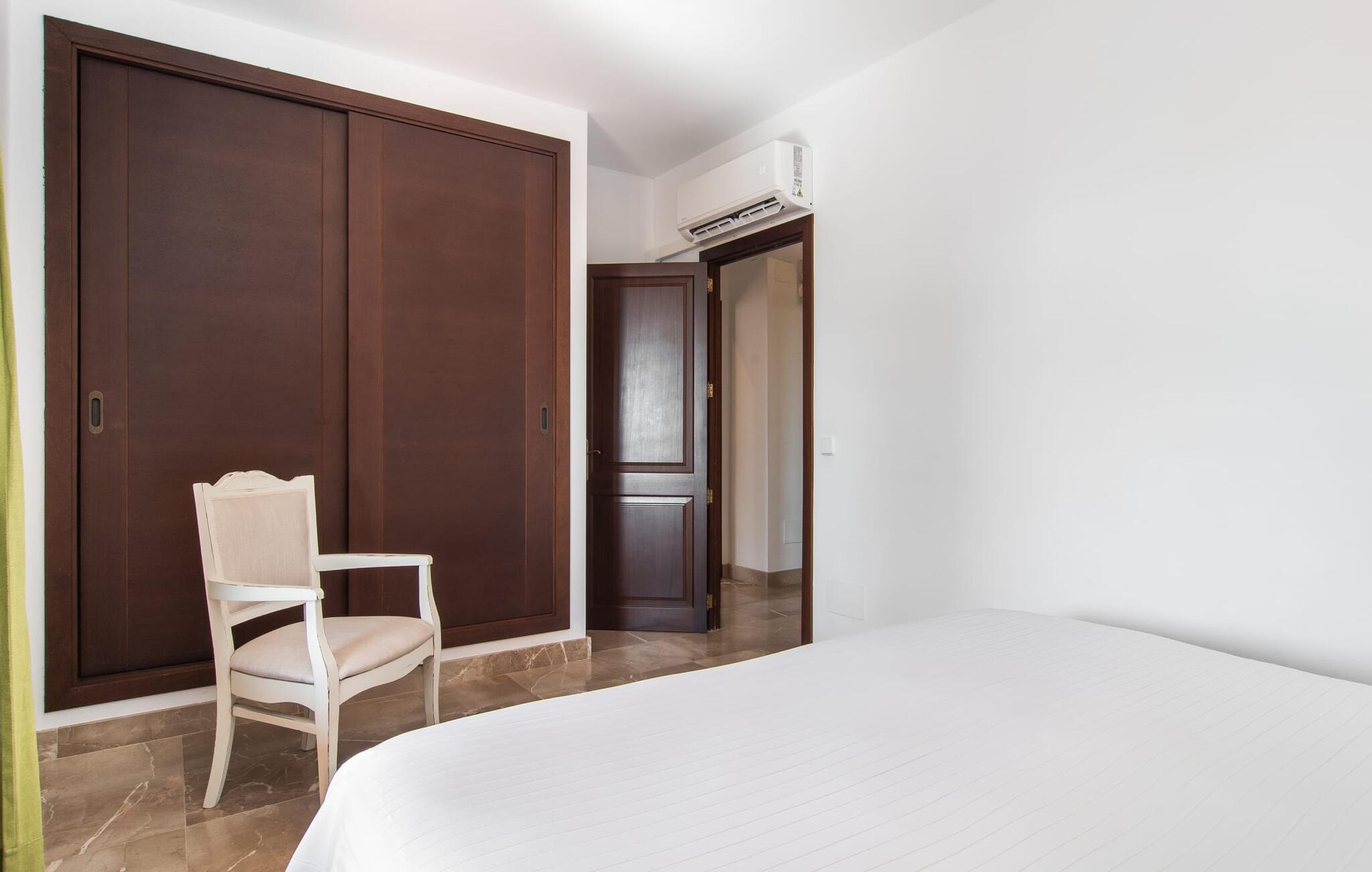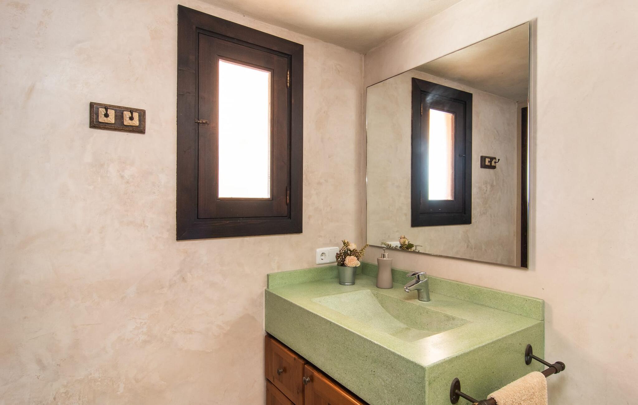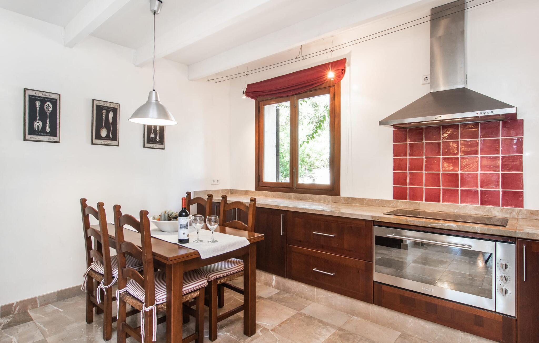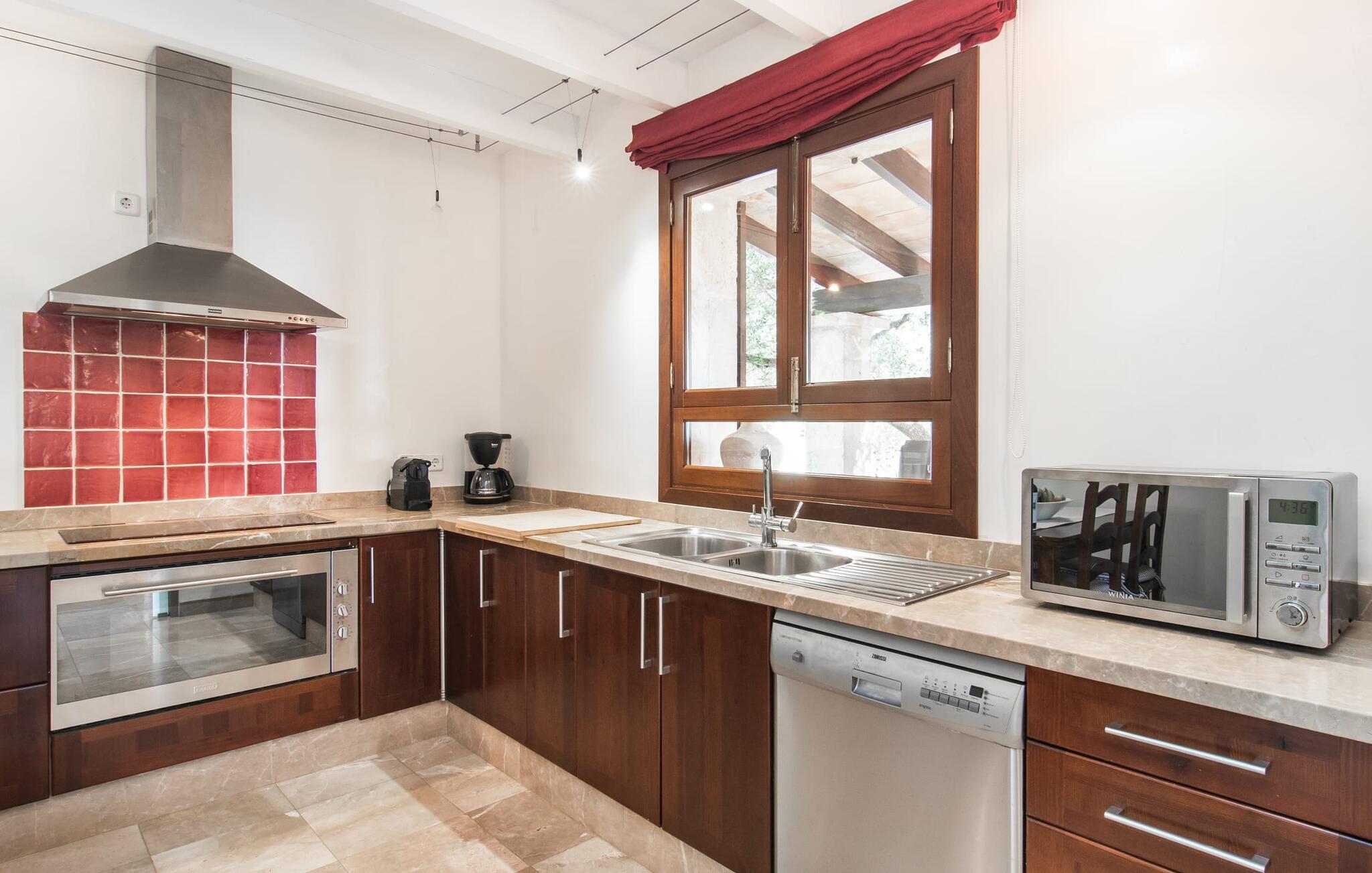Villa "Marti" har en enestående beliggenhed nord for Manacor og tilbyder en betagende udsigt over det omkringliggende landskab og fjerne bakker. Beliggende i en smukt vedligeholdt ejendom, udstråler ejendommen en følelse af ro med grønne græsplæner, terrasseområder og middelhavsbuskads. Det charmerende landskab med små mure, nicher og stier inviterer jer til at finde et yndet sted at blive hængende. Den imponerende mosaikbelagte pool med komfortabel indgang er omgivet af en solterrasse, perfekt til solbadning. Havens træer giver naturlig skygge, mens den store terrasse tilbyder en vidunderlig plads til udendørs spisning eller en grill, perfekt til at nyde de friske råvarer fra det nærliggende marked i Manacor. Inde i villaen er en oase af komfort. Klassiske synlige bjælkelofter og smagfuld indretning skaber en hjemlig og indbydende atmosfære. Det rummelige opholds- og spiseområde inviterer jer til at slappe af med en behagelig sofa og en pejs til køligere aftener. Det fuldt udstyrede køkken sikrer bekvem spisning, mens de lyse og luftige soveværelser giver et roligt tilflugtssted for afslappende nætter. Der er en seng, der måler 1,50 x 2,00 m og to, der måler 1,80 x 2,00 m til rådighed. Badeværelserne imponerer med et moderne udtryk og indretning af høj kvalitet. Den fortryllende smukke finca "Marti" ligger på en fredet ejendom, kun 3 km nord for Manacor. Det tilbyder kræsne gæster det højeste niveau af komfort, både inde og ude. Manacor har en god infrastruktur. De smukke strande på østkysten kan nås på cirka 20 minutter i bil. Rejsen i bil til Palma de Mallorca Lufthavn tager cirka 45 minutter.