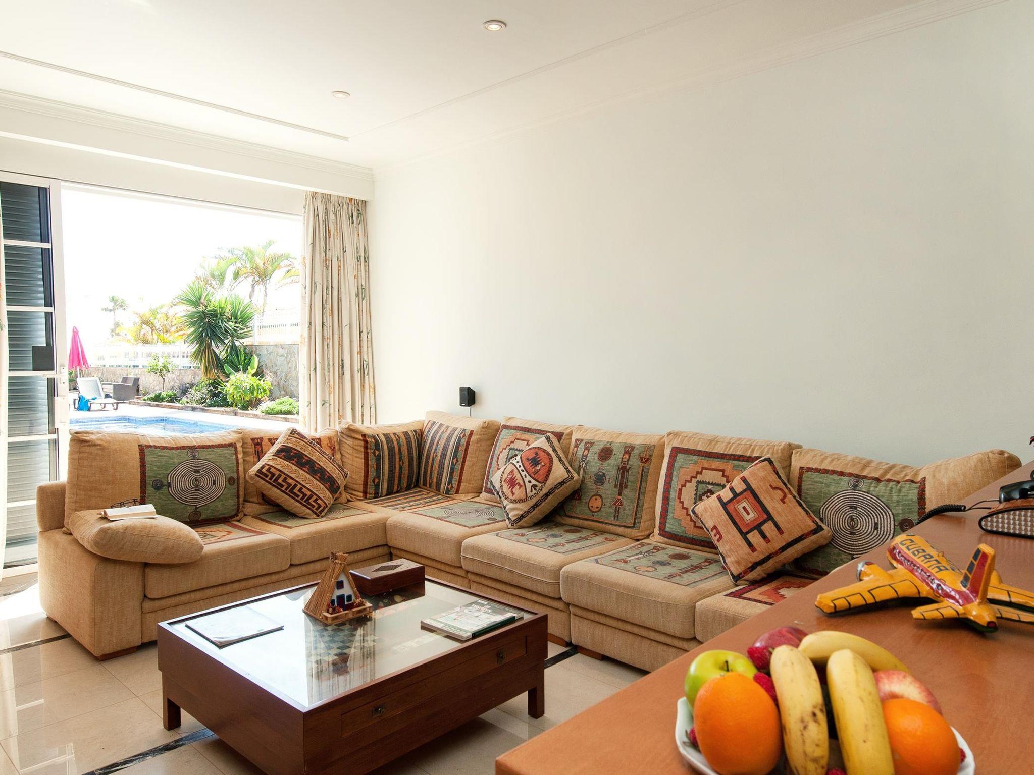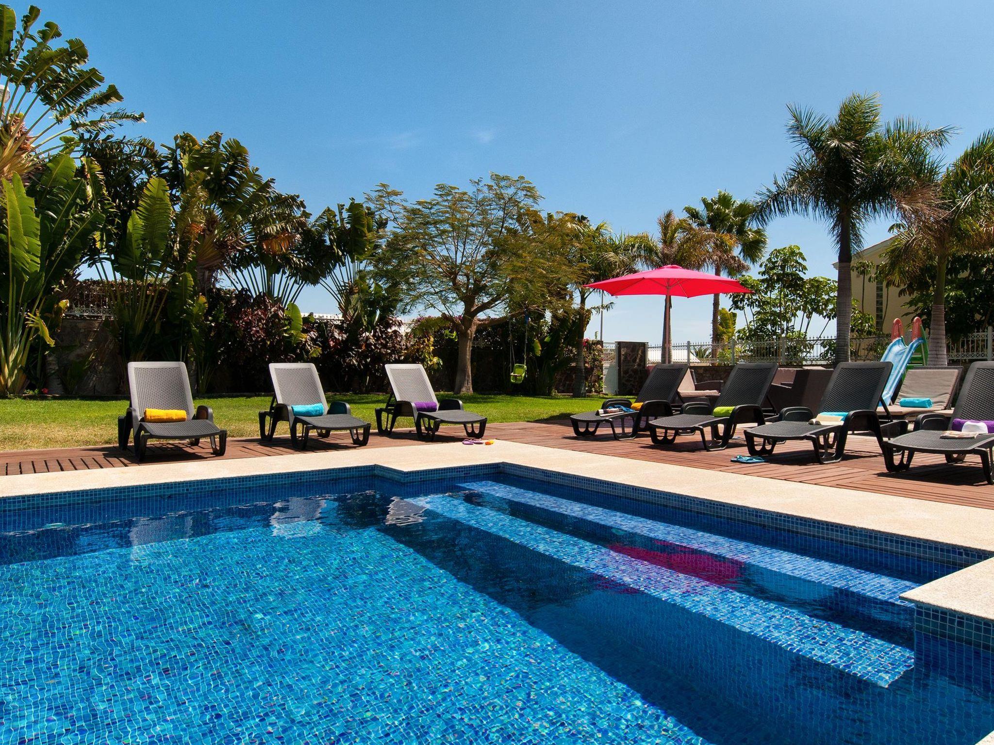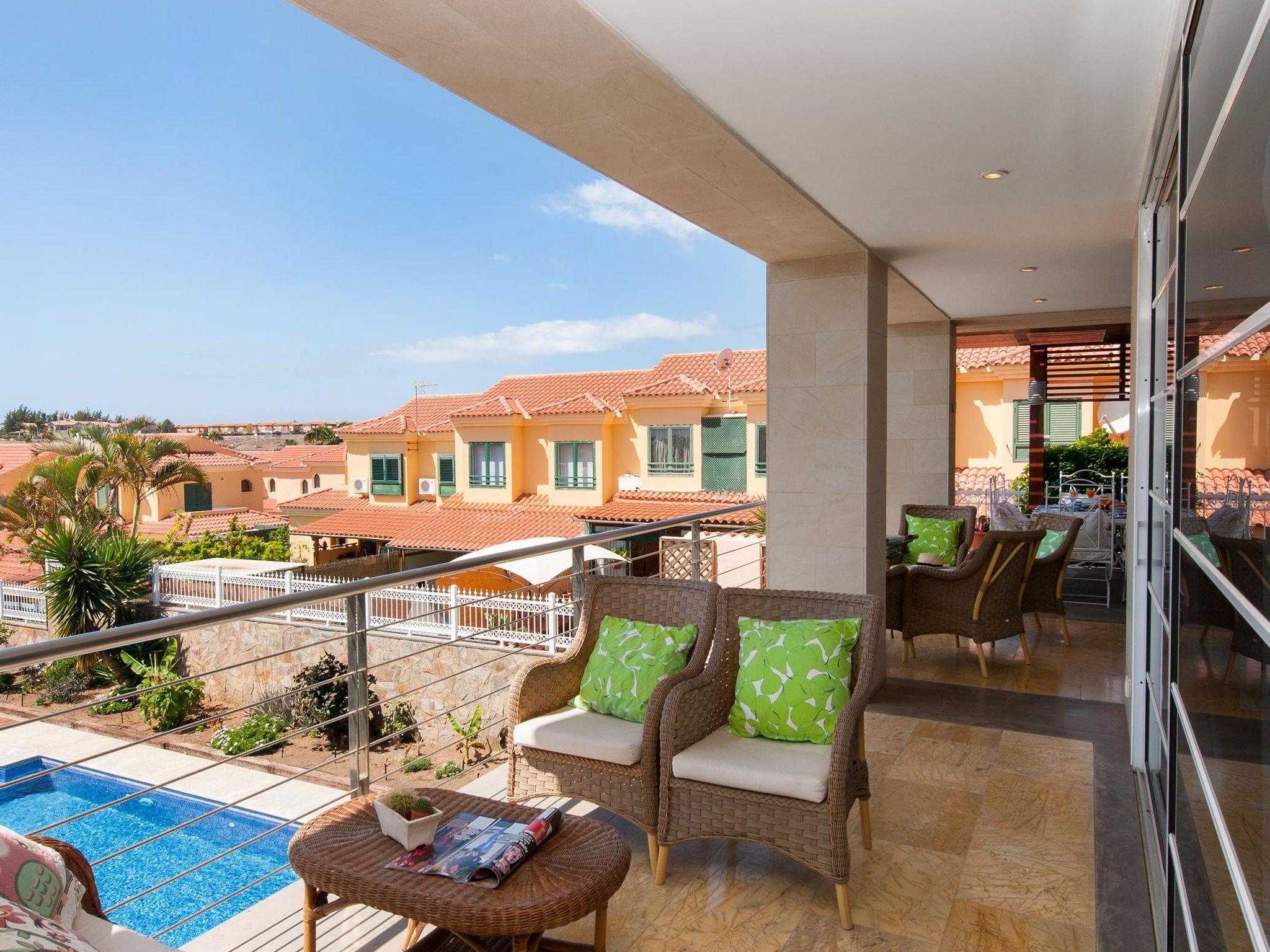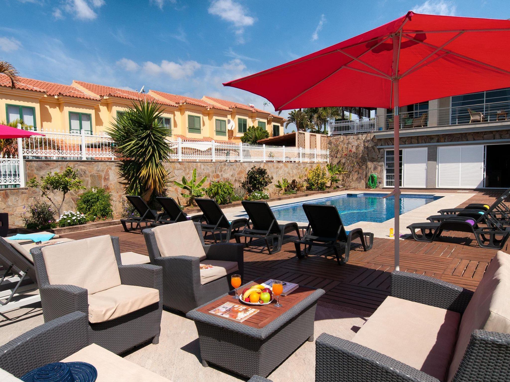 Large, comfortable single-family house. On the outskirts Maspalomas, in a quiet position. Private: garden (fenced) with lawn, swimming pool angular (11 x 5 m, depth 160 - 140 cm, seasonal availability: 01.Jan. - 31.Dec.). Outdoor shower, patio, garden furniture, barbecue. In the house: billiard table. Single garage, public parking on the road. Bus stop "Vistamar" 30 m. The owner does not accept any youth groups. Neighbourhood highly sensitive to noise. Quietness and good behaviour expected.