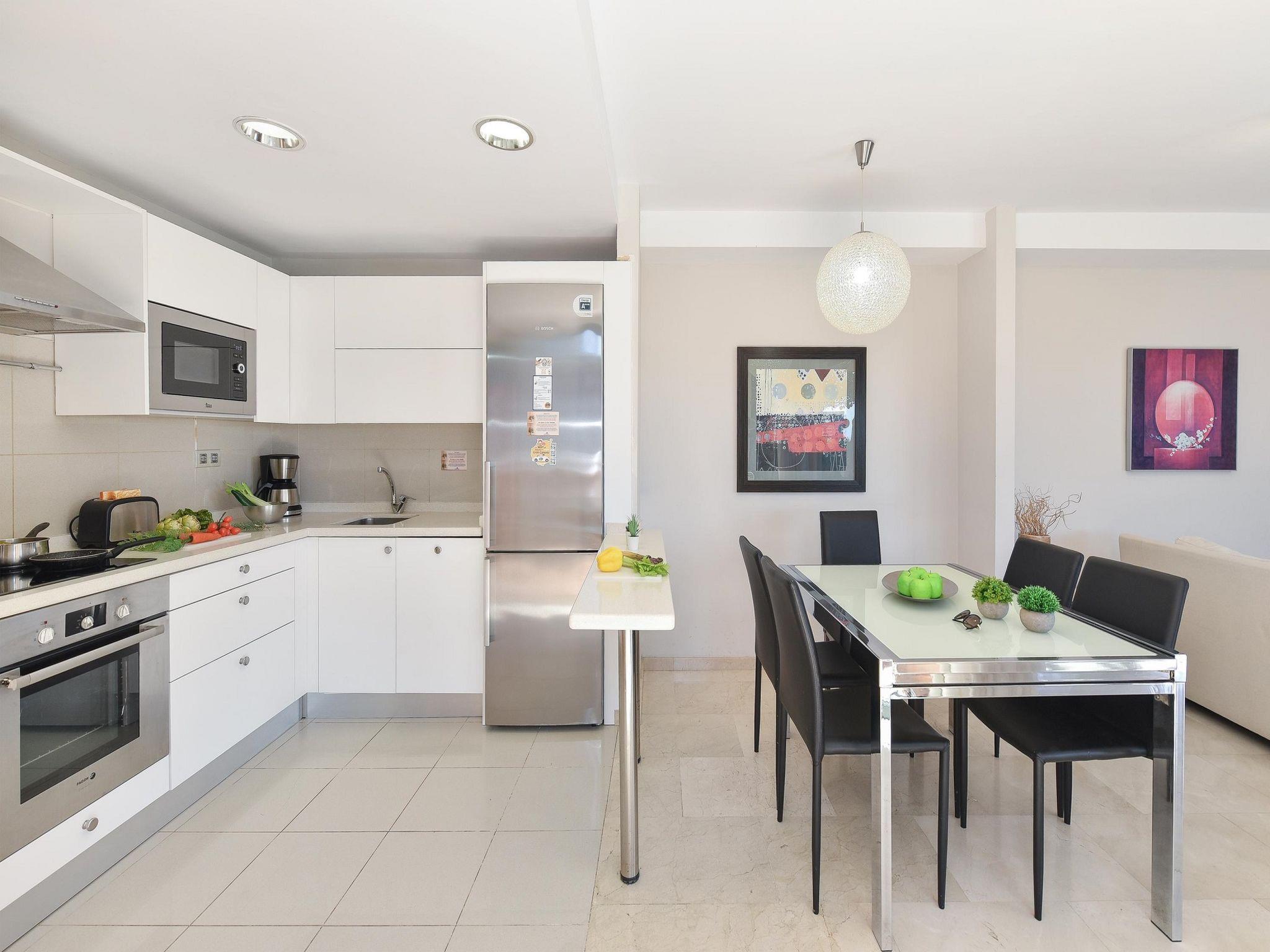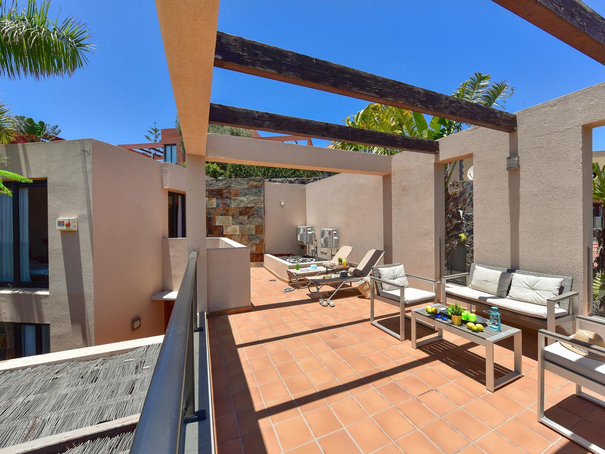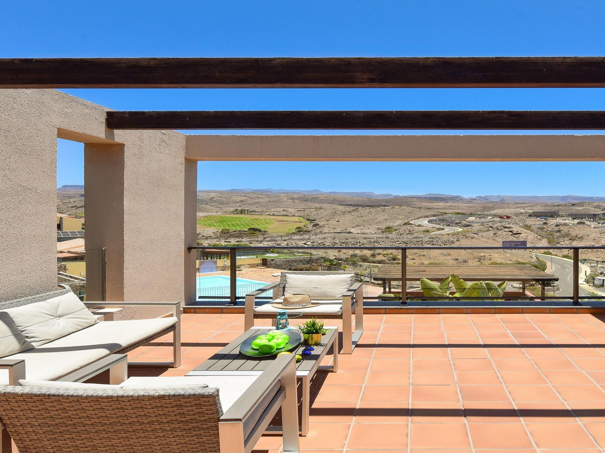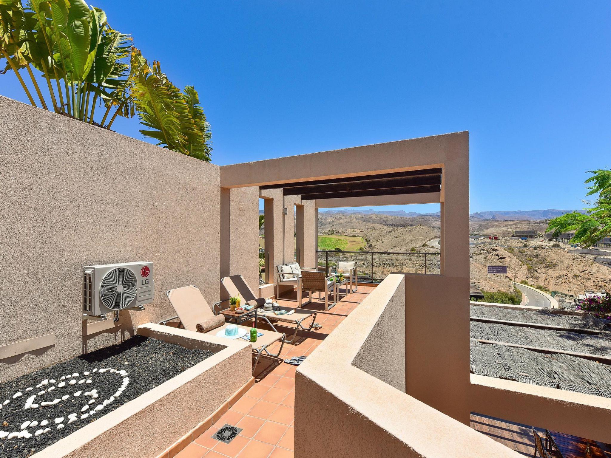"Salobre Golf Resort", 3-room house 105 m2 on 2 levels. Comfortable and modern furnishings: living room with satellite TV, digital TV, hi-fi system, DVD and air conditioning. Exit to the garden. 1 room with 1 french bed, shower/WC and fan. Open kitchen (oven, dishwasher, 4 ceramic glass hob hotplates, toaster, kettle, microwave, freezer, electric coffee machine) with dining table and dining nook. Upper floor: 1 room with 2 beds, bath/WC and air conditioning. Exit to the terrace. Patio. Terrace furniture, barbecue, deck chairs. View of the mountains, the garden and the countryside. Facilities: washing machine, iron, children's high chair, baby cot for up to 2 year olds, hair dryer. Internet (WiFi, free). Parking (1 car). Please note: non-smoking house. Maximum 1 pet/ dog allowed. 2019/4035 // Reg. Nr.: ESFCTU0000350120003181800000000000000000VV35100040742