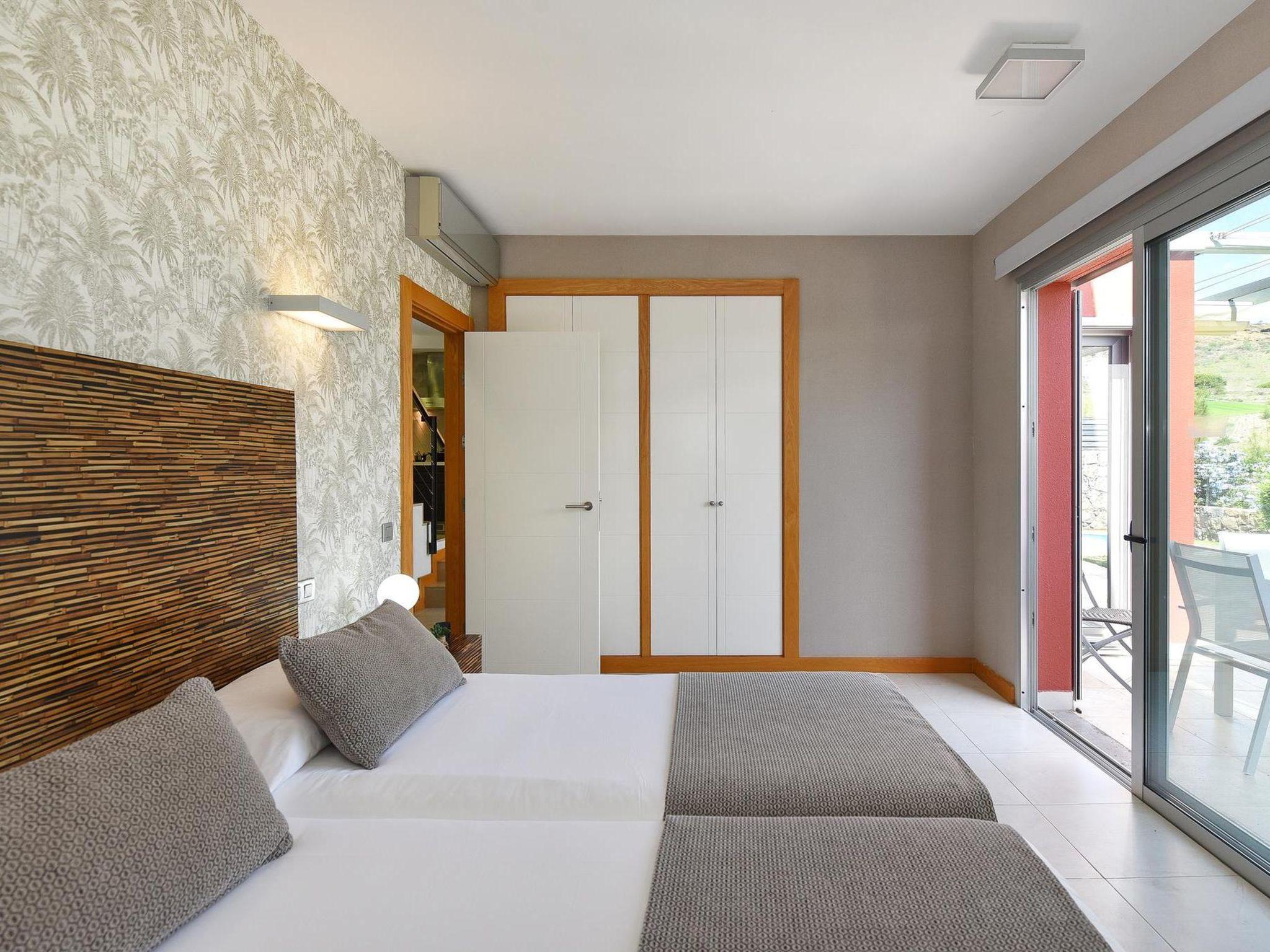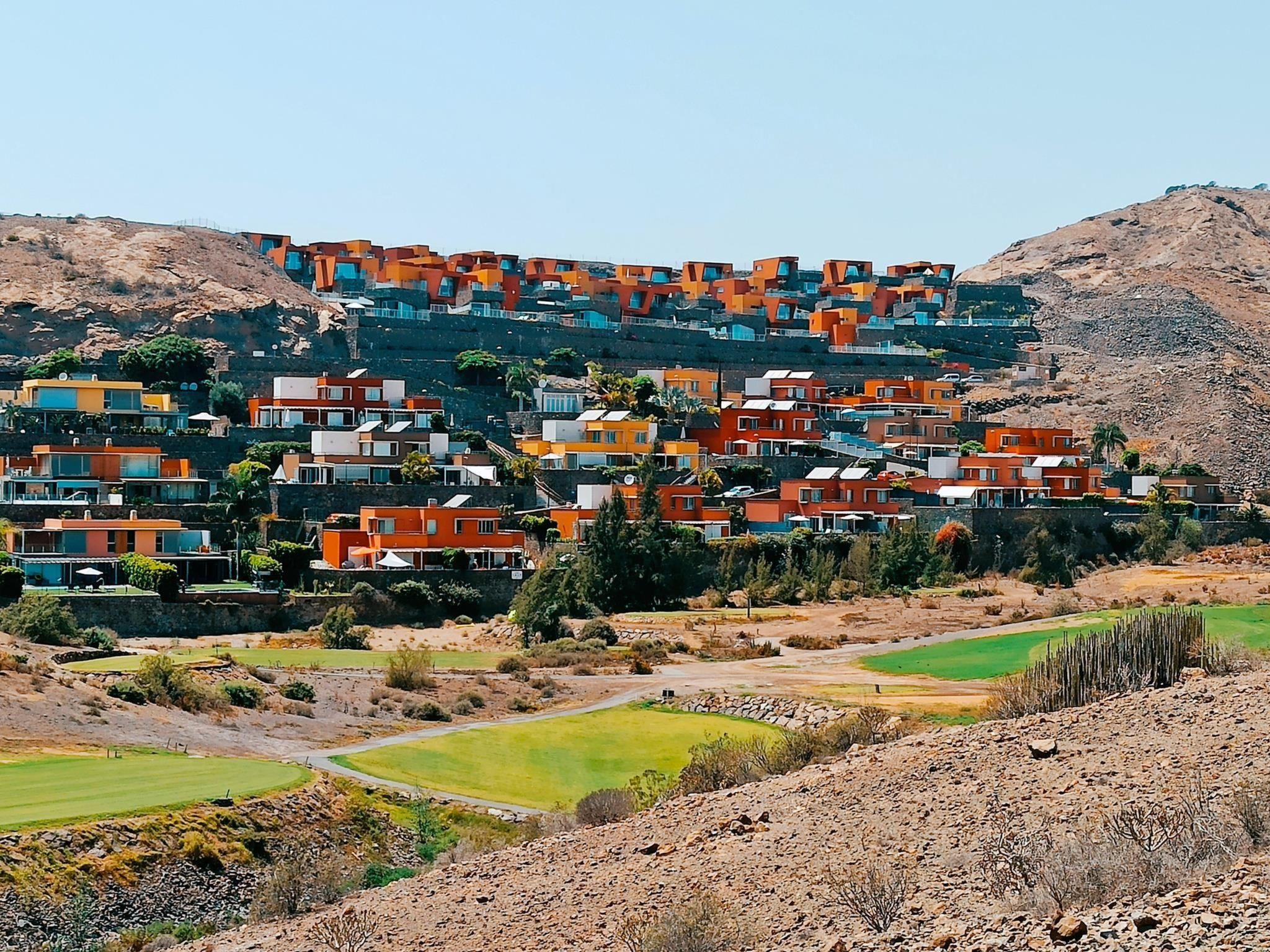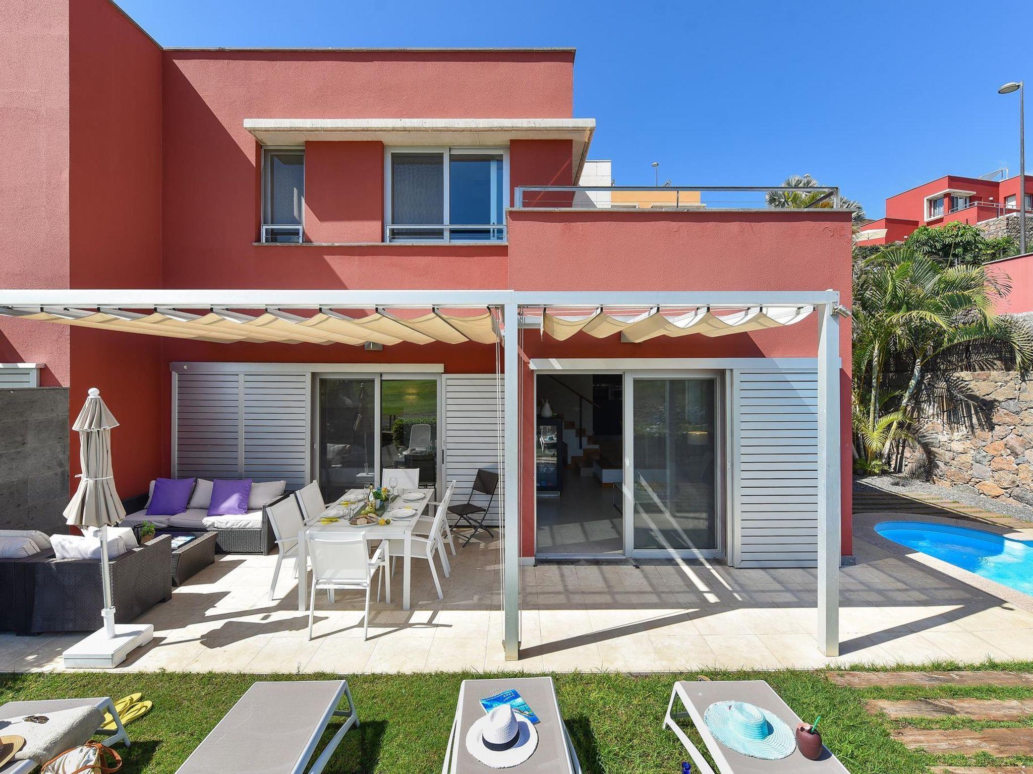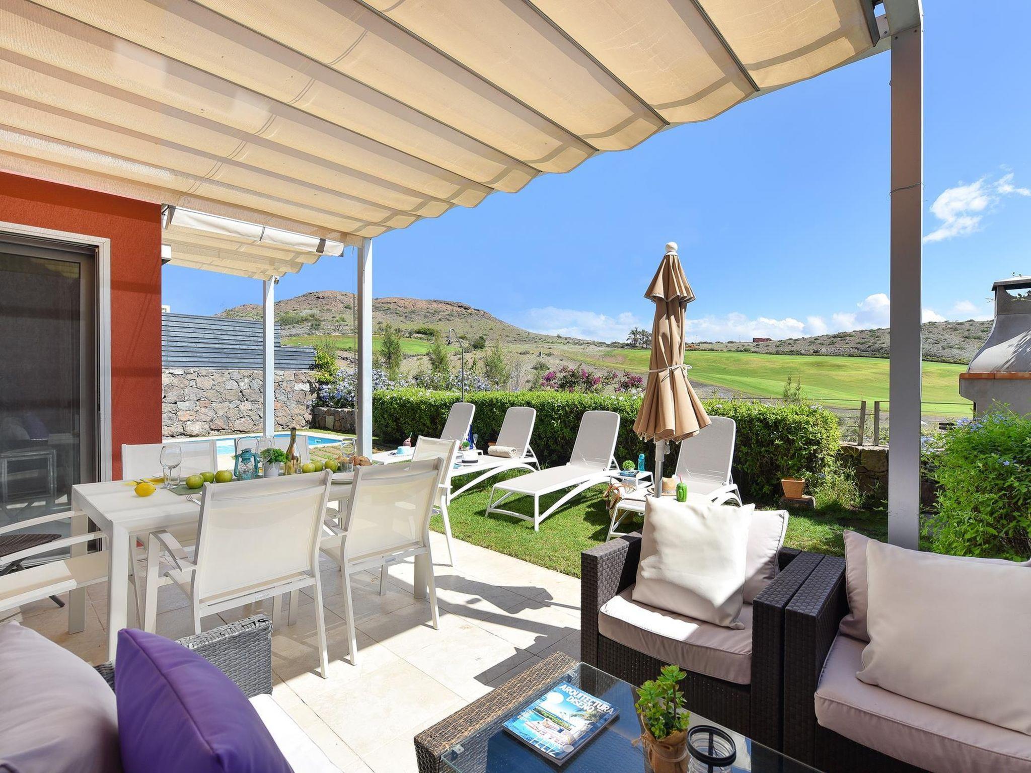 Modern, beautiful villa "Vista Golf 22". In the centre of Salobre Golf, outside the resort Maspalomas, in a secluded, quiet, sunny position on top of a hill. Private: garden (fenced) with lawn, swimming pool angular (5 x 2 m, seasonal availability: 01.Jan. - 31.Dec.). Outdoor shower. In the house: sun terrace. Parking on the premises, public parking on the road. Bus stop "Las Crucitas" 19 km. The owner does not accept any youth groups. Neighbourhood highly sensitive to noise. Quietness and good behaviour expected.