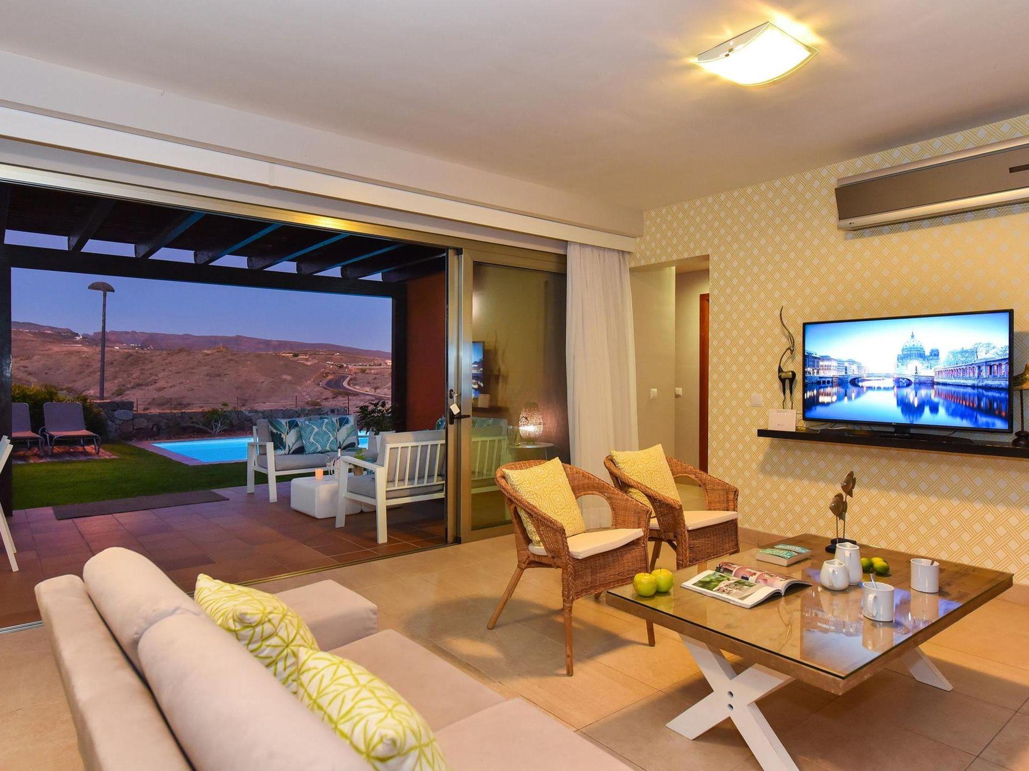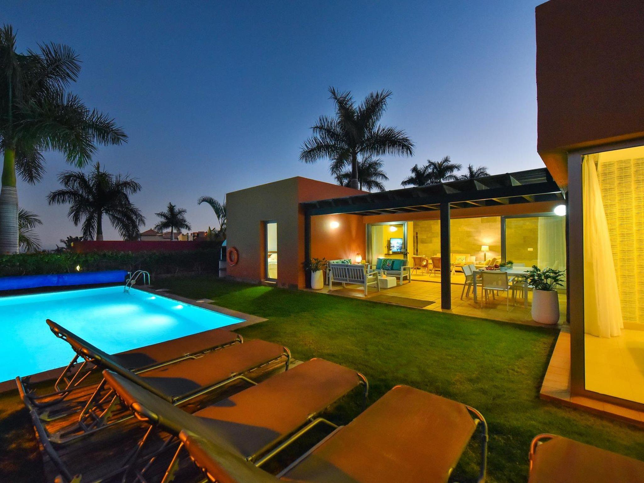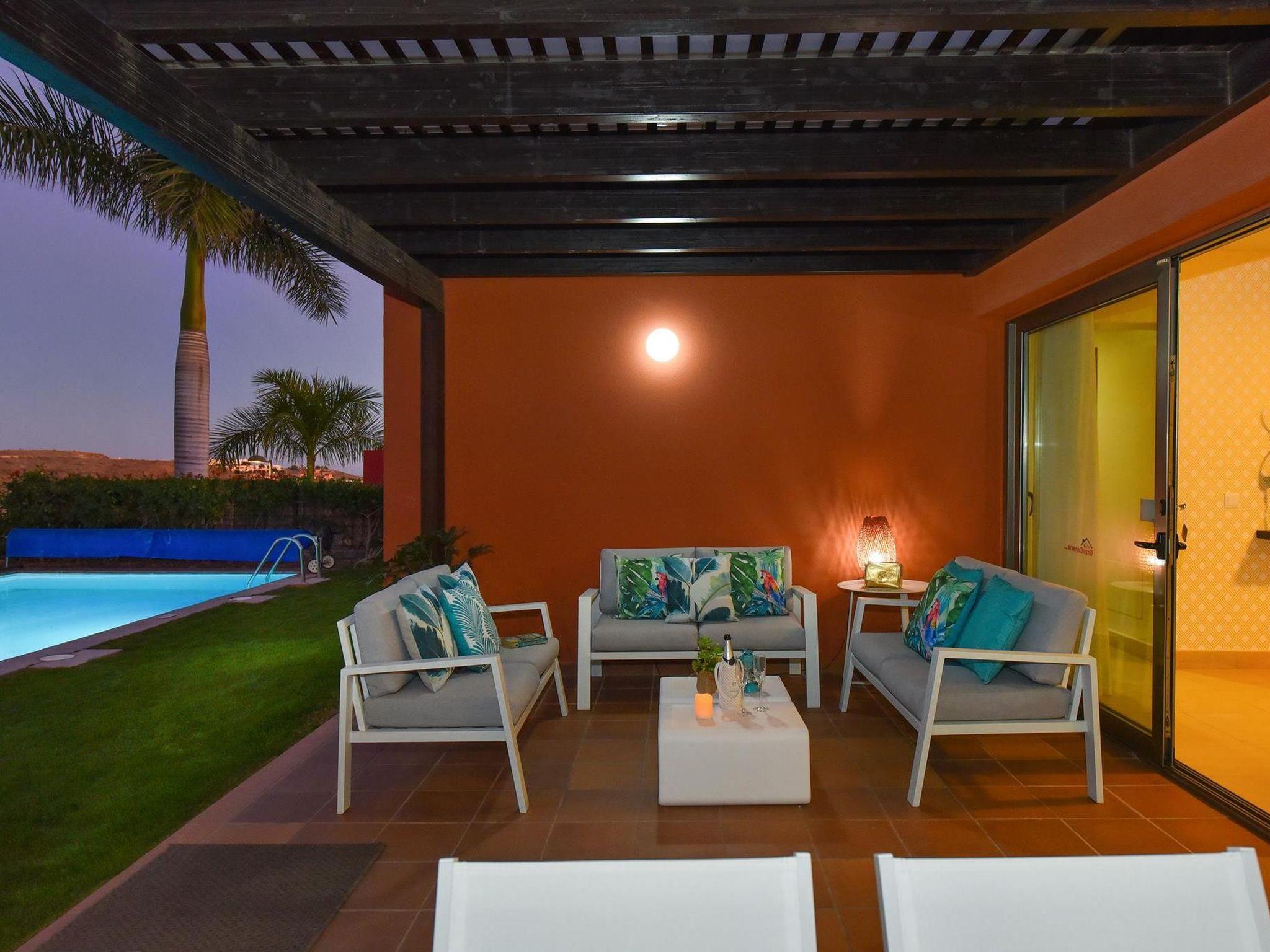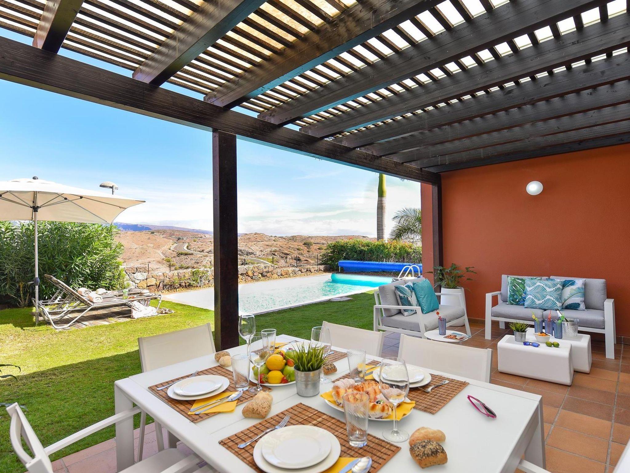 Modern, comfortable villa "Par4 Villa 21". In the centre of Salobre Golf Resort, on the outskirts Maspalomas 5 km, outside the resort Meloneras 7 km, in a quiet, sunny, elevated position in the residential district. Private: garden 80 m2 (fenced), lawn for sunbathing, swimming pool angular (8 x 4 m, depth 140 - 140 cm, seasonal availability: 01.Jan. - 31.Dec.). Barbecue, parking on the premises, public parking on the road. Shop 4 km, supermarket 3 km, restaurant 200 m, bus stop "Las Crucitas" 19 km, sandy beach 3 km. Golf course (18 hole) 500 m. Please note: car recommended. The owner does not accept any youth groups. Airfield 25 km from the property. Neighbourhood highly sensitive to noise. Quietness and good behaviour expected.