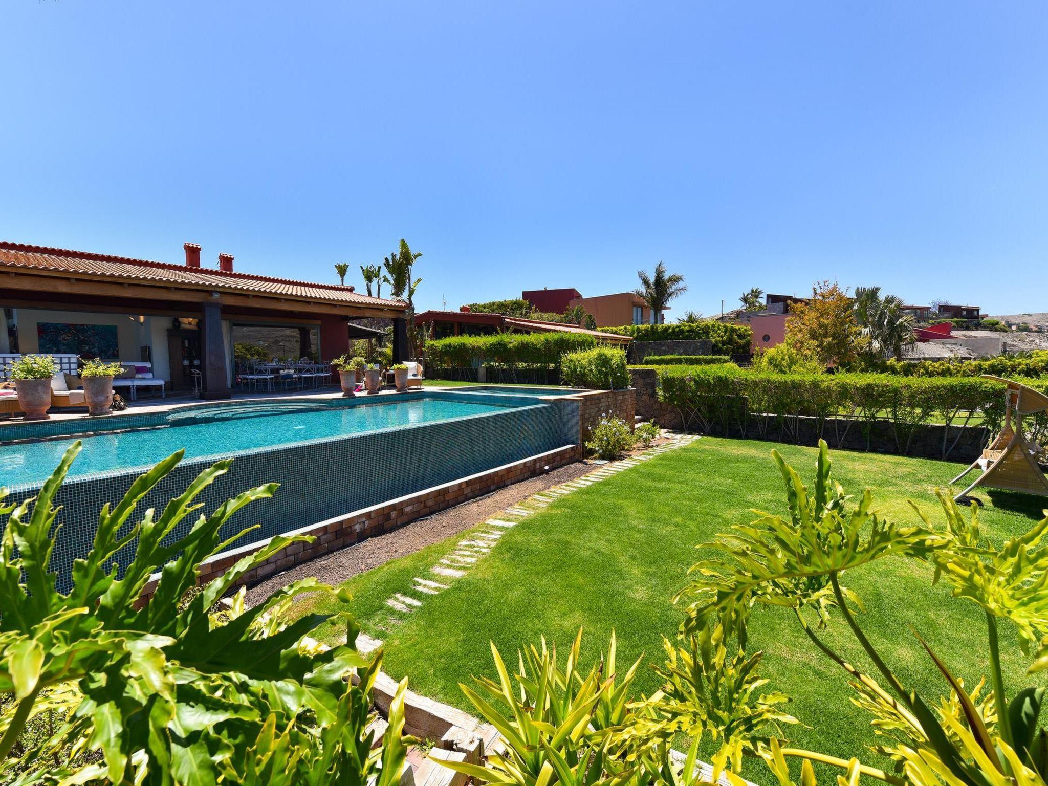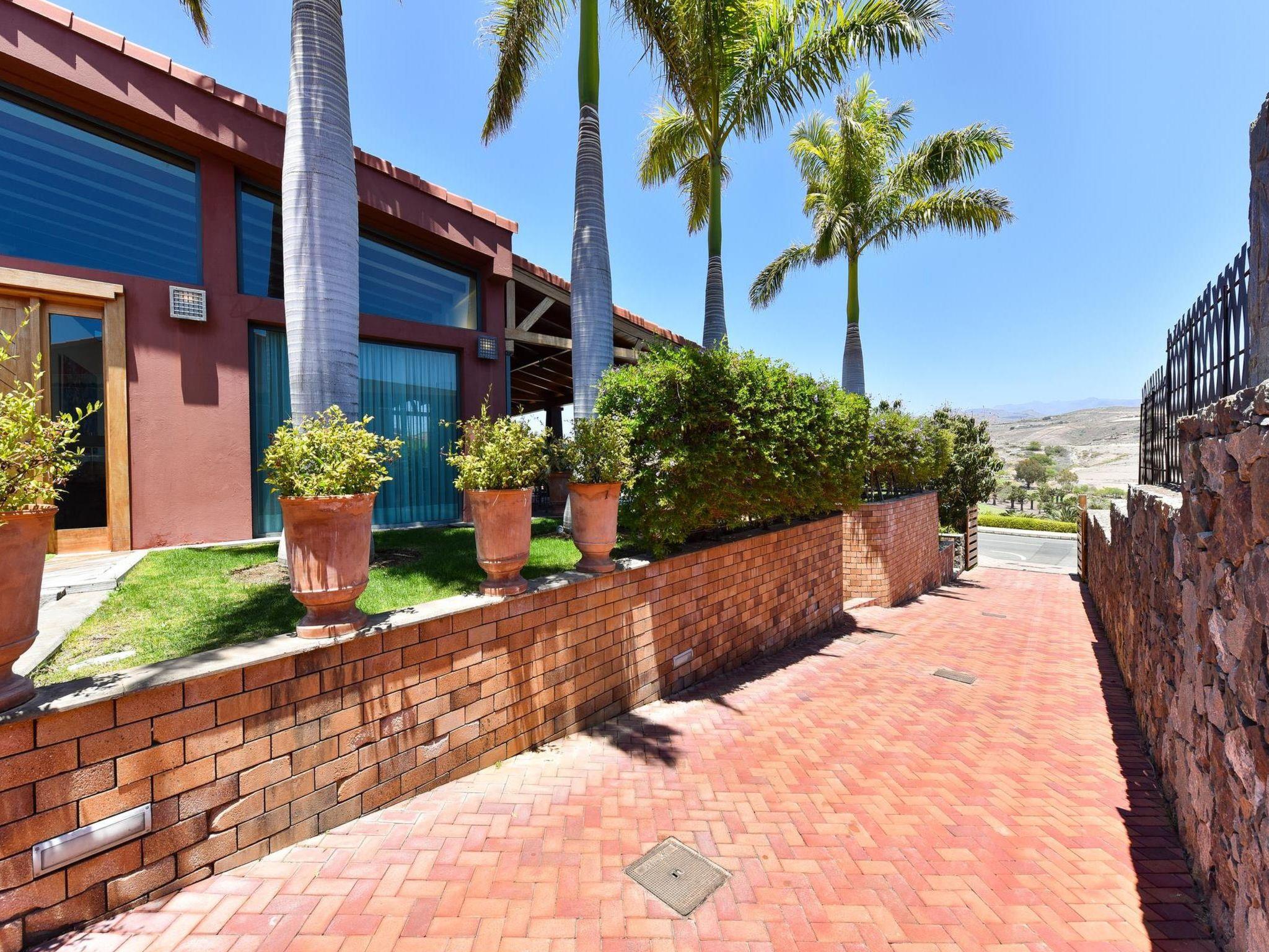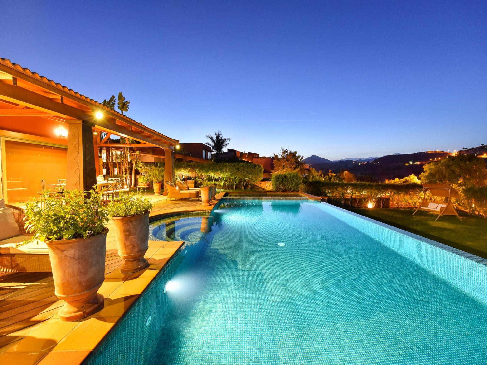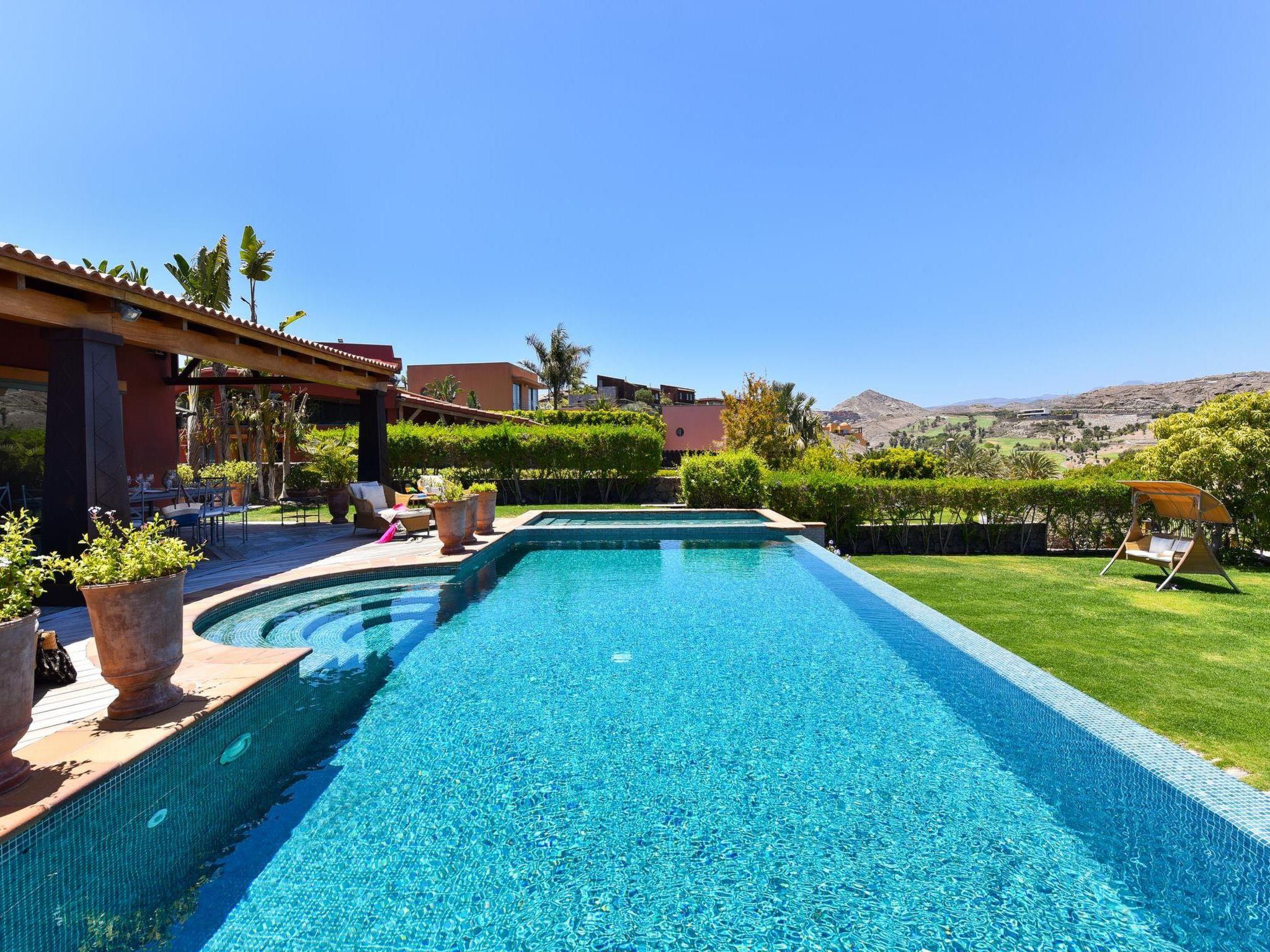 Large, modern villa "Canela". In the district of Maspalomas, in the centre of Salobre Golf Resort, outside the resort Meloneras, in a quiet, sunny, elevated position. For shared use: property 1'000 m2 (fenced), garden, lawn for sunbathing. Private: property 1'000 m2 (fenced), garden, lawn for sunbathing, swimming pool (10 x 5 m, seasonal availability: 01.Jan. - 31.Dec.). Paddling pool, outdoor shower, barbecue. In the house: WiFi, central heating system, air conditioning, washing machine, tumble dryer. Parking at the house. Shop, grocery 200 m, supermarket 3 km, restaurant 200 m, bus stop "Las Crucitas" 19 km, sandy beach "3000". Golf course (18 hole) 100 m. Please note: car recommended. Suitable for families, suitable for seniors baby equipment on request. The owner does not accept any youth groups. Motorway 1 km from the property. Main road 50 m from the property. Neighbourhood highly sensitive to noise. Quietness and good behaviour expected.