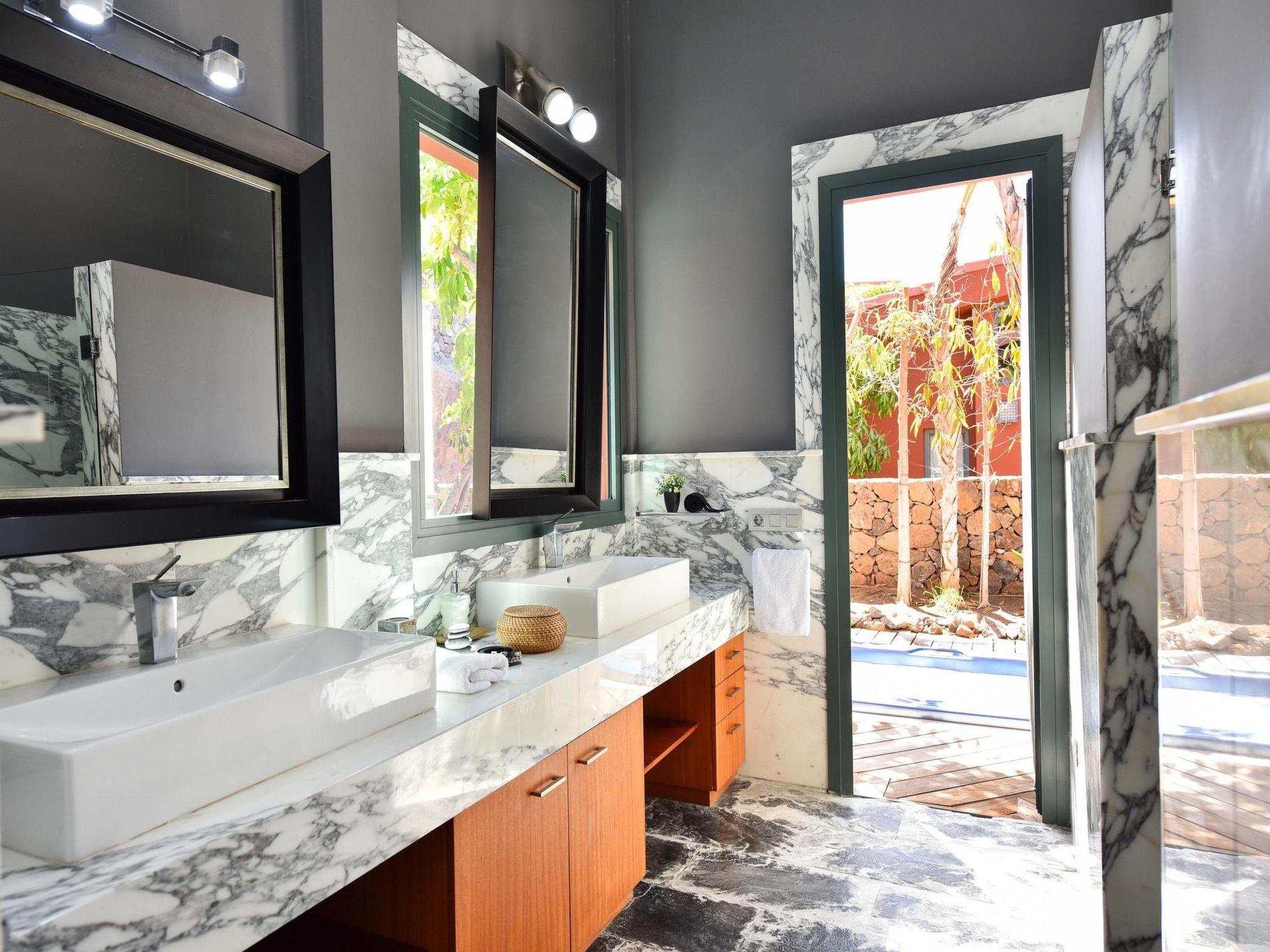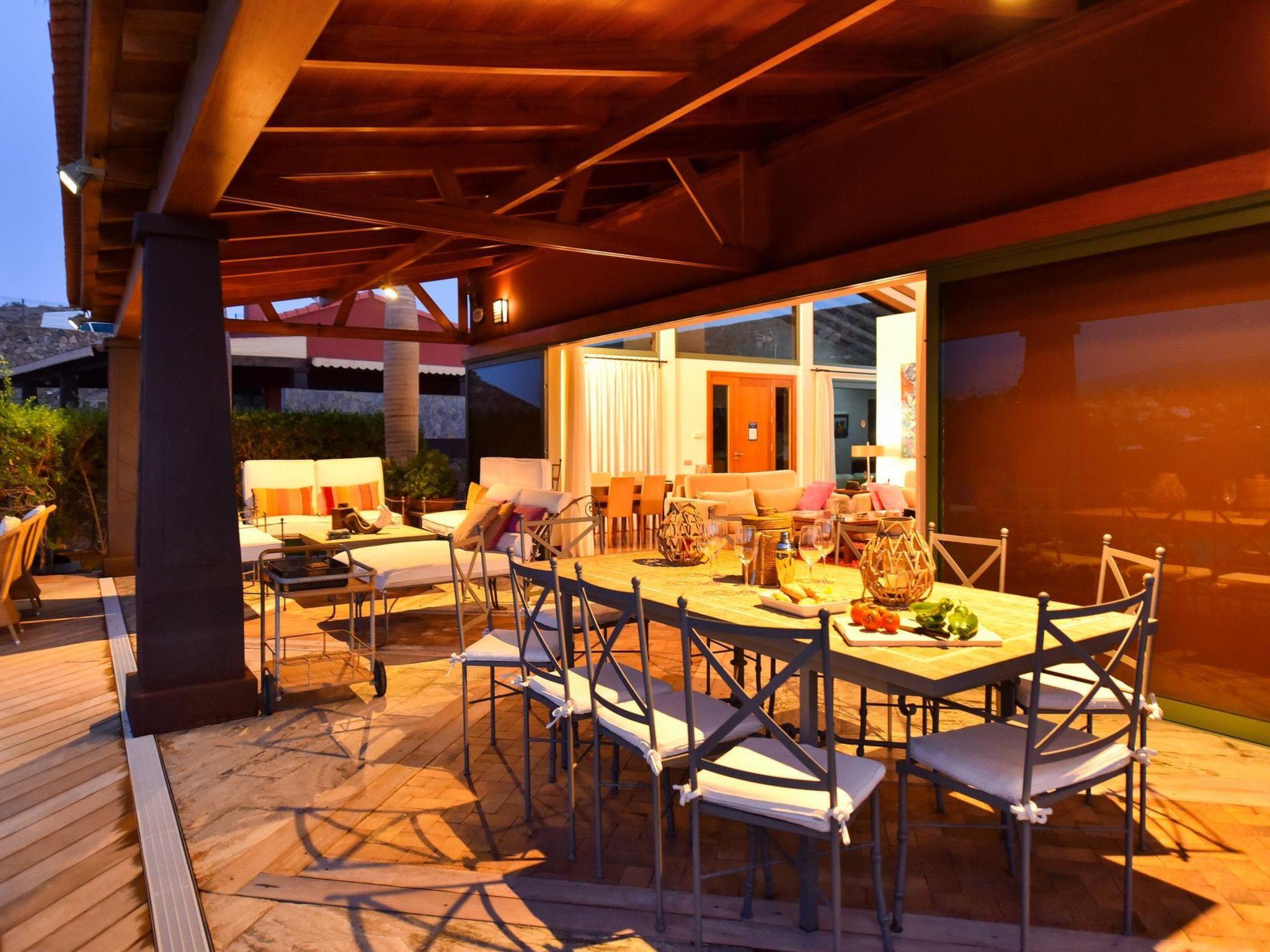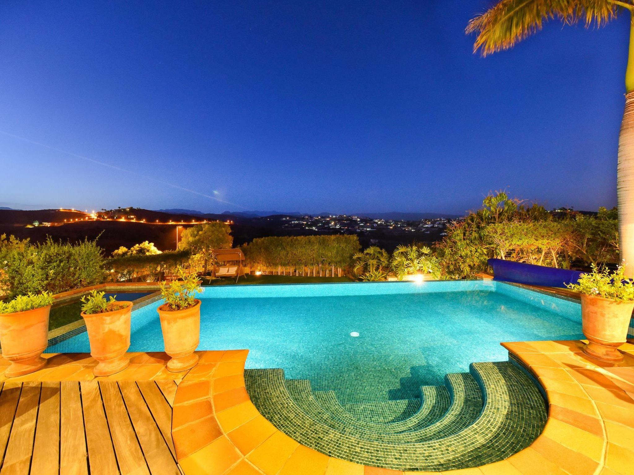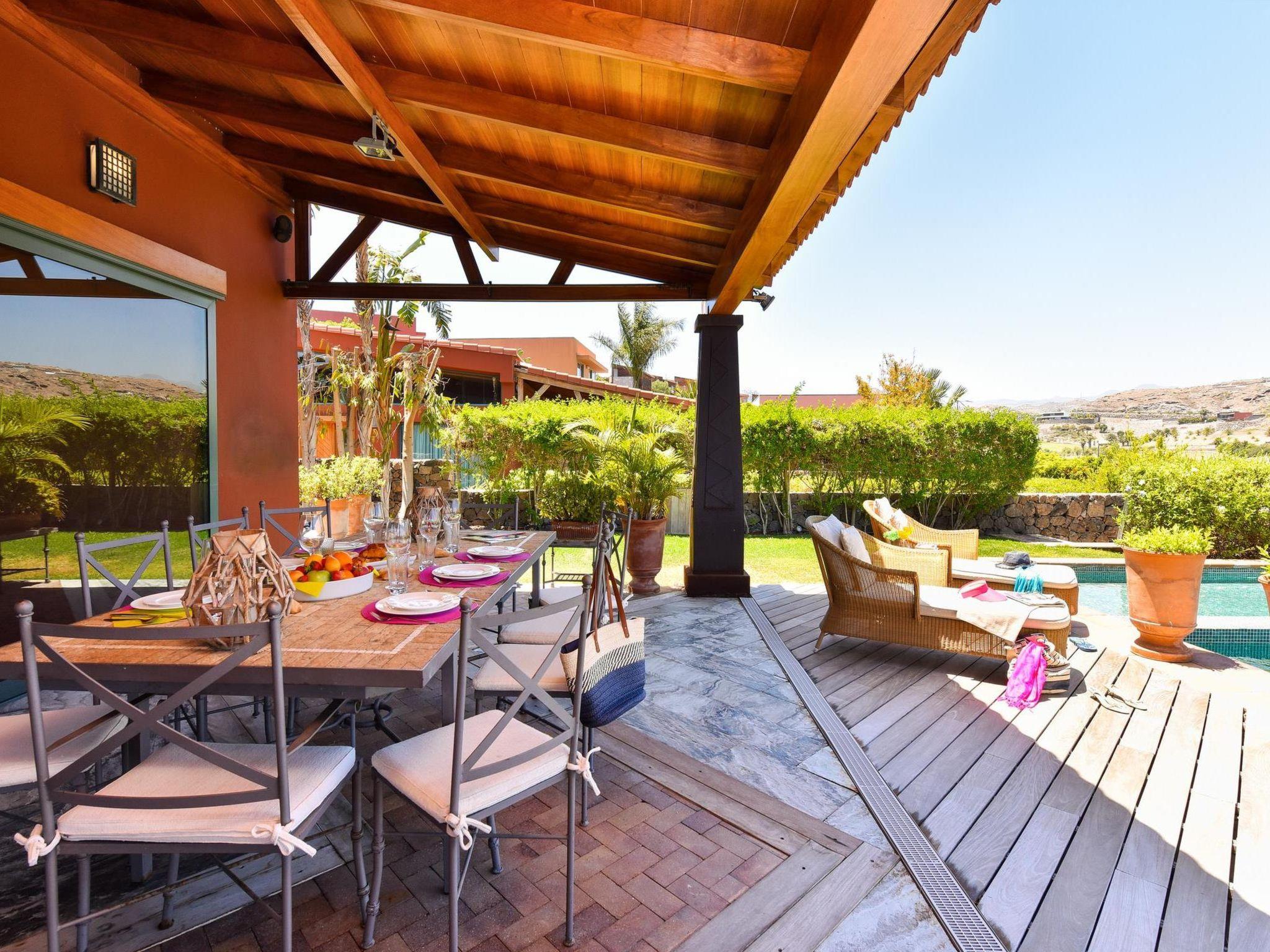Large, modern villa "Canela". In the district of Maspalomas, in the centre of Salobre Golf Resort, outside the resort Meloneras, in a quiet, sunny, elevated position. For shared use: property 1'000 m2 (fenced), garden, lawn for sunbathing. Private: property 1'000 m2 (fenced), garden, lawn for sunbathing, swimming pool (10 x 5 m, seasonal availability: 01.Jan. - 31.Dec.). Paddling pool, outdoor shower, barbecue. In the house: WiFi, central heating system, air conditioning, washing machine, tumble dryer. Parking at the house. Shop, grocery 200 m, supermarket 3 km, restaurant 200 m, bus stop "Las Crucitas" 19 km, sandy beach "3000". Golf course (18 hole) 100 m. Please note: car recommended. Suitable for families, suitable for seniors baby equipment on request. The owner does not accept any youth groups. Motorway 1 km from the property. Main road 50 m from the property. Neighbourhood highly sensitive to noise. Quietness and good behaviour expected.