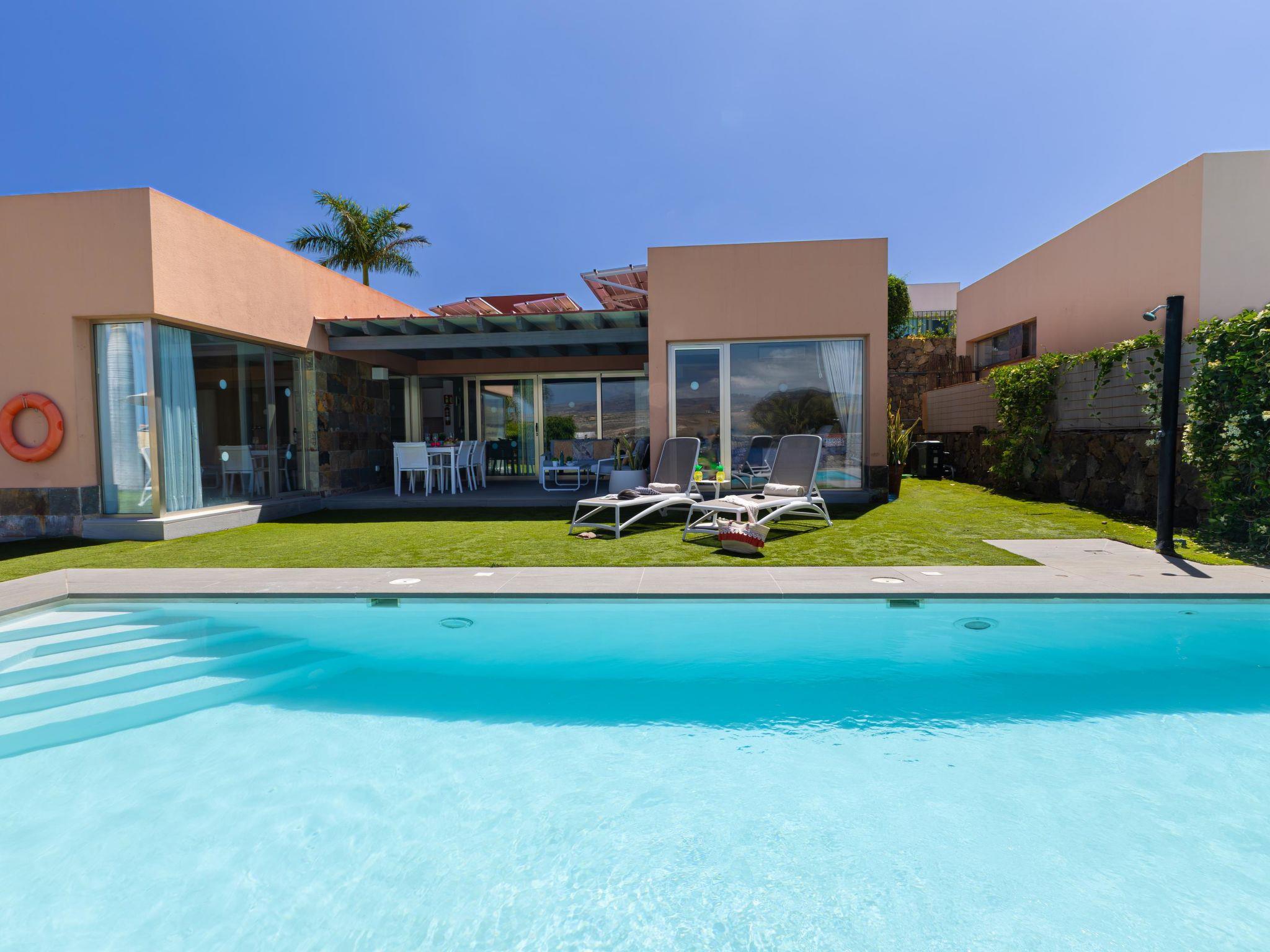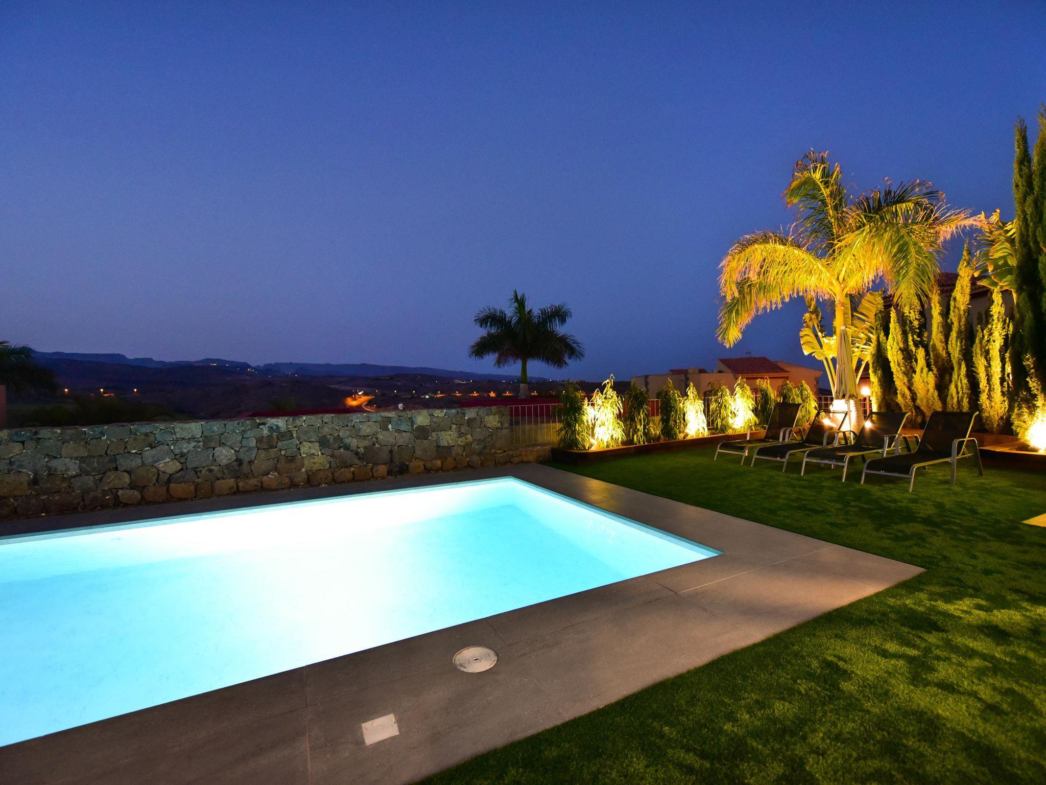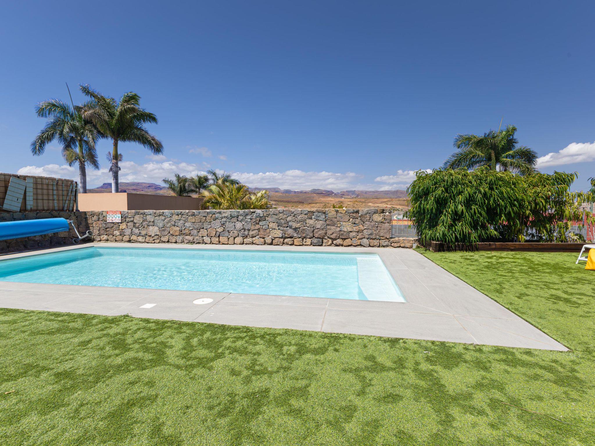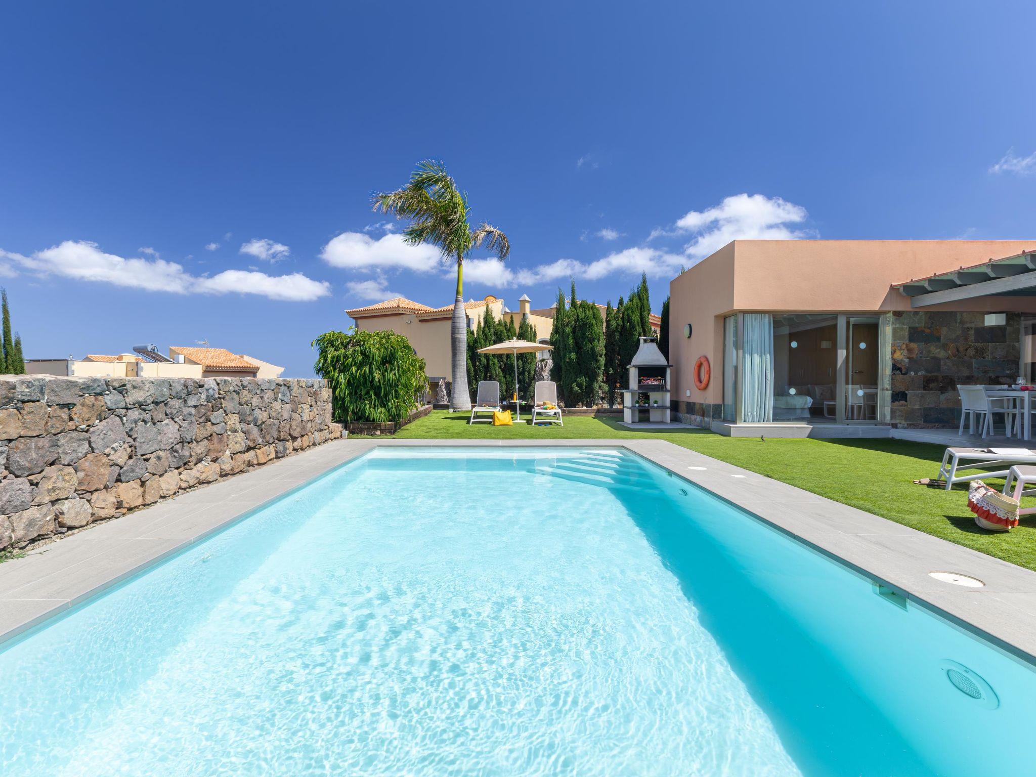 Modern, comfortable villa "Par4 Villa 8". In the centre of Salobre Golf Resort Maspalomas 5 km Meloneras 7 km, in a quiet, sunny, elevated position in the residential district. Private: property 380 m2 (fenced), garden 80 m2, lawn for sunbathing, swimming pool (8 x 4 m, depth 140 cm, seasonal availability: 01.Jan. - 31.Dec.). Garden furniture, barbecue. In the house: air conditioning, laundry, washing machine. Shop 4 km, shopping centre 1 km, restaurant 200 m, bus stop "Las Crucitas" 19 km, sandy beach "3000". Please note: car recommended. Baby equipment on request. The owner does not accept any youth groups. Airfield 25 km from the property.